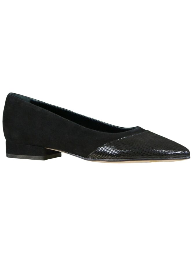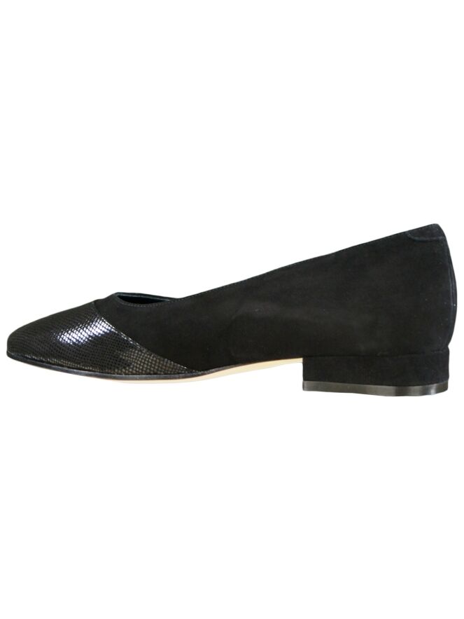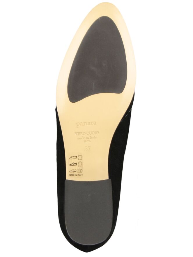 Schwarzer Ballerina der Designerschuhmarke Panara. Die schwarze Schuhspitze ist mit einem zarten Waffelmuster in Leder gesäumt. Der Absatz ist mit demselben Wildleder wie der Ballerina versehen, der über ein Innenfutter aus Leder verfügt.