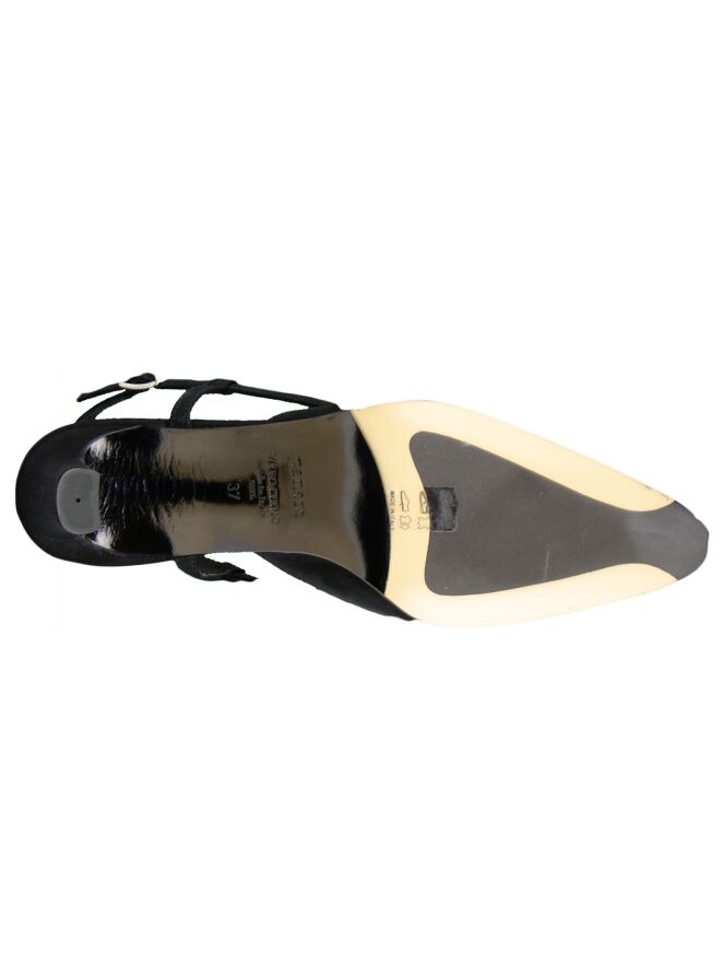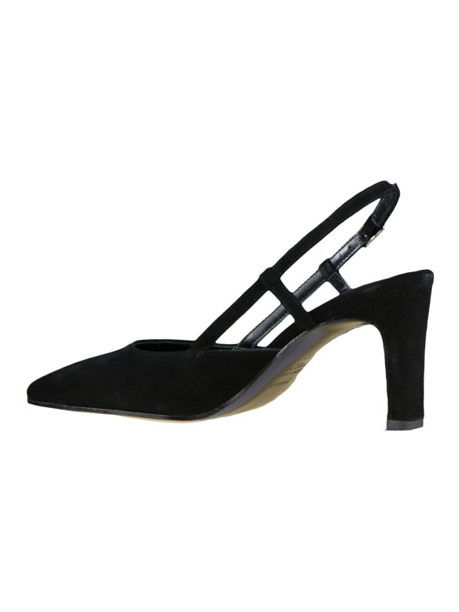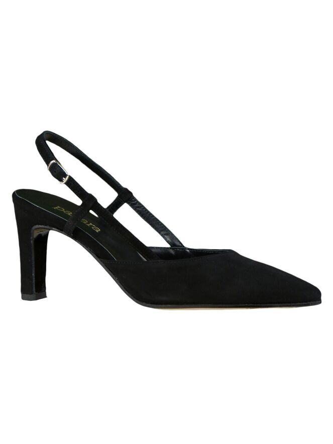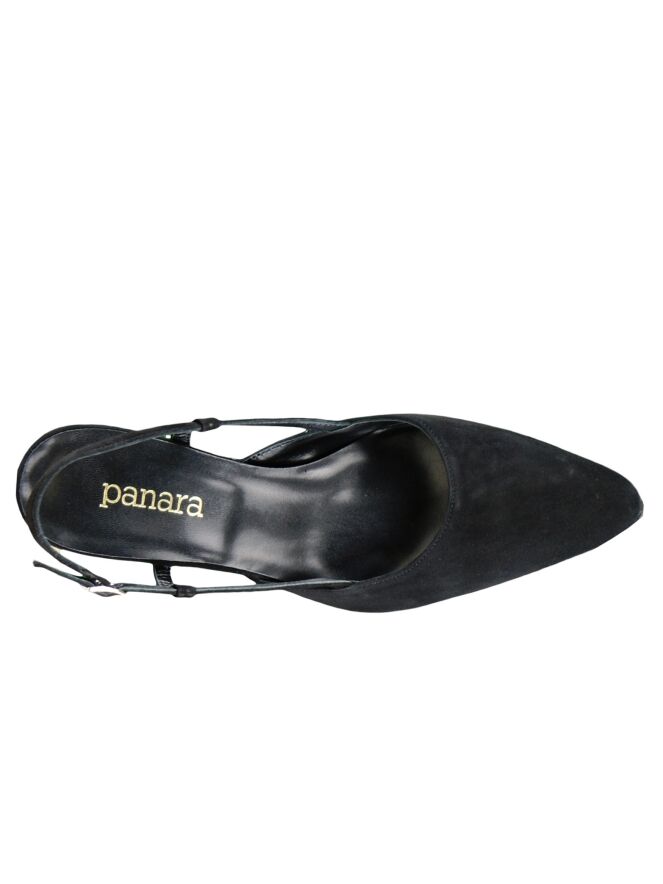 Schwarze Pumps der Damenschuhmarke Panara mit einer offenen Ferse. Die Schuhspitze des Pumps ist schmal, und auch der Absatz, der ausdemselben Material wie der Pumps besteht, ist elegant. Das verstellbare Fersenriemchen ist auf beiden Seiten des Pumps sichtbar befestigt.
