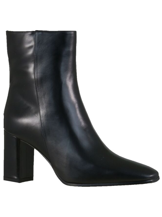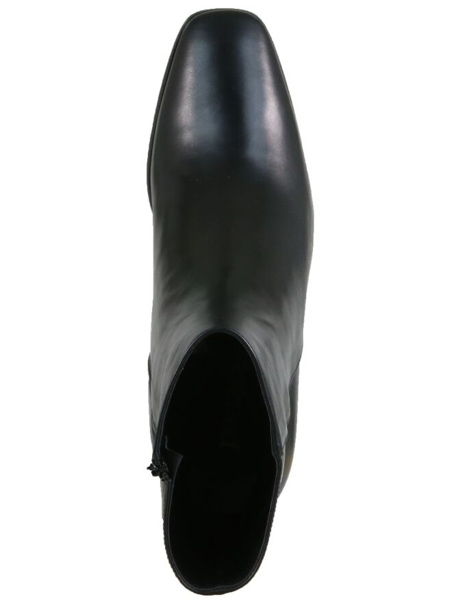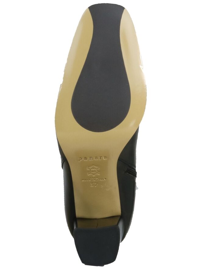 Schwarze Nappaleder-Stiefelette der Schuhmarke Panara. Die Stiefelette kommt mit einer quadratischen Schuhspitze und einem Blockabsatz. Die Schafthöhe beträgt ab der Ferse 15 cm, der Umfang misst 27 cm. Die Stiefelette hat ein Innenfutter aus Leder.