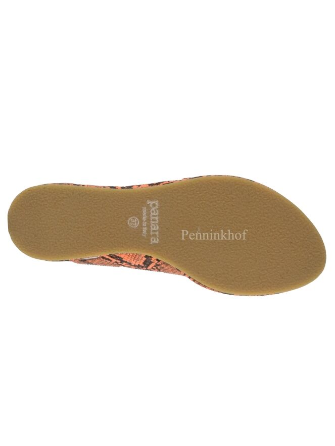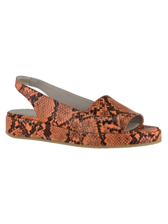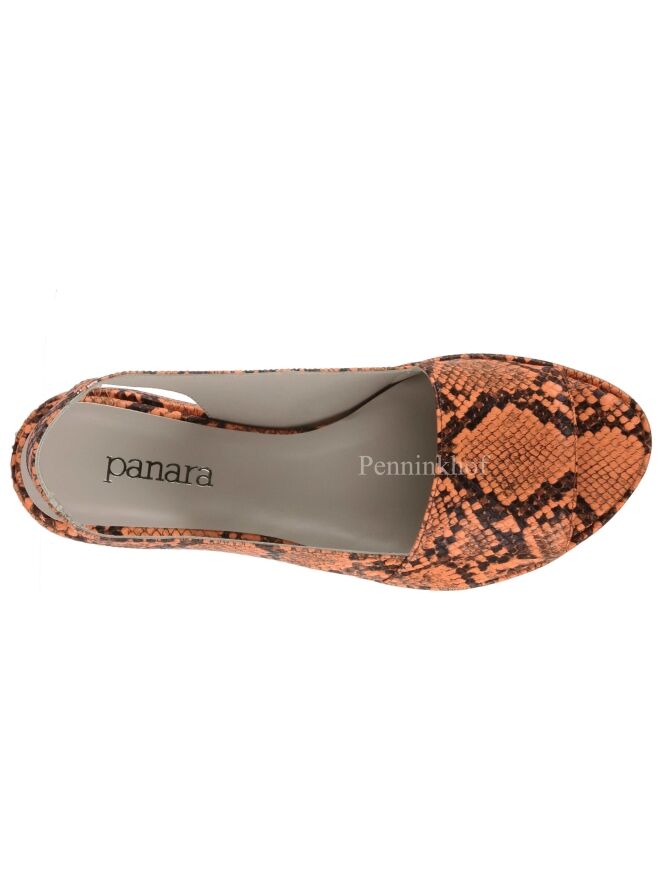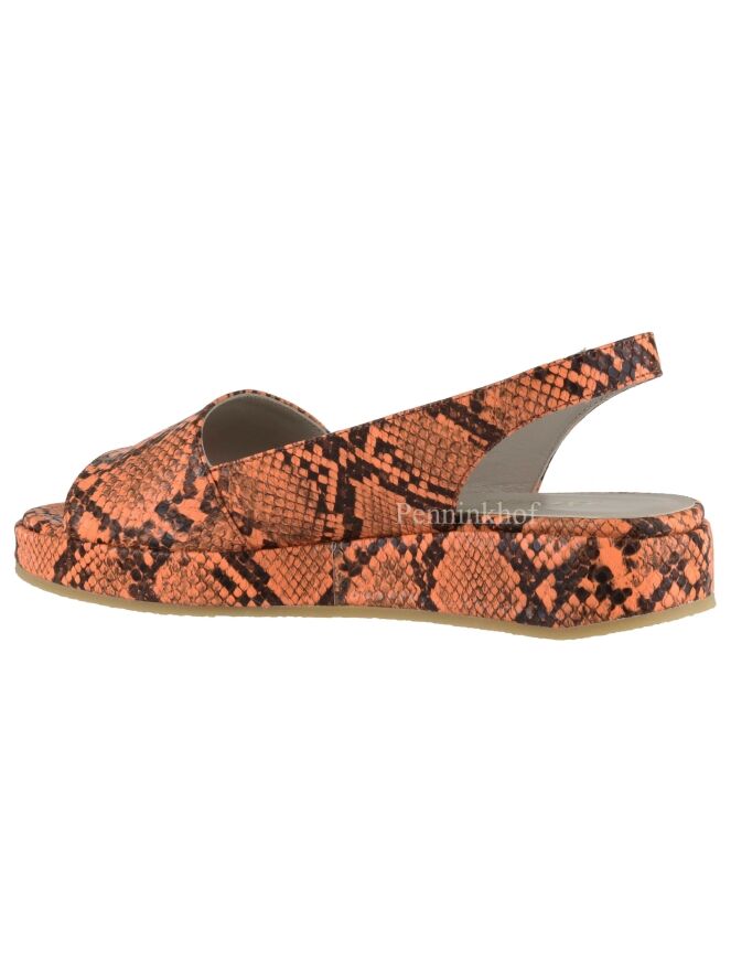 Eine Sandalette der Designermarke Panara mit Python-Druck in Schwarz und Orange. Die Sandale hat ein Fersenriemchen. Das Innenfutter ist aus Leder.