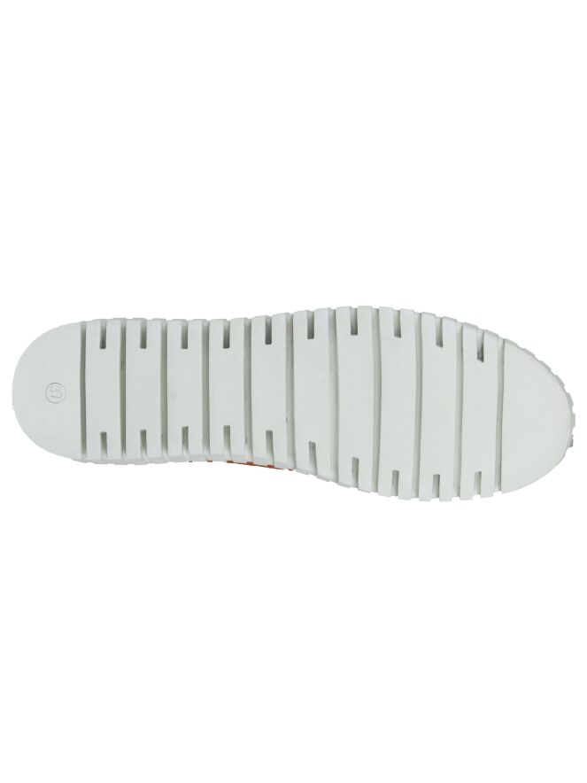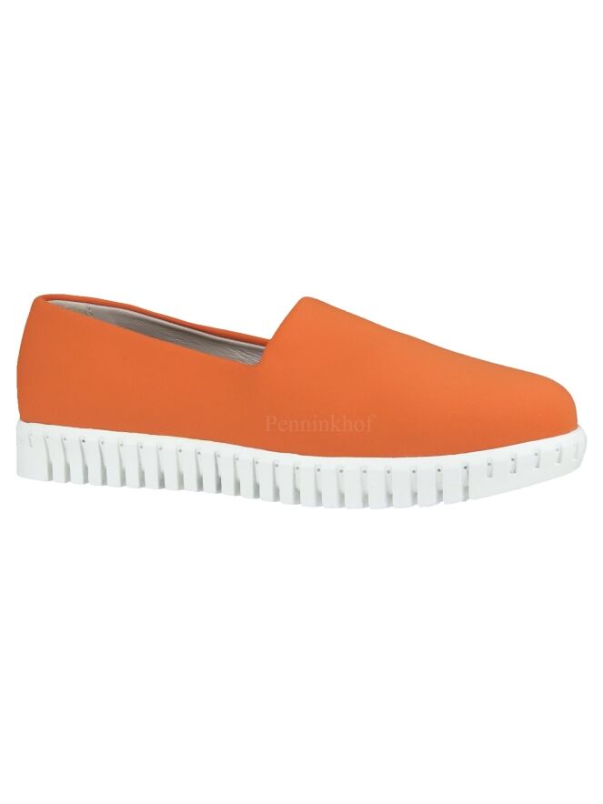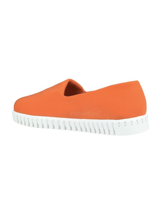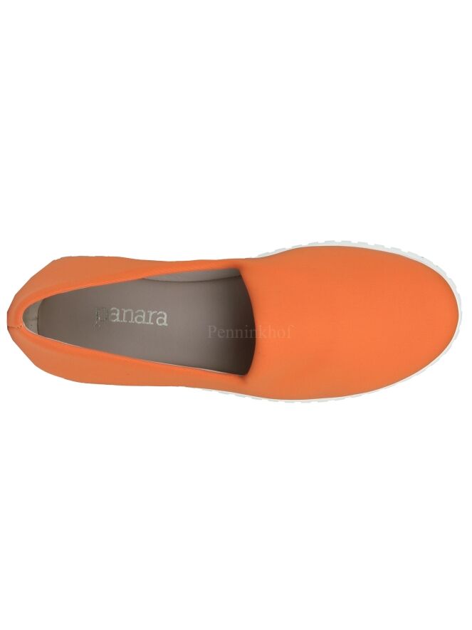 Ein Slipper der Schuhmarke Panara in Orange. Das Gewebe ist elastisch und passt sich dem Fuß wunderbar an. Die weiße Sohle ist grob gezackt.