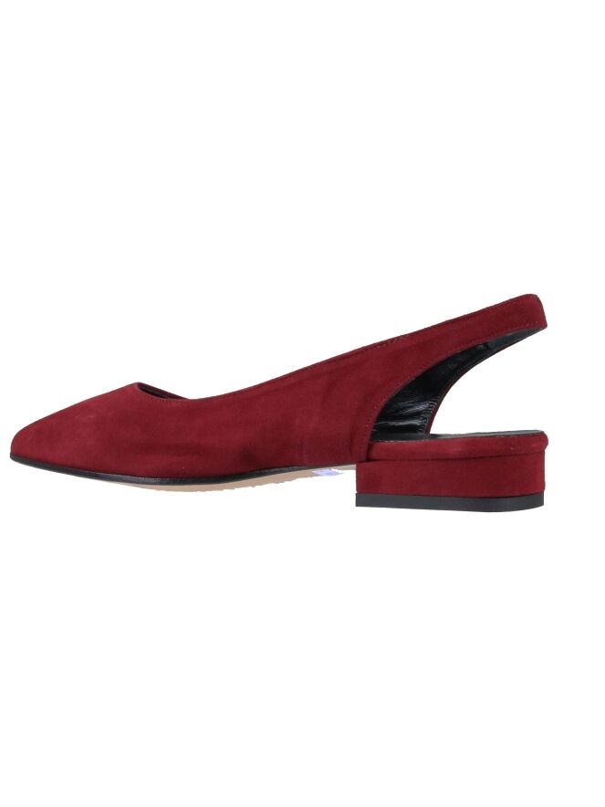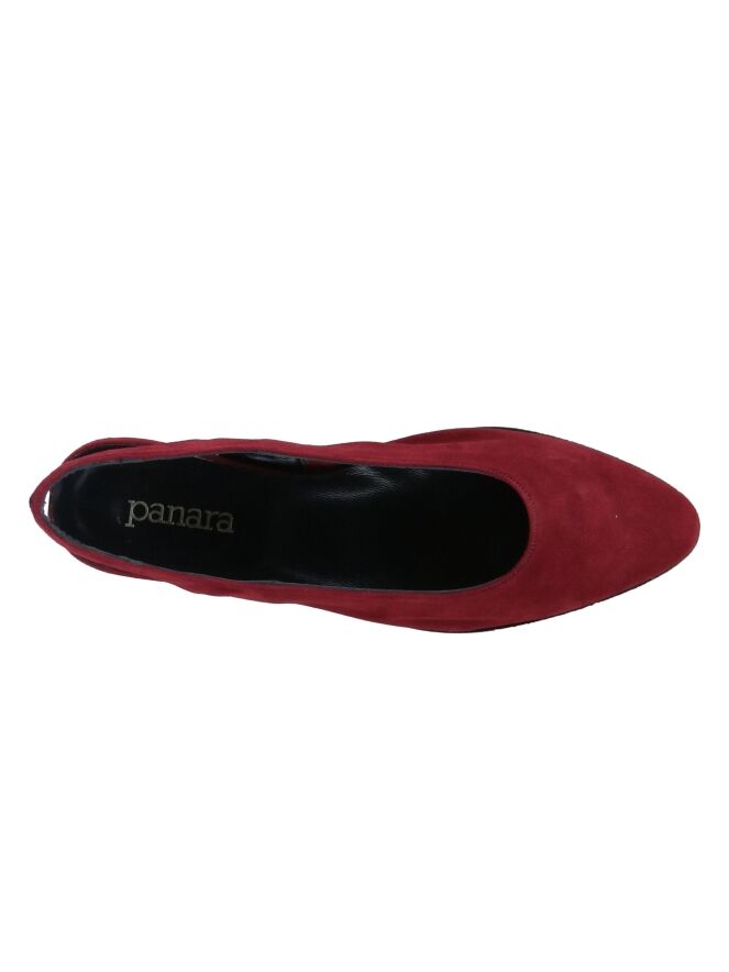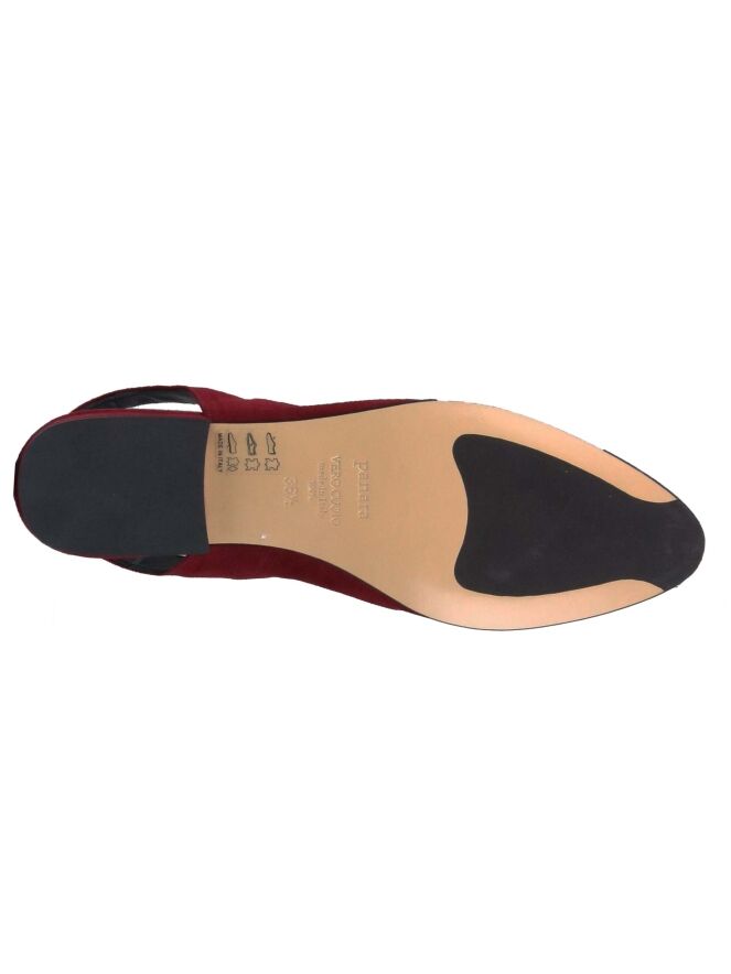 Beaujolaisroter Halbschuh mit offener Ferse der Damenschuhmarke Panara. Der Slipper ist vorn abgerundet. Der Absatz ist mit demselben Material wie der Schuh überzogen. Der Halbschuh hat ein Innenfutter aus Leder.