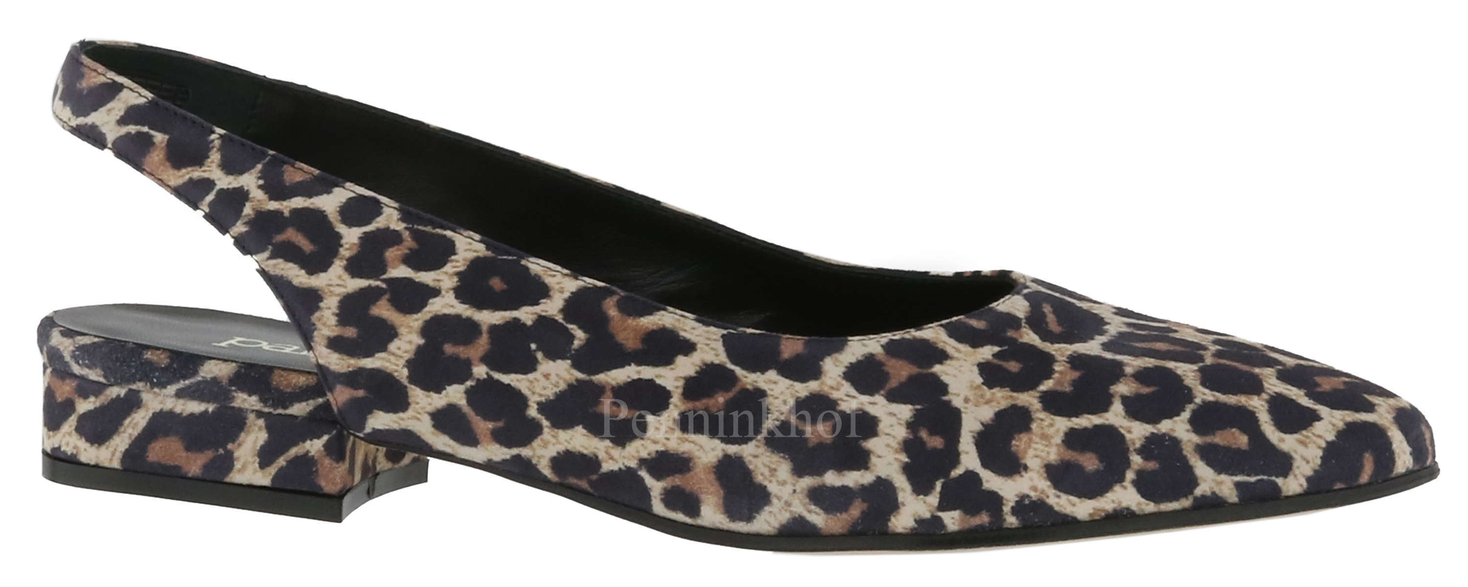Ein Slipper mit offenem Absatz der Schuhmarke Panara mit Leopardenprint in Camel, Schwarz und verschiedenen Taupe-Tönen. Der Slipper ist vorn abgerundet. Der Absatz ist mit dem gleichen Material wie der Schuh bezogen. Die Innenseite des Slippers ist mit Leder ausgekleidet.