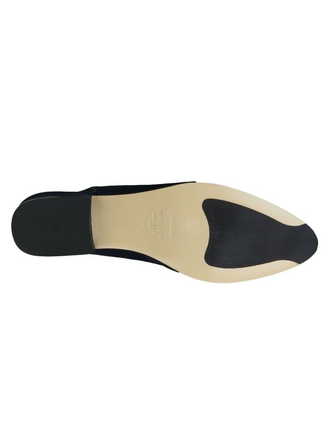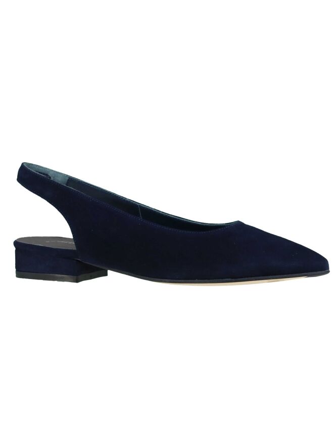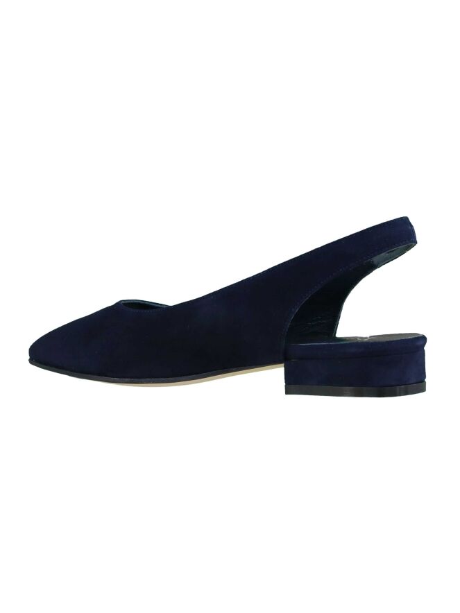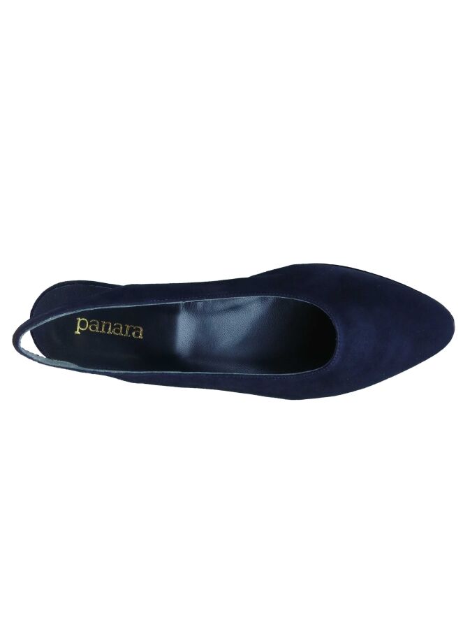 Marineblauer Halbschuh der Damenschuhmarke Panara mit offener Ferse. Der Schuh ist vorn abgerundet, und der Absatz besteht aus demselben Material wie der Halbschuh. Der Halbschuh hat ein Innenfutter aus Leder.