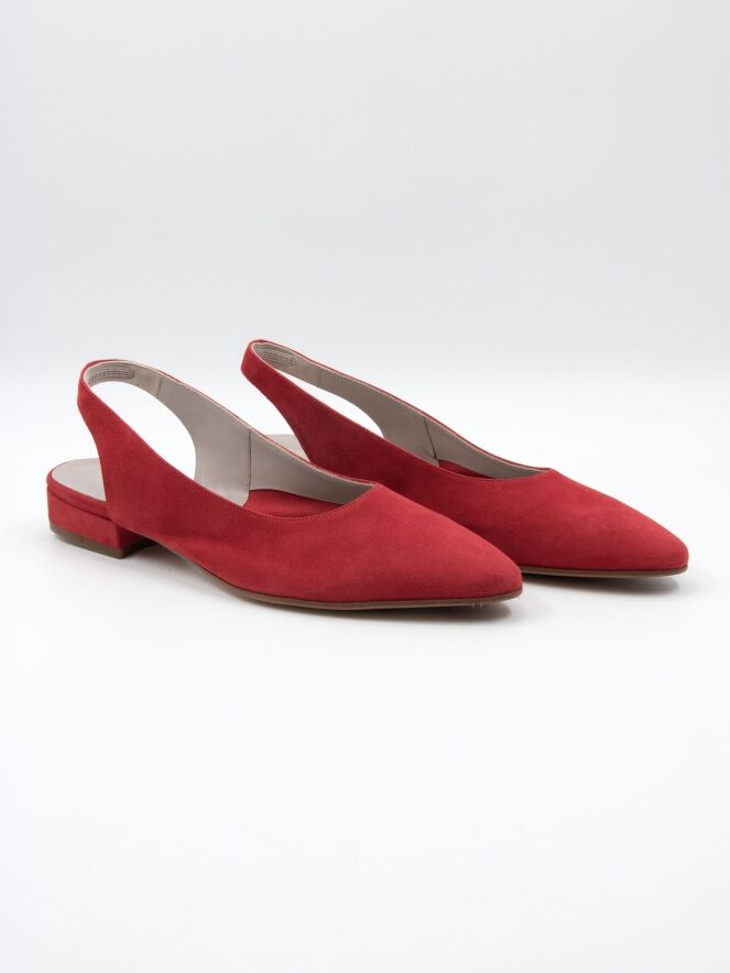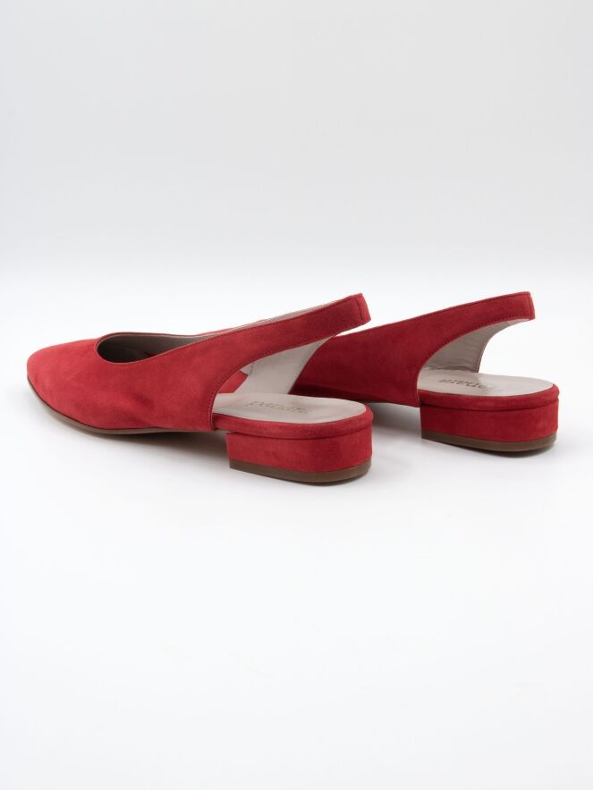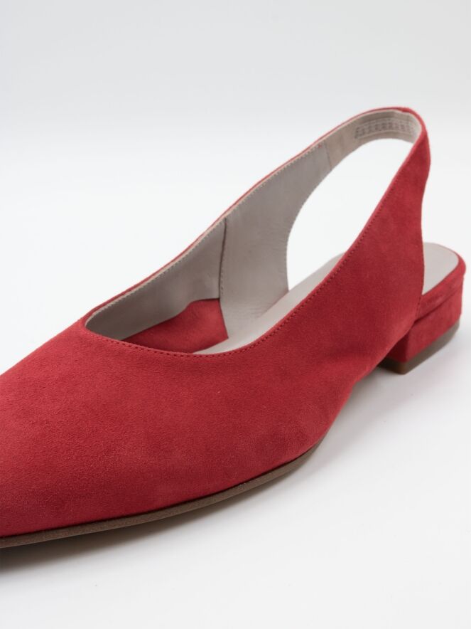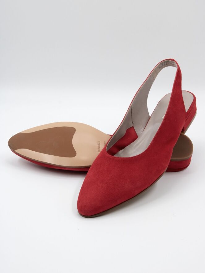 Ein Slipper mit offener Ferse von Panara in kräftigem Rot. Der Slipper hat eine runde Kappe, und der Absatz ist mit demselben Material wie der Schuh bezogen. Innen ist der Schuh mit Leder gefüttert.