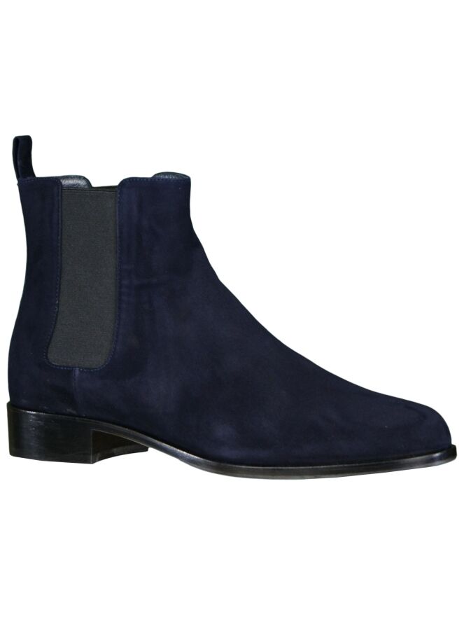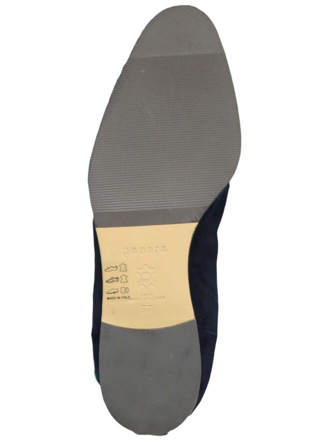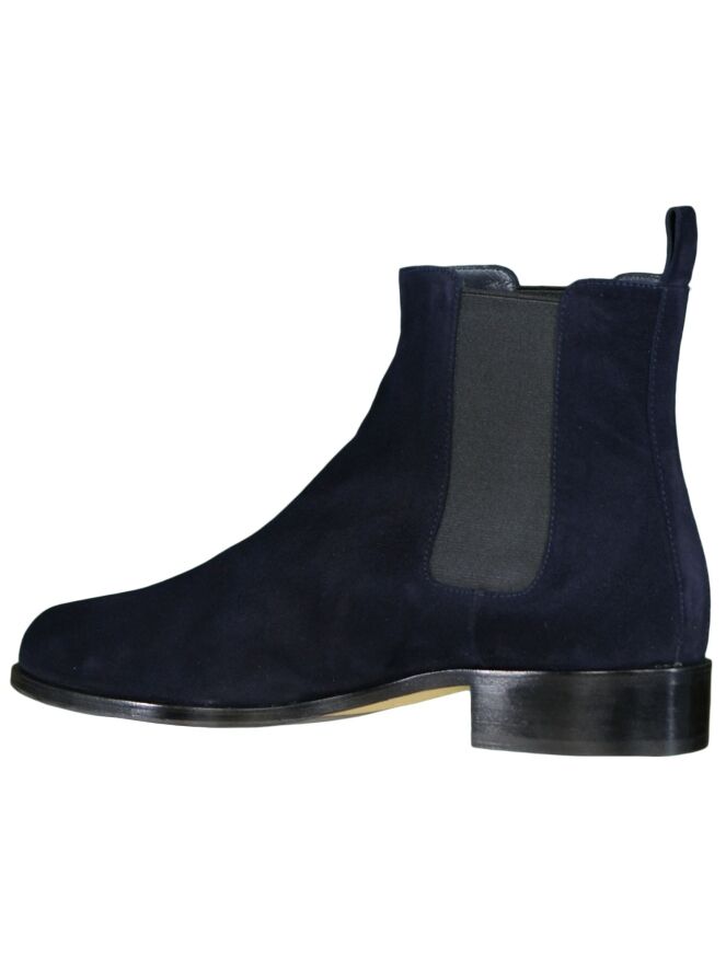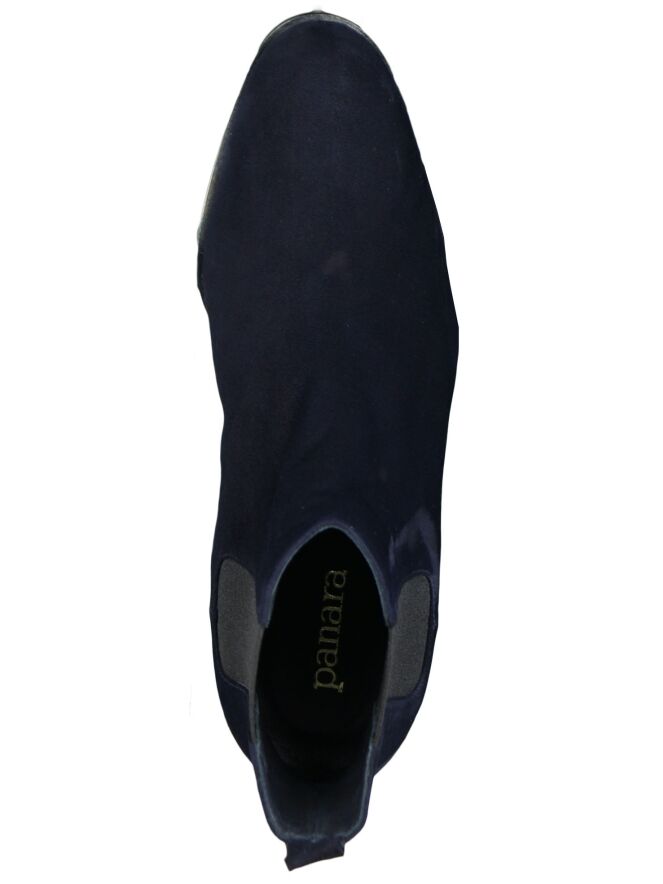 Kurze Stiefelette der Designerschuhmarke Panara in der Farbe Marineblau mit einer abgerundeten Schuhspitze. An beiden Seiten des Schaftes befindet sich ein elastischer Einsatz. Das Innenfutter der Stiefelette ist aus Leder.