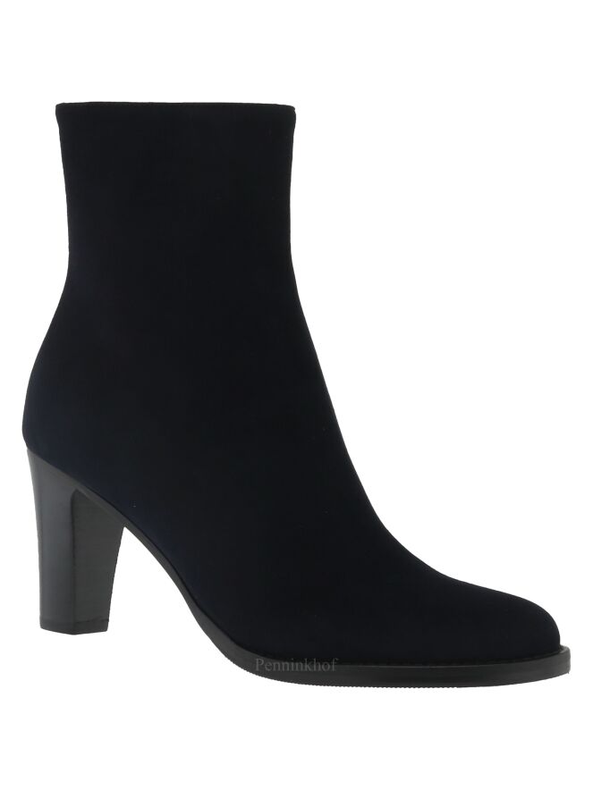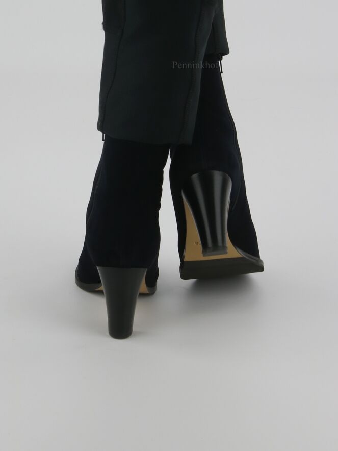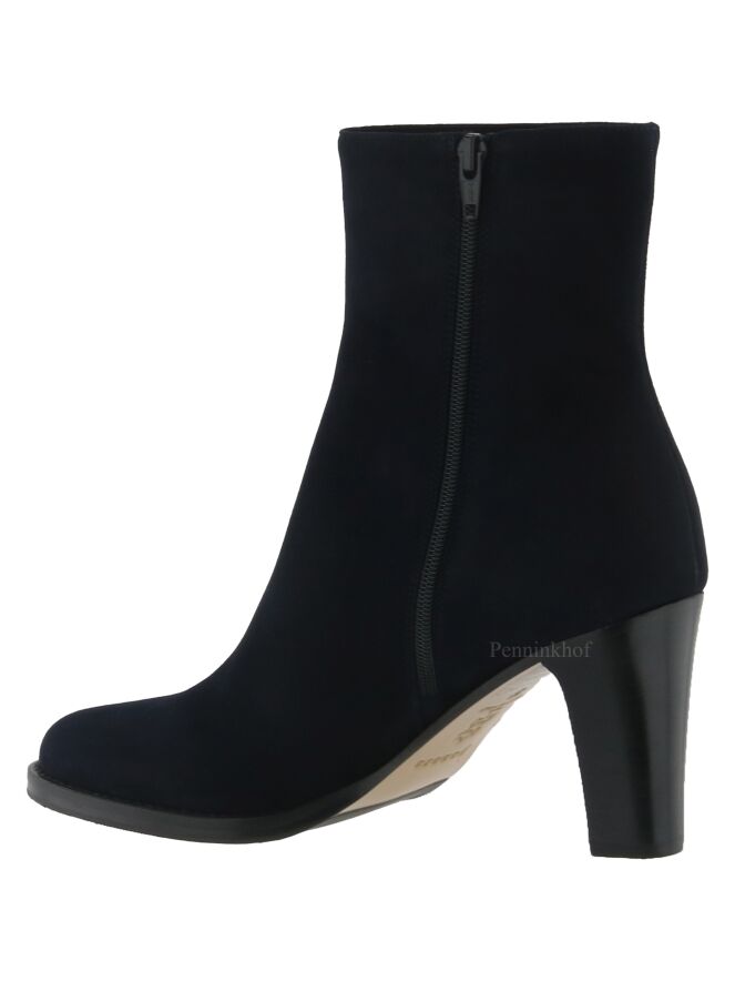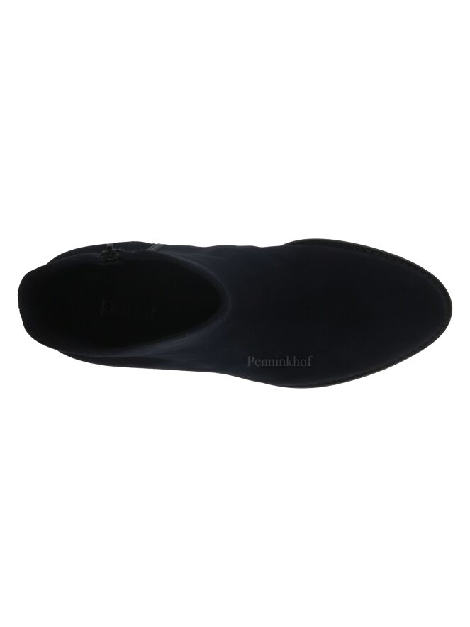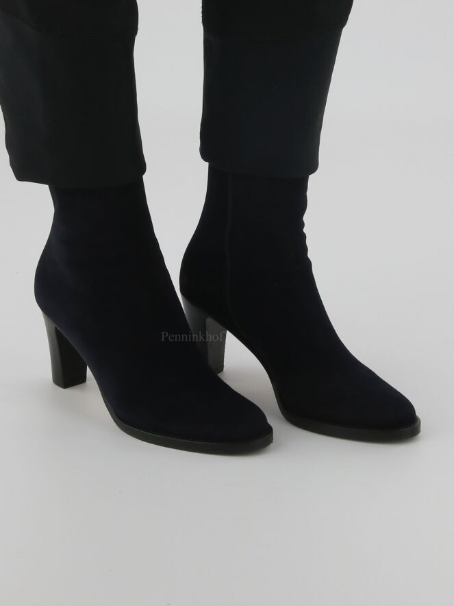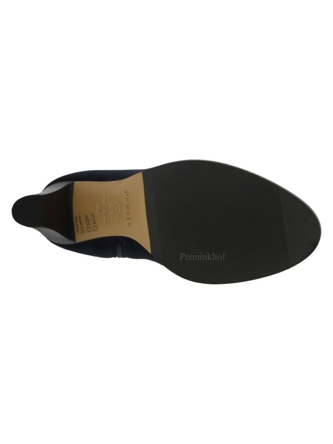 Eine marineblaue Stiefelette der Schuhmarke Panara. Der Stiefel ist vorne abgerundet. Der Absatz ist in einem neutralen Schwarz gehalten. Die Innenseite der Stiefelette ist mit Leder gefüttert.