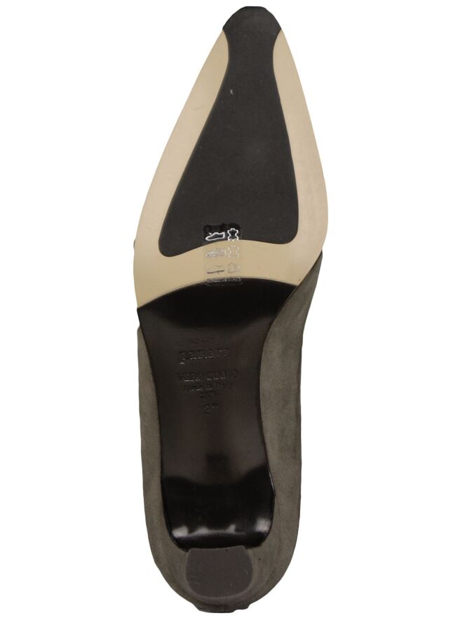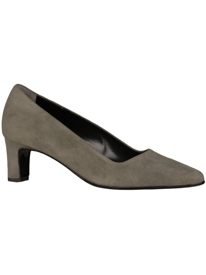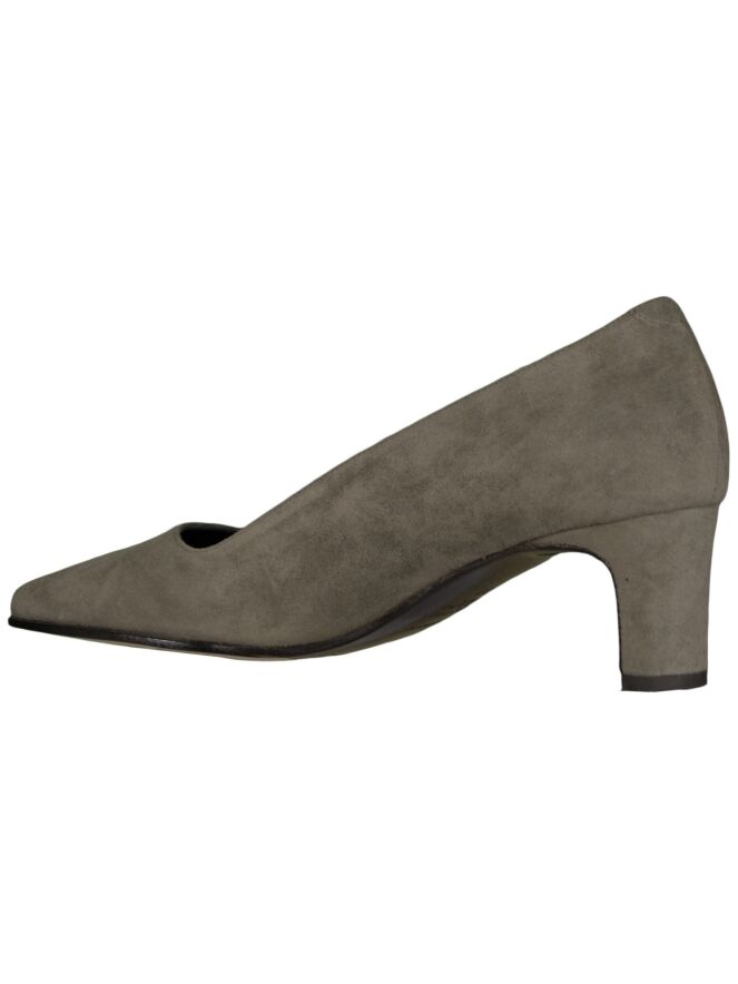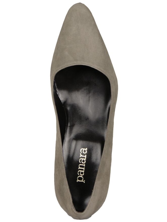 Pumps der Damenschuhmarke Panara in Taupe. Die Schuhspitze des Pumps ist schmal, und auch der Absatz, der ausdemselben Material wie der Pumps besteht, ist schmal und elegant. Der Pumps hat ein Innenfutter aus Leder.