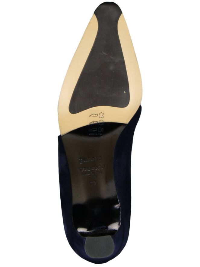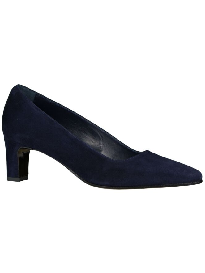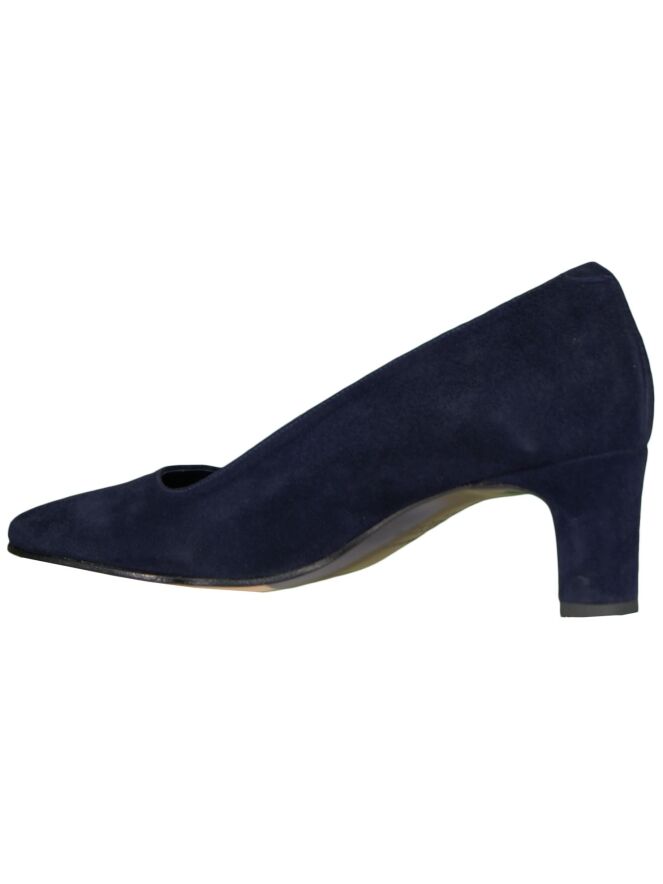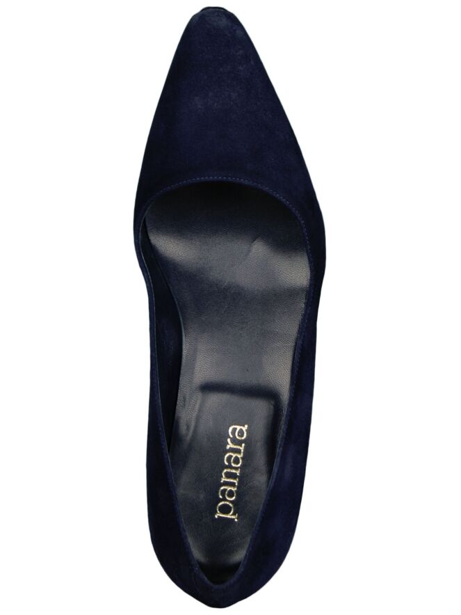 Marineblauer Pumps der Damenschuhmarke Panara. Die Schuhspitze des Pumps ist schmal, und auch der Absatz, der ausdemselben Material wie der Pumps besteht, ist schmal und elegant. Der Pumps hat ein Innenfutter aus Leder.