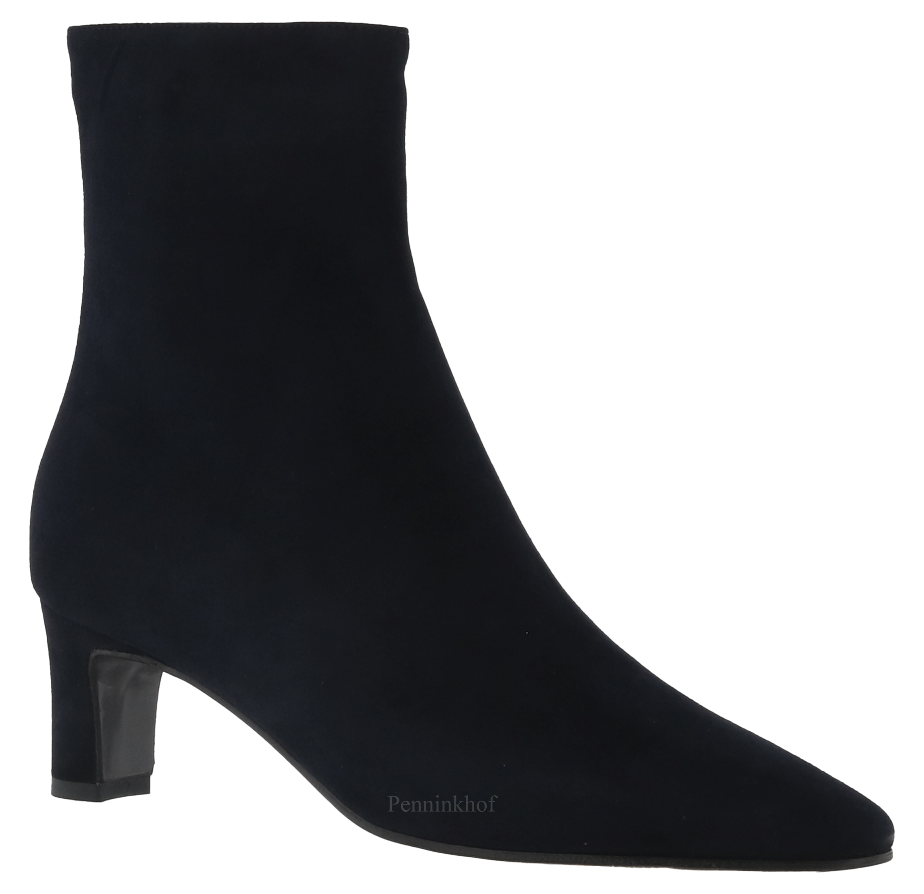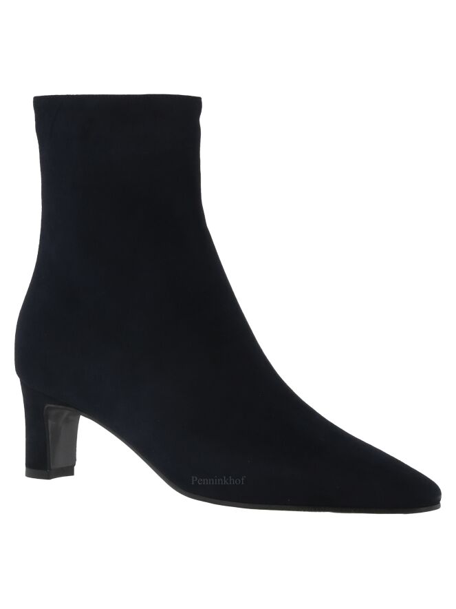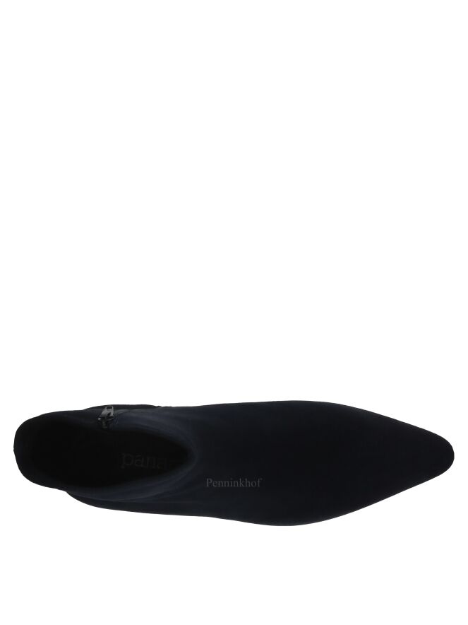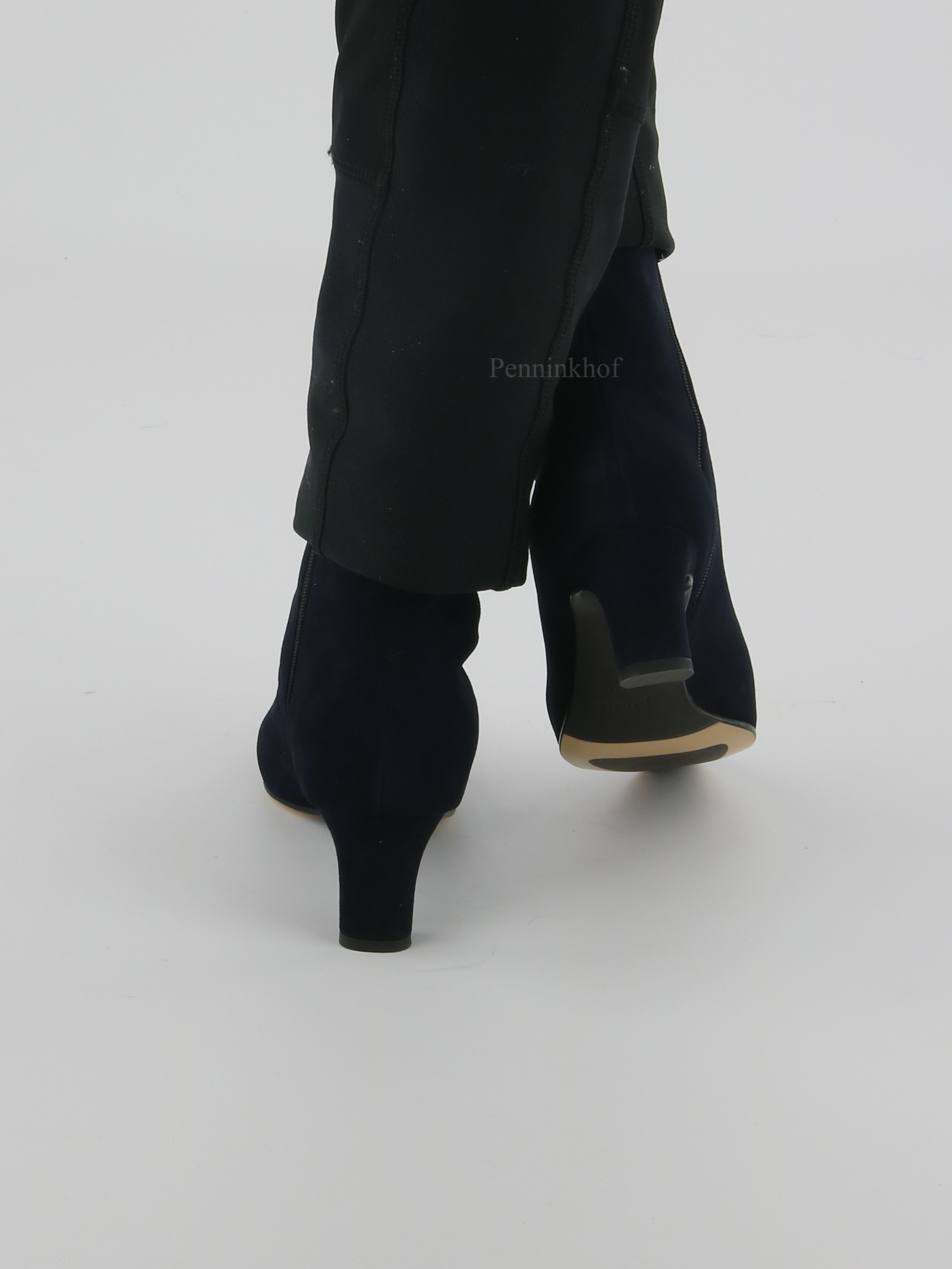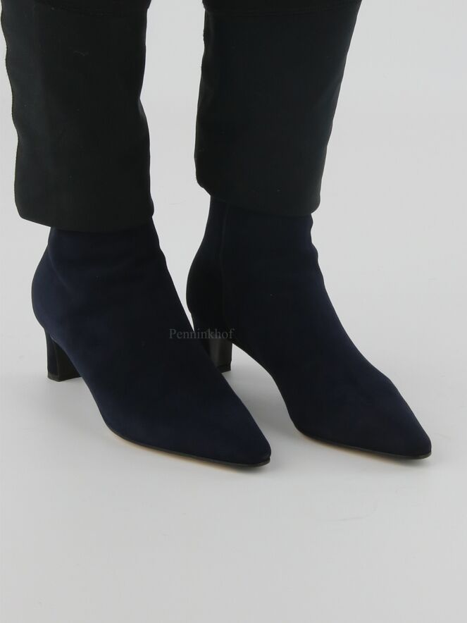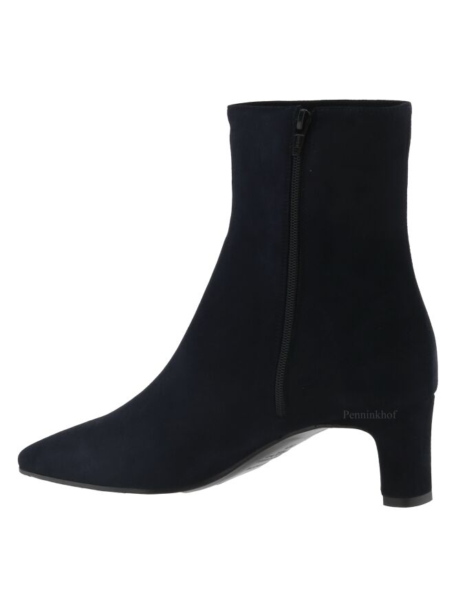Eine marineblaue kurze Stiefelette der Schuhmarke Panara aus weichem Camoscio-Wildleder. Die Schuhspitze ist schmal. An der Schaftinnenseite befindet sich ein Reißverschluss. Die Innenseite der Stiefelette ist mit Leder ausgekleidet.