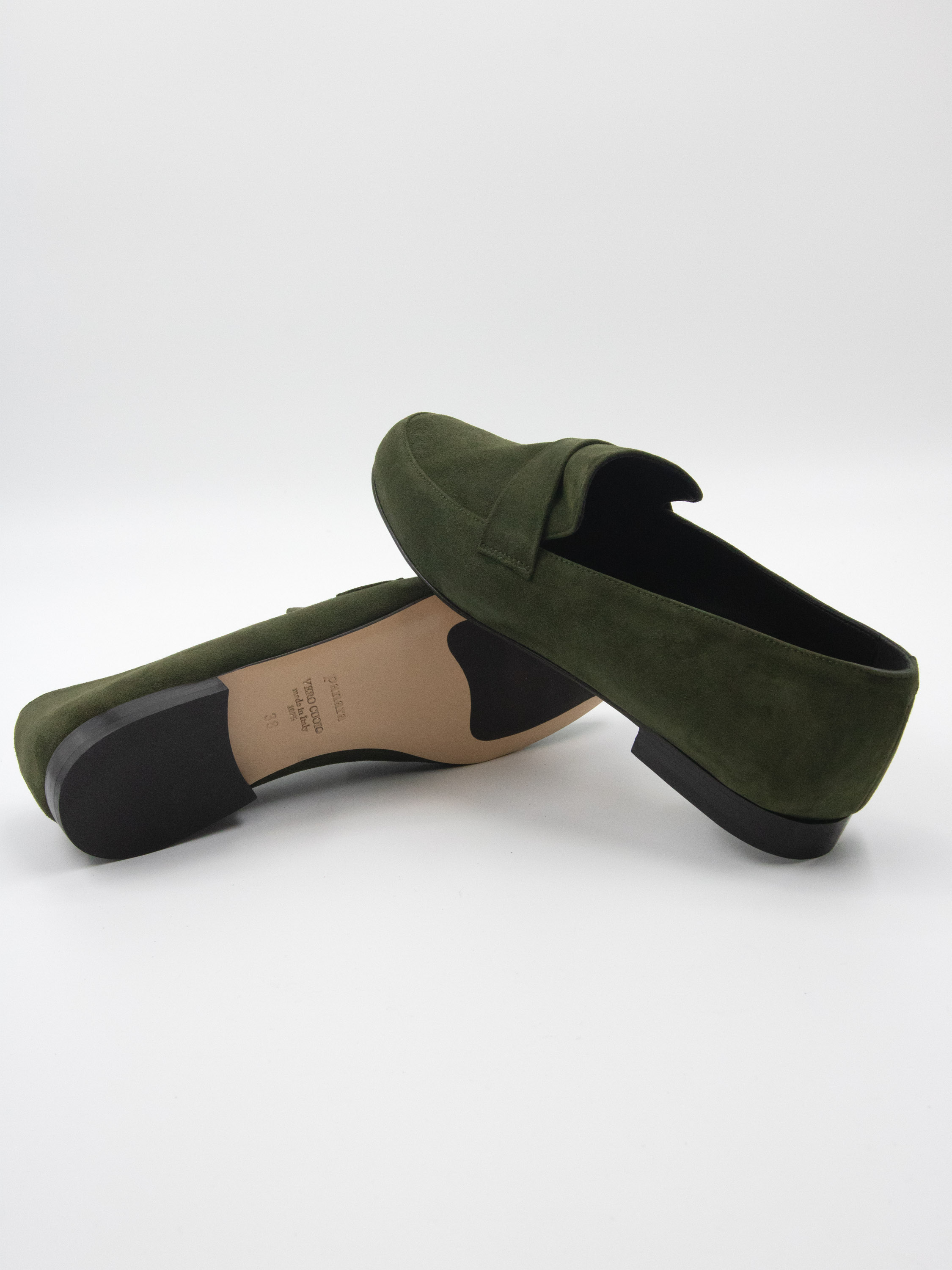 Slipper von Panara in Olivgrün. Über dem abgerundeten Vorderfuß verläuft ein schmaler Riemen aus demselben Material wie der Schuh. Das Innere ist mit Leder gefüttert.