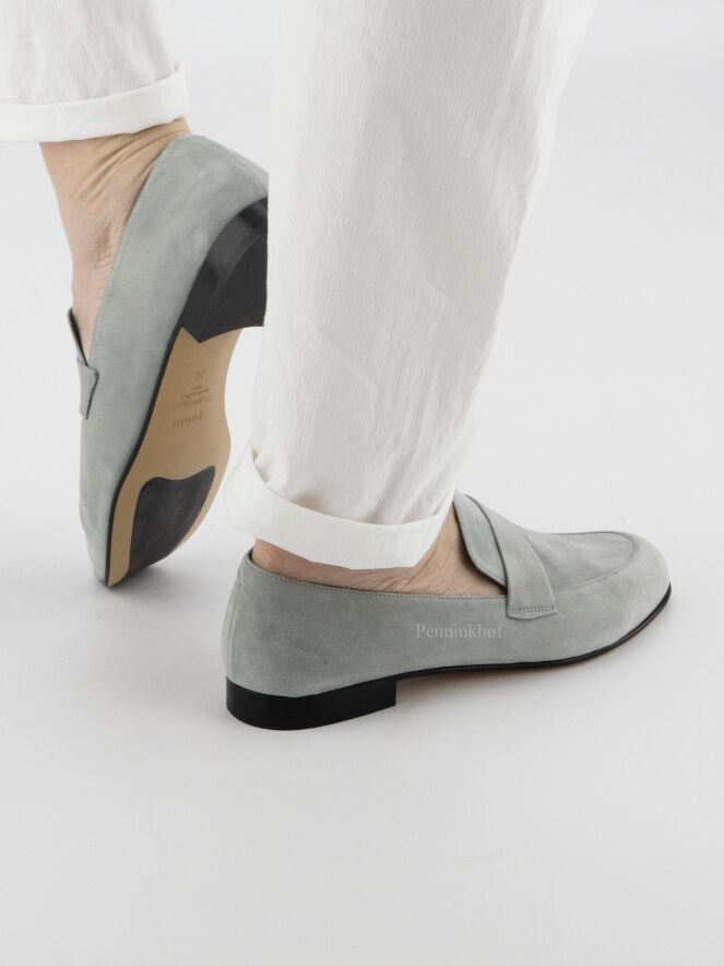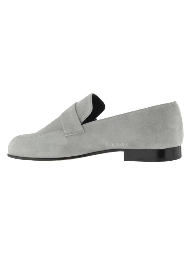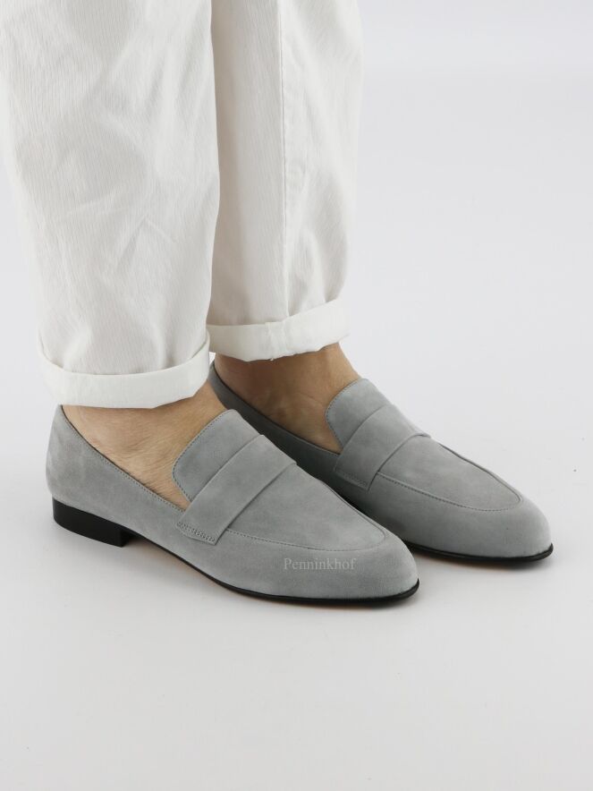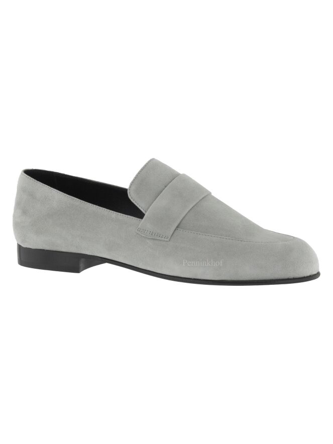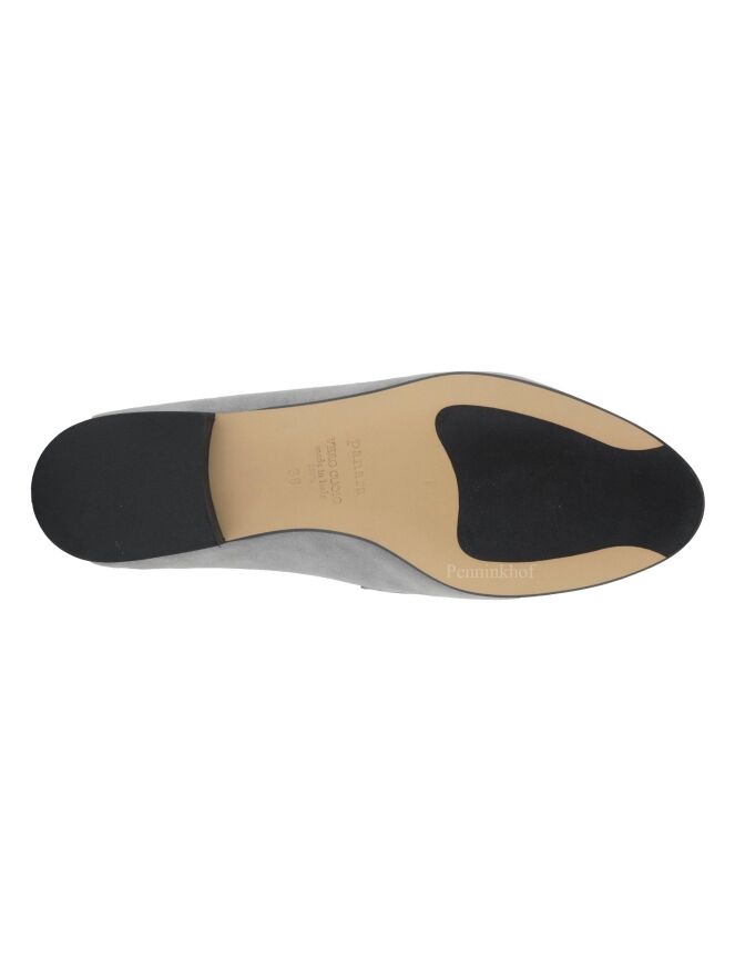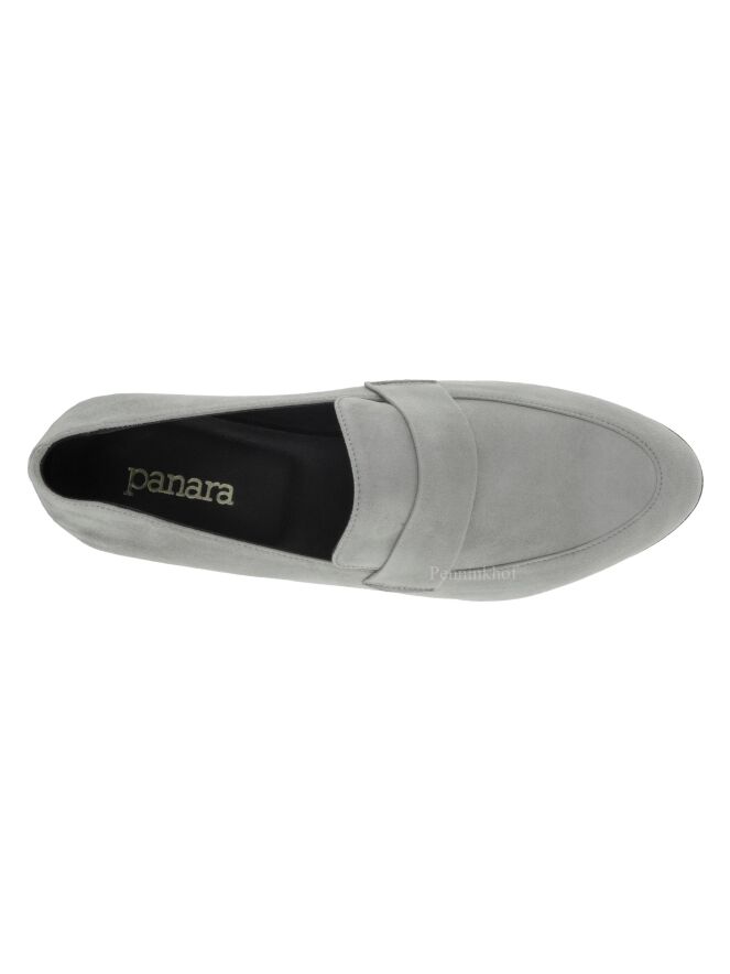 Ein grauer Slipper der Schuhmarke Panara. Der Slipper ist vorn abgerundet. Der vordere Fußbereich wird durch ein schmales Band akzentuiert, das aus dem gleichen Material wie der Slipper besteht. Die Innenseite des Slippers ist mit Leder ausgekleidet.