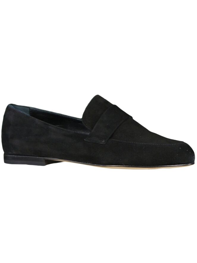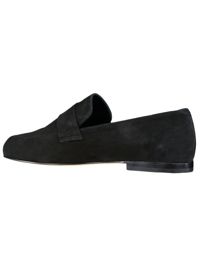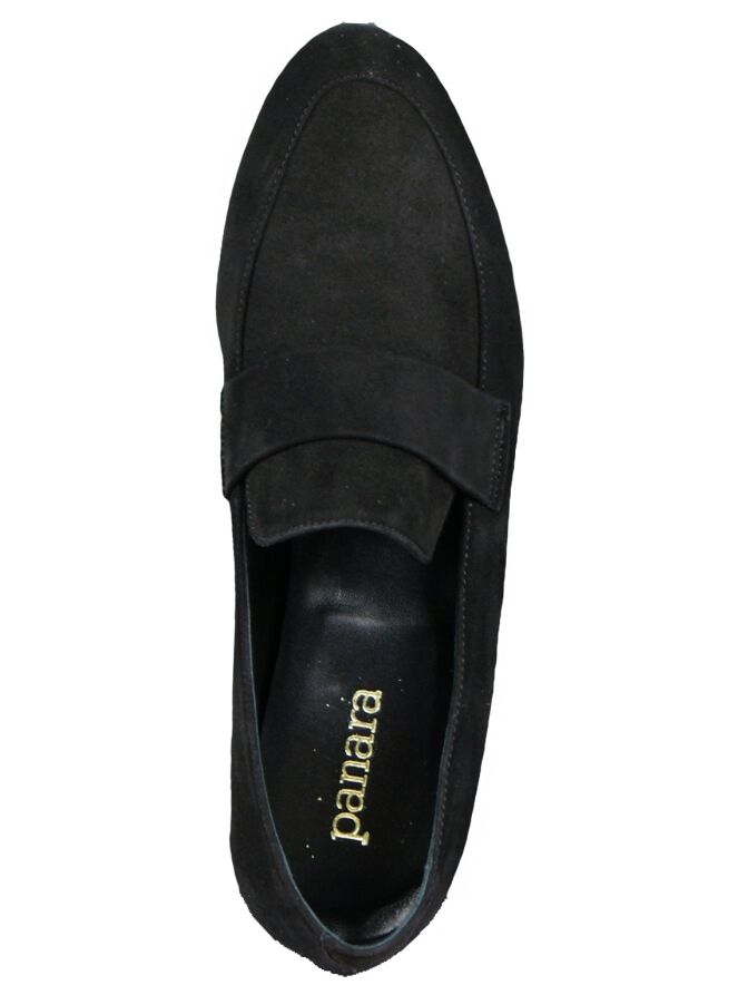 Schwarzer Halbschuh der Designerschuhmarke Panara. Auf dem abgerundeten Vorfuß befindet sich ein schmales Band aus dem gleichen Material wie der Halbschuh. Dieser Halbschuh hat ein Innenfutter aus Leder.