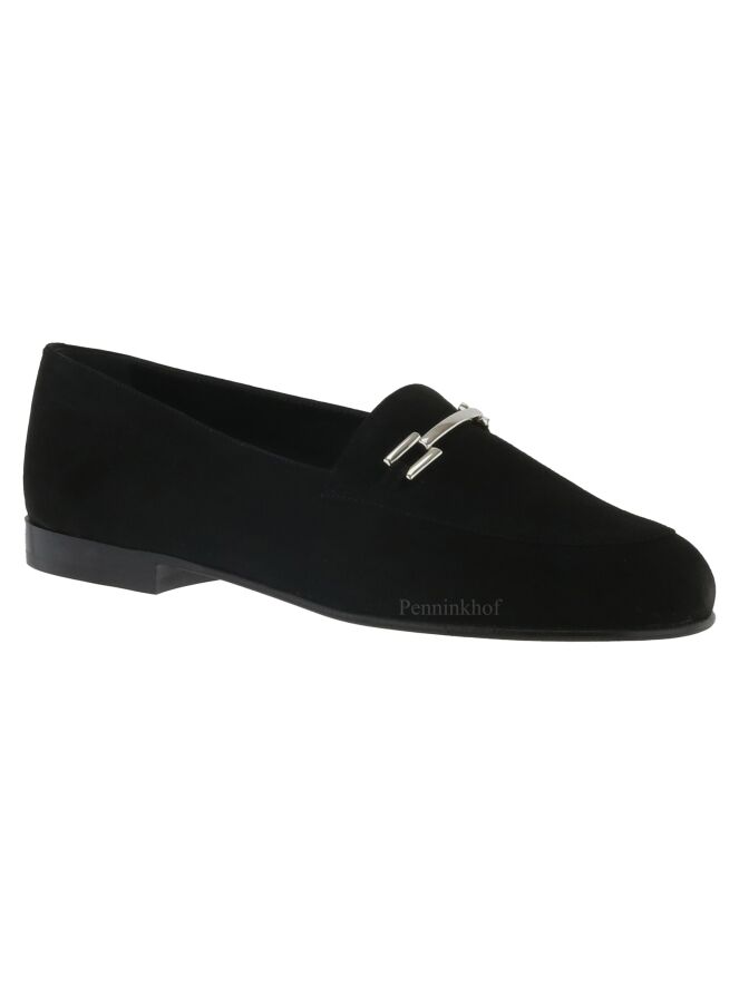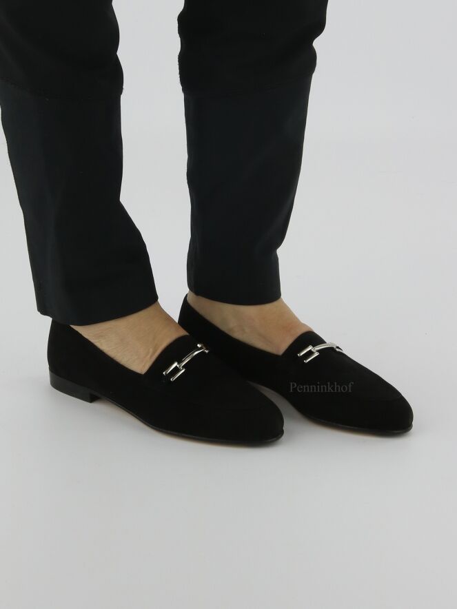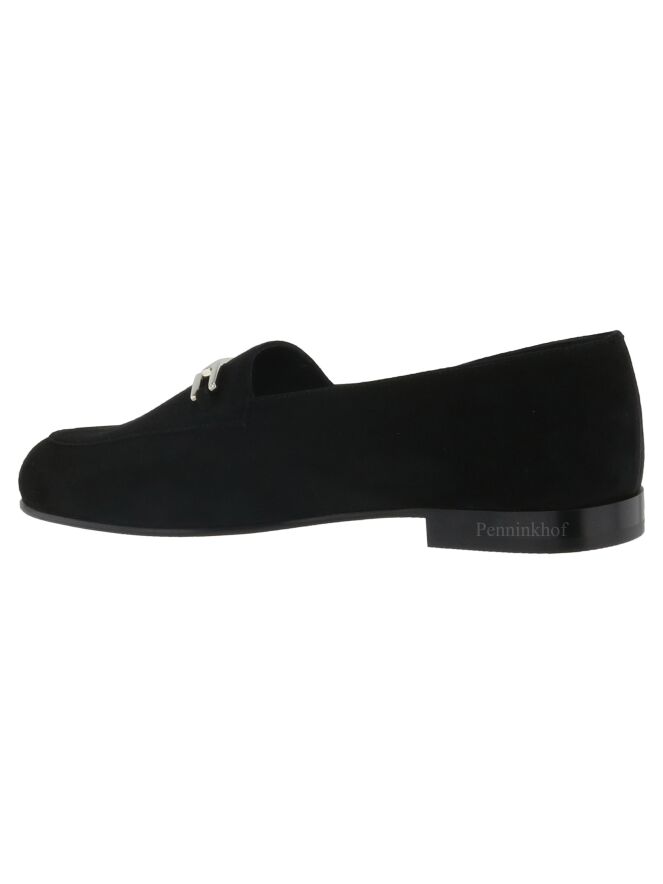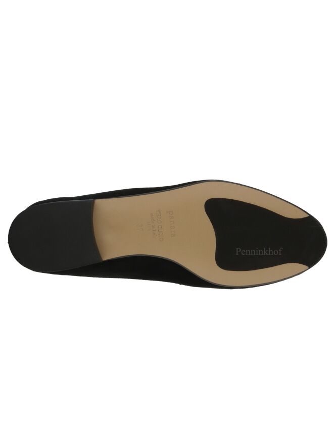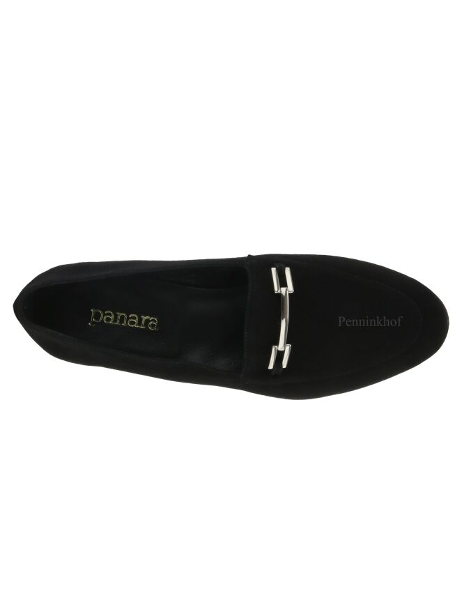 Ein schwarzer Slipper der Schuhmarke Panara aus weichem Camoscio-Wildleder. Die Schuhspitze ist schmal. Auf dem vorderen Fußteil befindet sich eine silberfarbene Schnalle. Die Innenseite des Slippers ist mit Leder ausgekleidet.