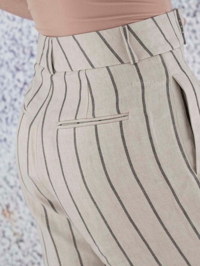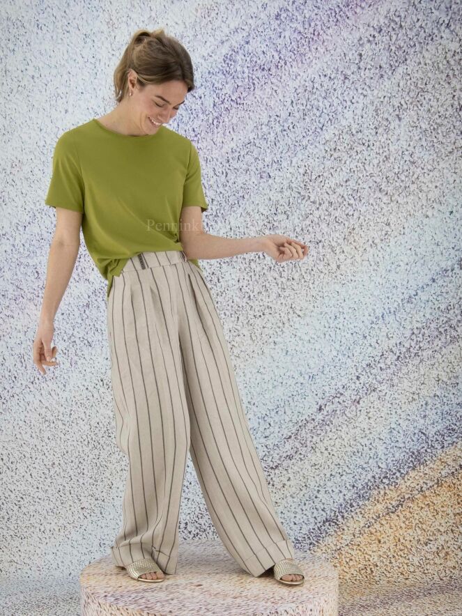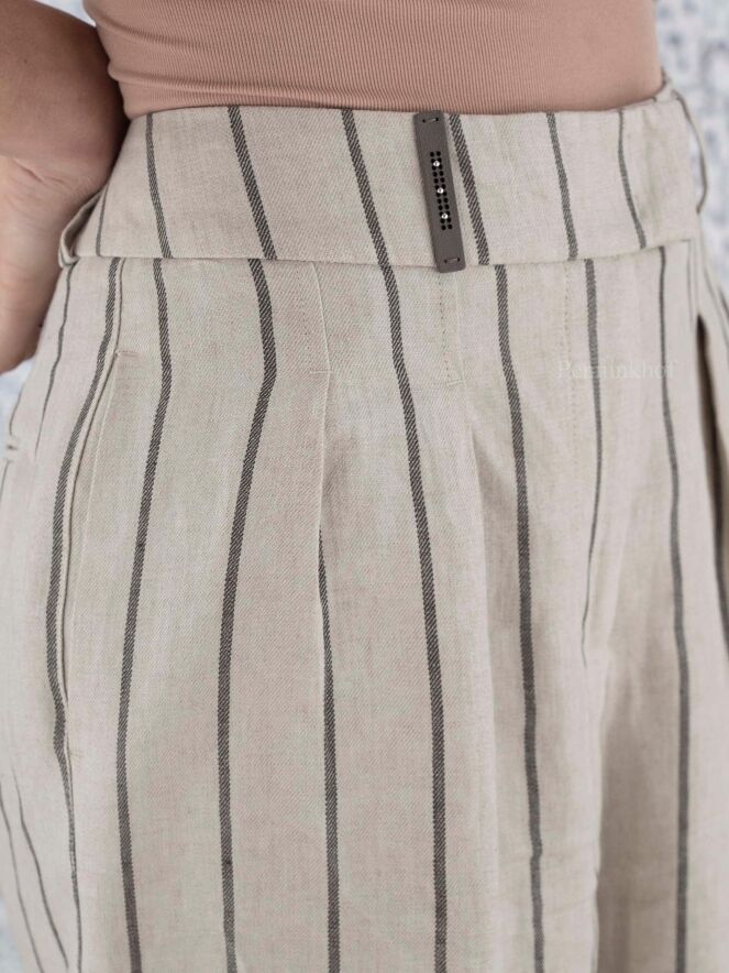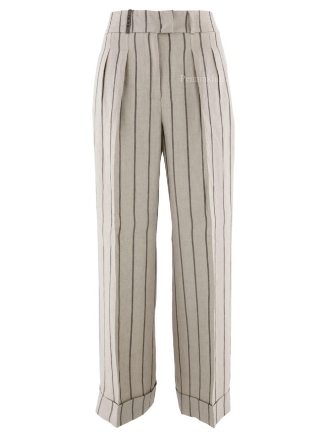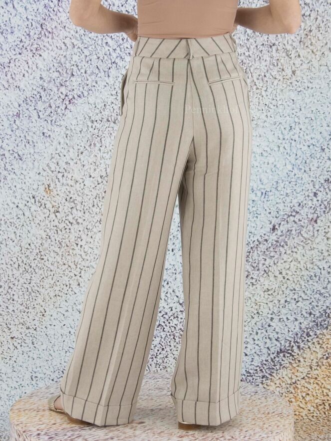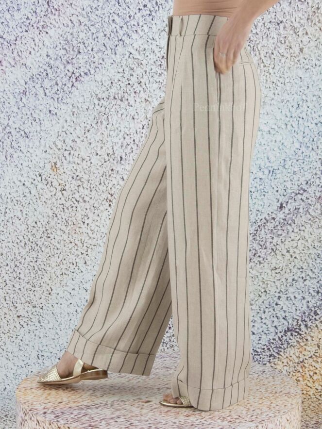 Eine weite Nadelstreifenhose der Designermarke Peserico in Dunkelgrau und Beige. An der Taille befinden sich Bundfalten. Die weiten Hosenbeine sind unten mit einem breiten Umschlagsaum versehen. Die Hose hat Seitentaschen und kann von Hand gewaschen werden.