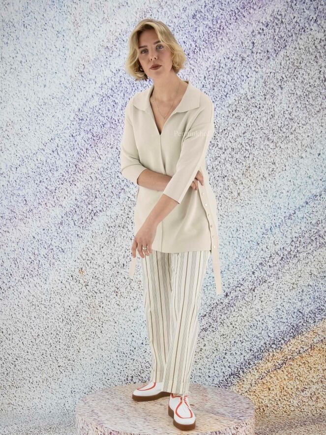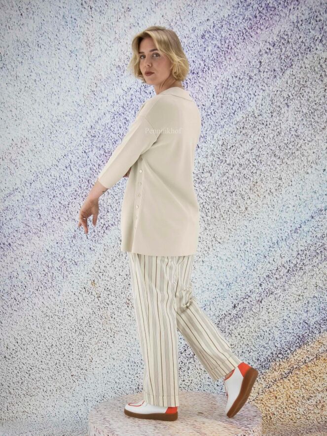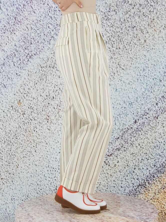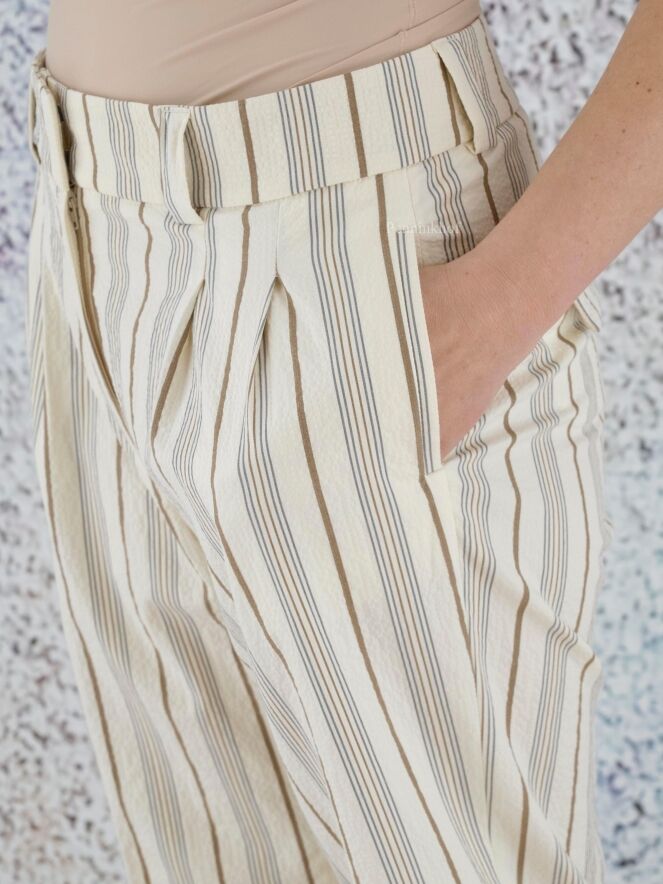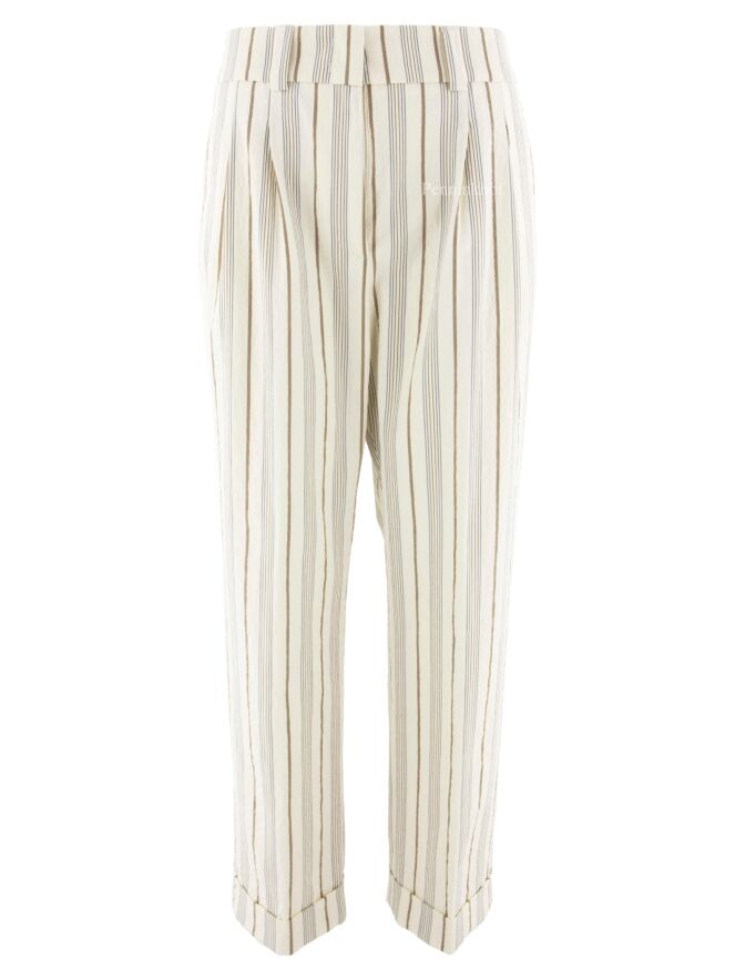 Eine Hose der Designermarke Peserico mit Streifenmuster in den Farben Beige, Grau und Braun. An der Taille befinden sich Bundfalten. Der untere Saum ist umgeschlagen. Diese Hose sollte nicht gewaschen werden.