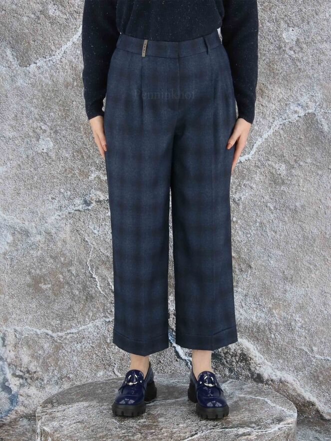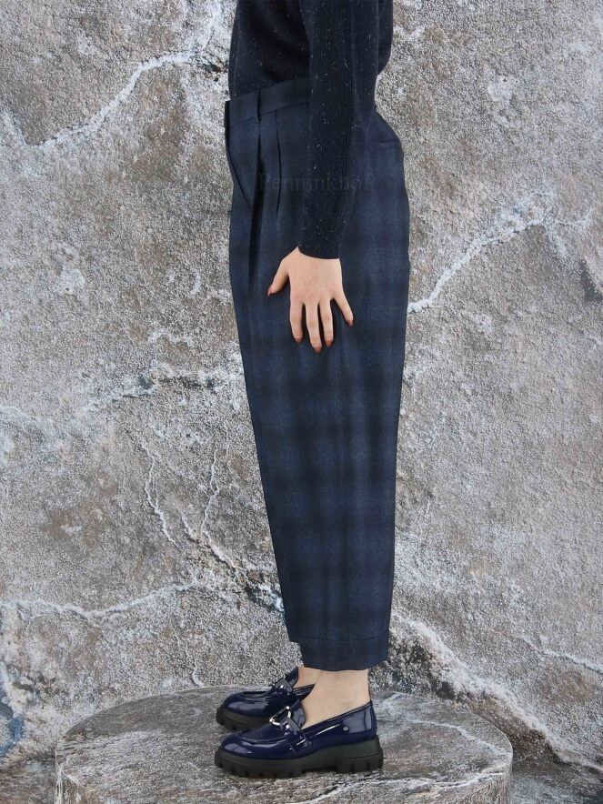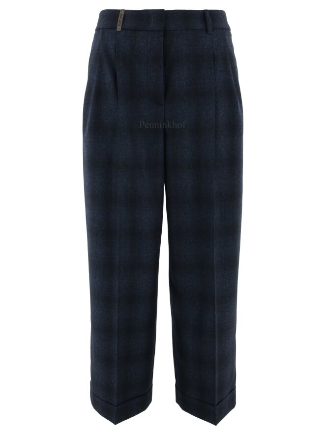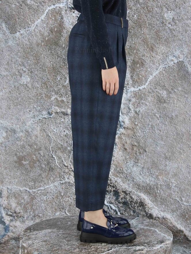 Eine edle Hose der Designermarke Peserico mit Degradé-Karomuster in den Farben Indigoblau und Schwarz. An der Taille befindet sich ein fein geraffter dehnbarer Bund. An der Taille befinden sich Bundfalten. Die Hose hat Eingriffstaschen. Der untere Saum ist leicht umgeschlagen. Diese Hose sollte nicht gewaschen werden.