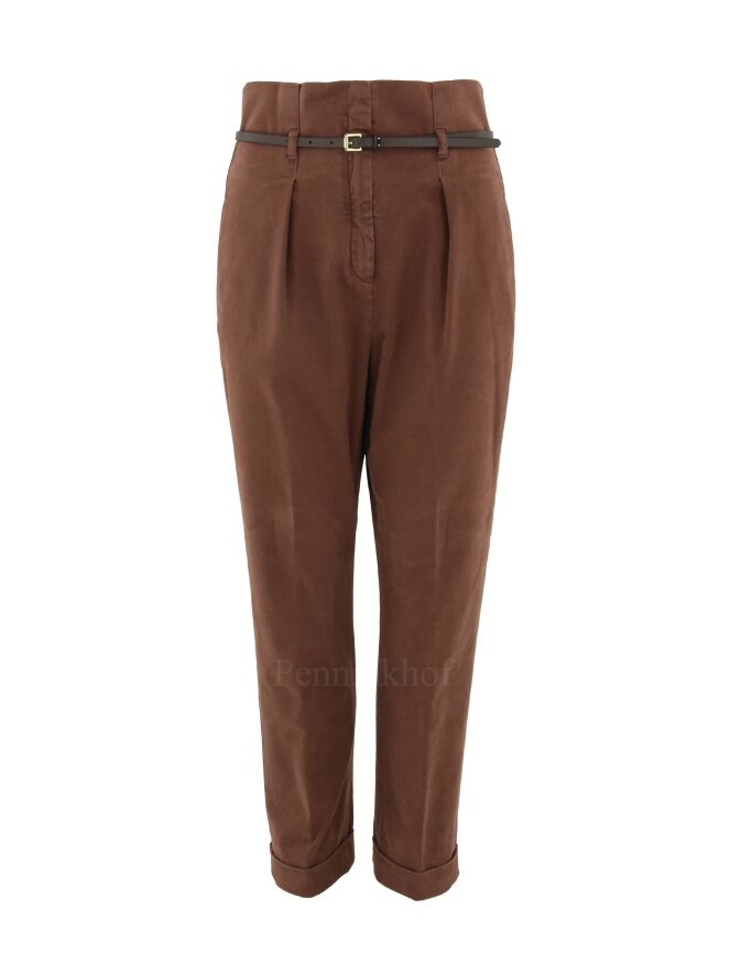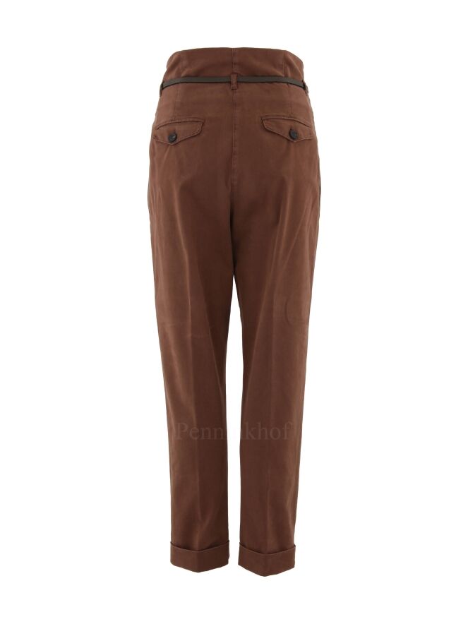 Eine rostbraune Stoffhose der Designermarke Peserico. An der Taille befindet sich ein schmaler mokkabrauner Gürtel. Von der Taille abwärts verlaufen mehrere Bundfalten. Die Hose hat Seitentaschen. Der untere Saum der Hosenbeine ist umgeschlagen. Diese Hose kann bei 40 Grad gewaschen werden.
