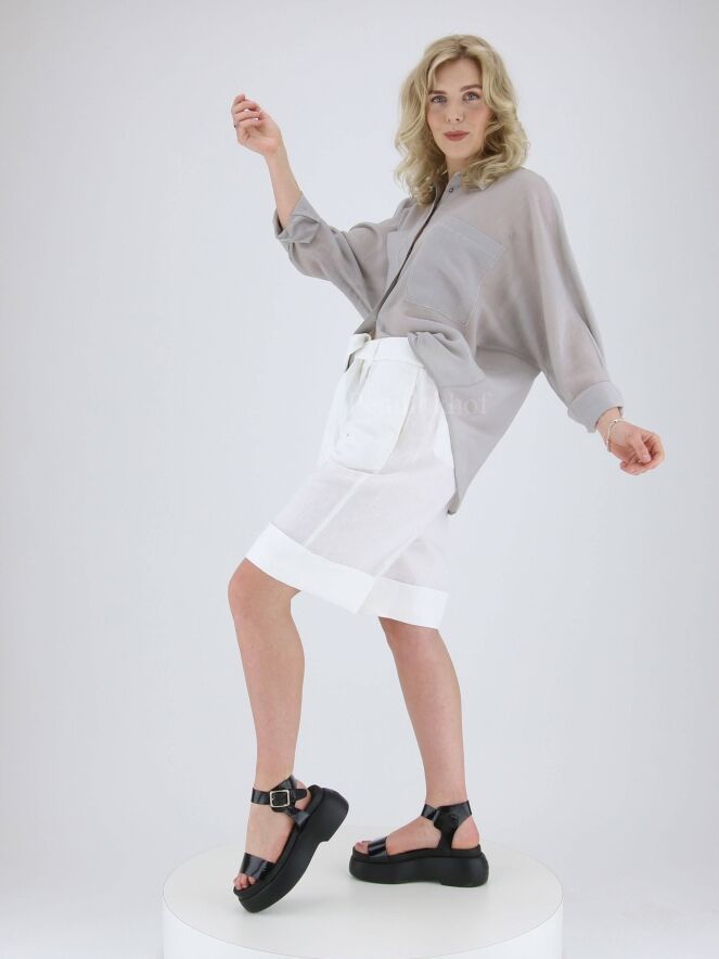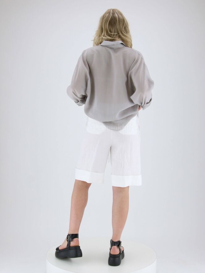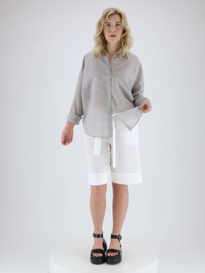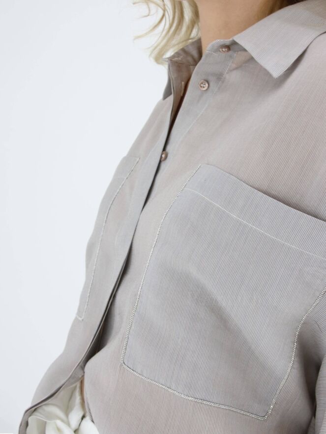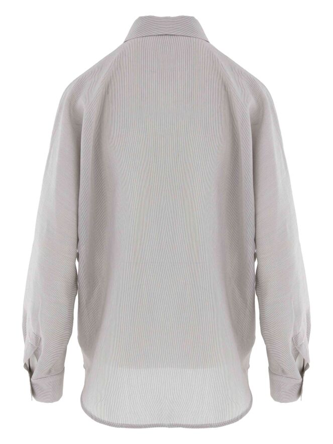Eine Bluse der Designermarke Peserico in feiner Längsstreifenstruktur in den Farben Grau und Weiß. Die Bluse kommt mit Fledermausärmeln. Die Kante der Brusttaschen ist mit einer silberfarbigen Naht abgesteppt. Diese Bluse kann von Hand gewaschen werden.