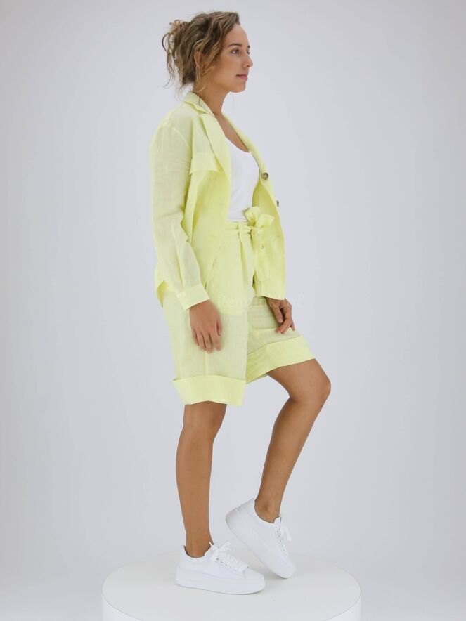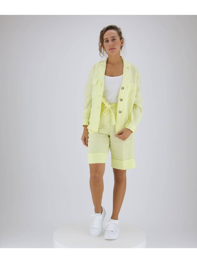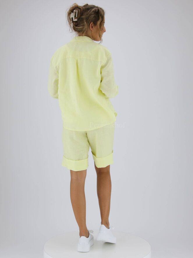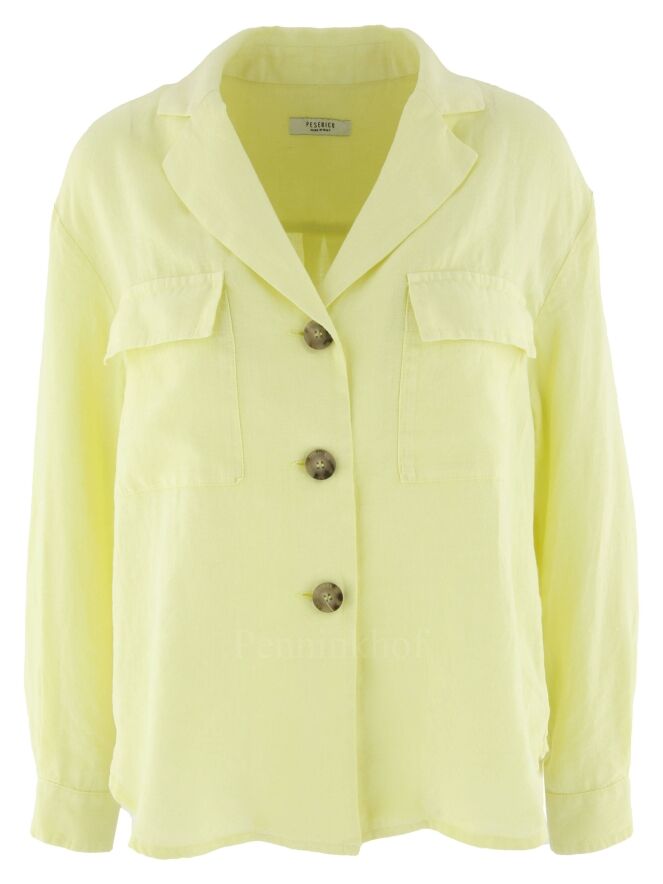 Eine pastellgelbe Bluse der Designermarke Peserico. Die Bluse wird mit drei Knöpfen geschlossen. Auf der Rückseite befindet sich eine Naht auf Höhe der Schulterblätter mit einer Falte in der Mitte. Diese Bluse kann bei 30 Grad gewaschen werden.