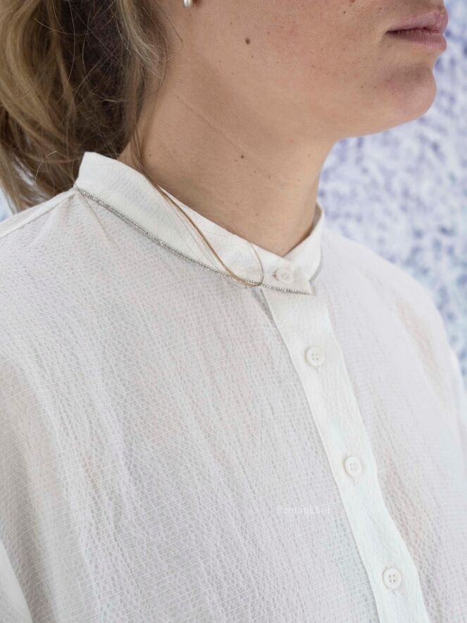 Eine leicht transparente Feinripp-Bluse der Designermarke Peserico in Cremeweiß. Entlang des Rundhalsausschnitts verläuft ein Strassbesatz. Die Bluse hat halblange Ärmel und sollte nicht gewaschen werden.