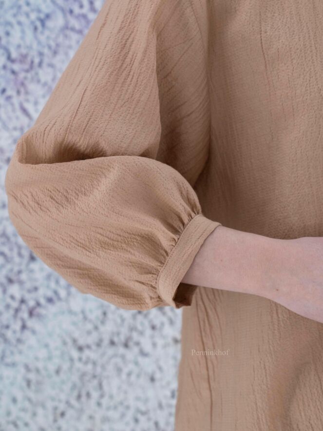Eine leicht transparente Feinripp-Bluse der Designermarke Peserico in einem Leber-Ton. Entlang des Rundhalsausschnitts verläuft ein Strassbesatz. Die Bluse hat halblange Ärmel und sollte nicht gewaschen werden.
