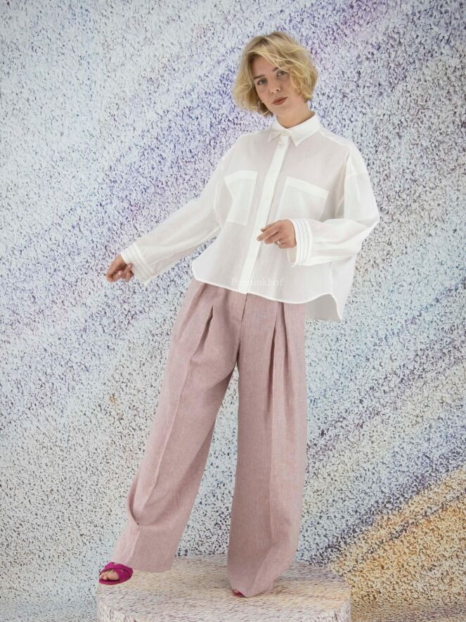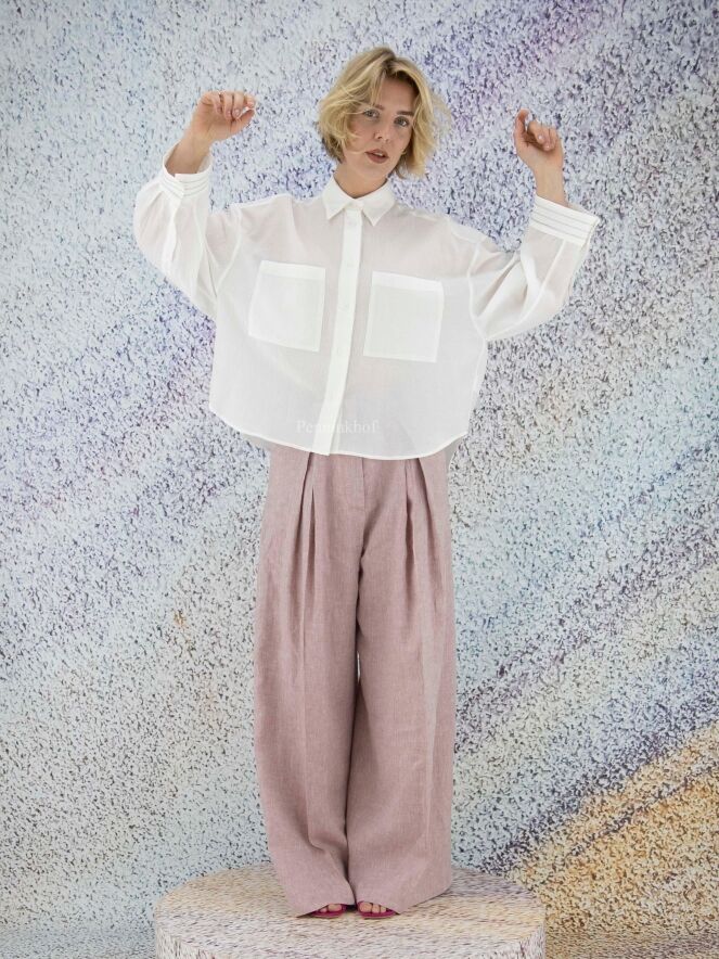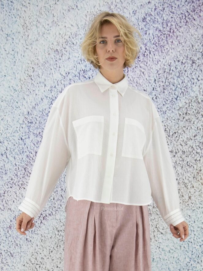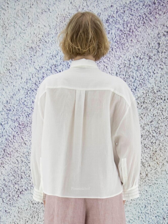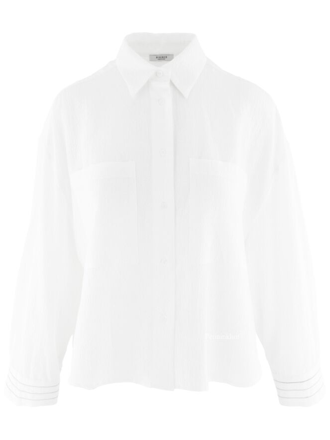 Eine edle, leicht transparente Bluse der Designermarke Peserico aus weicher Crêpe-Qualität in Weiß. In den Manschetten der langen Ärmel befinden sich silberfarbene Strassborten. Diese Bluse darf nicht gewaschen werden.