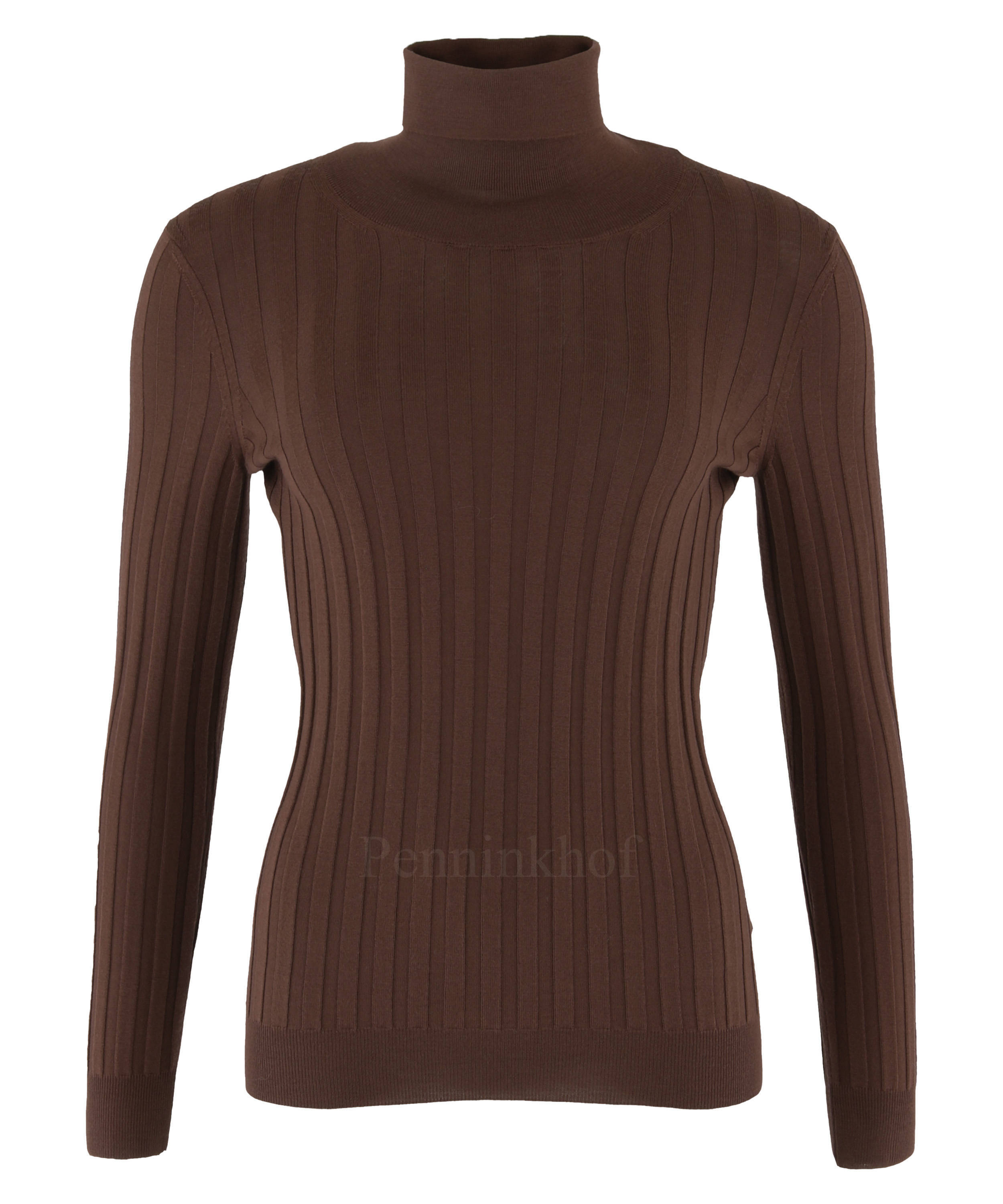 Ein brauner Pullover der Designermarke Peserico mit breit geripptem Muster. Der Pullover hat einen Turtle-Ausschnitt und kann von Hand gewaschen werden.