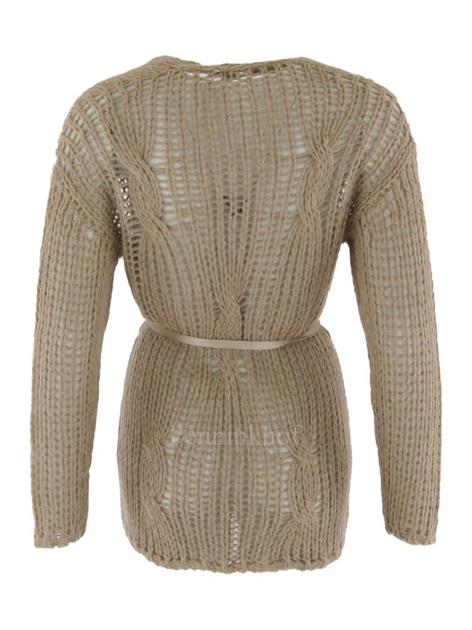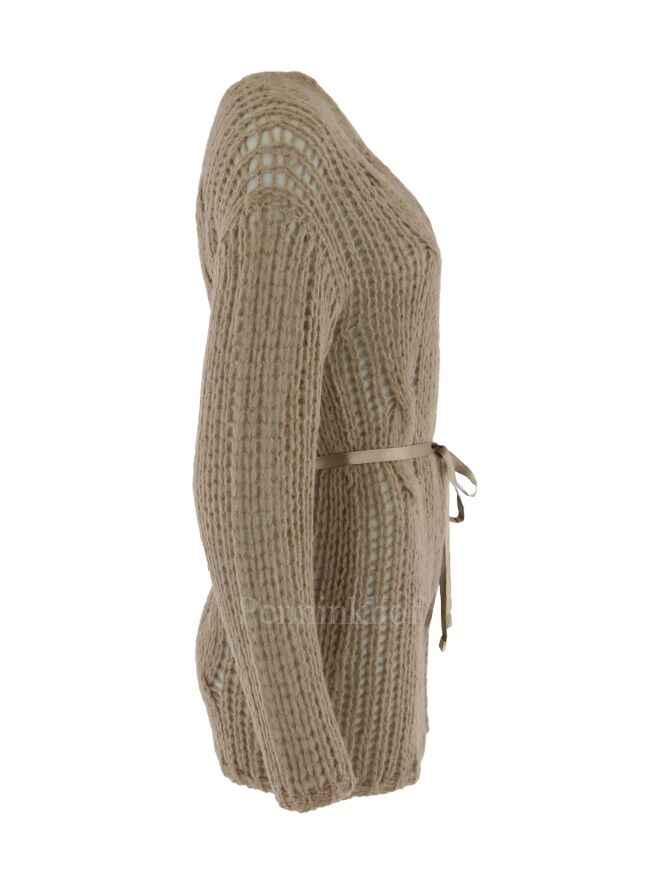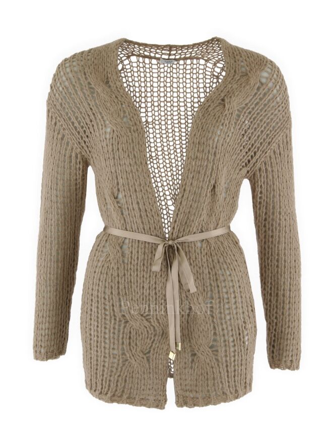 Ein offen gehäkelter Cardigan der Designermarke Peserico in einem zarten Camel. Die Weste hat keinen Verschluss. Die Weste kommt mit einem dünnen, matten Satinband als Gürtel. Diese Strickweste kann von Hand gewaschen werden.