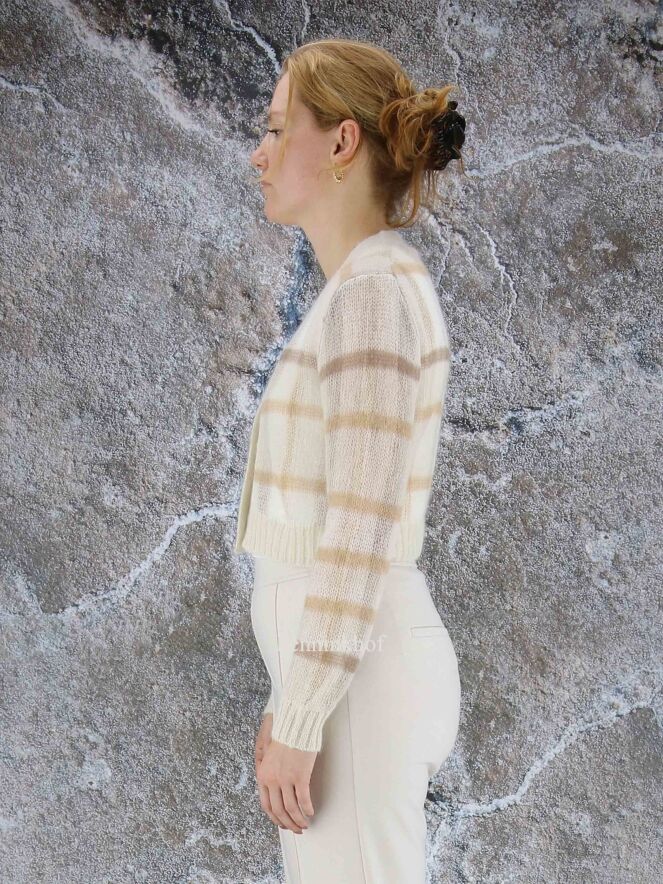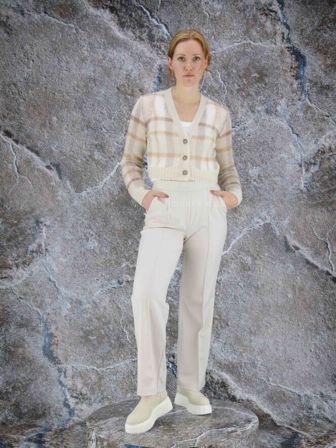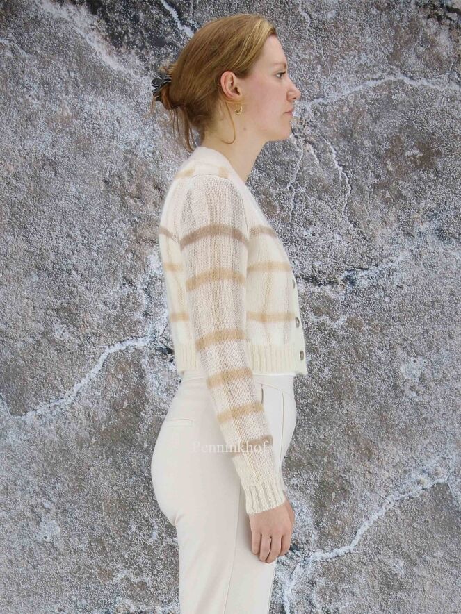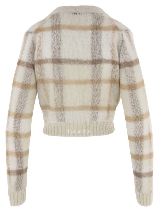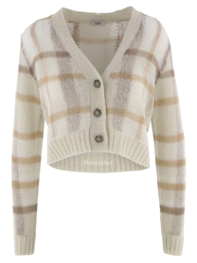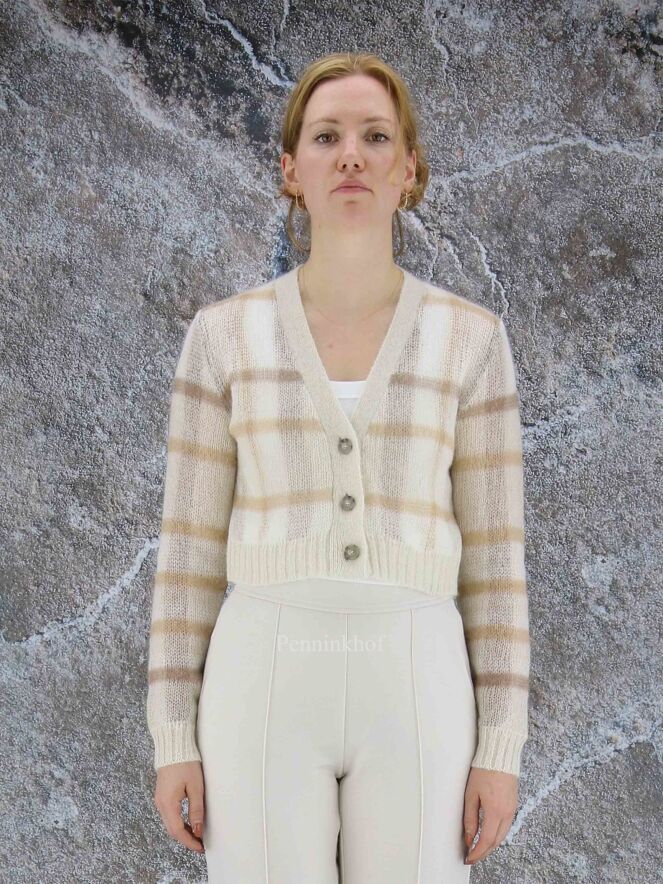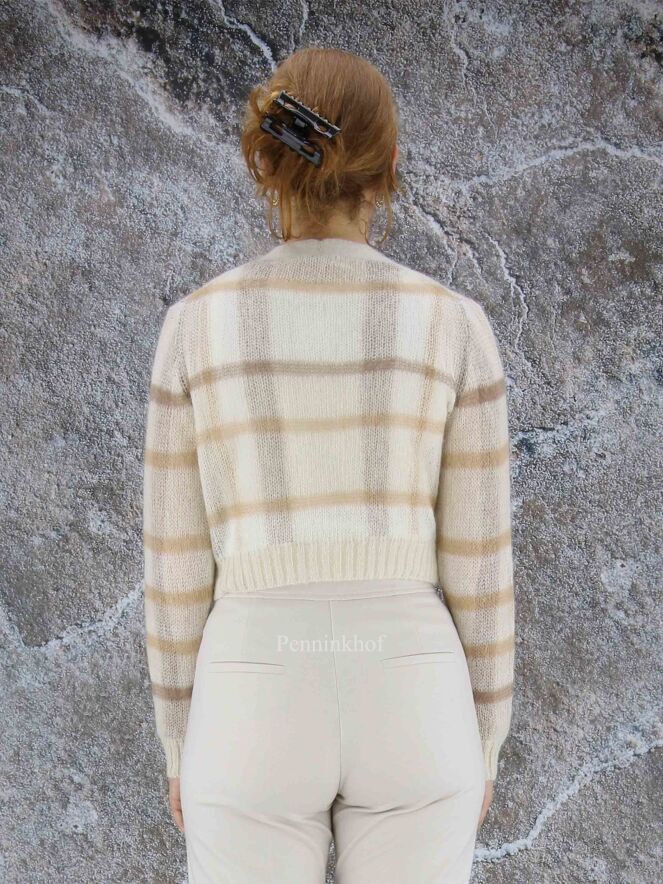 Eine offenmaschige kurze Strickjacke der Designermarke Peserico mit Karomuster in Camel, Braun und Cremeweiß. Die Abschlüsse der langen Ärmel und der untere Saum sind mit einem Strickbündchen versehen. Diese Strickweste kann von Hand gewaschen werden.