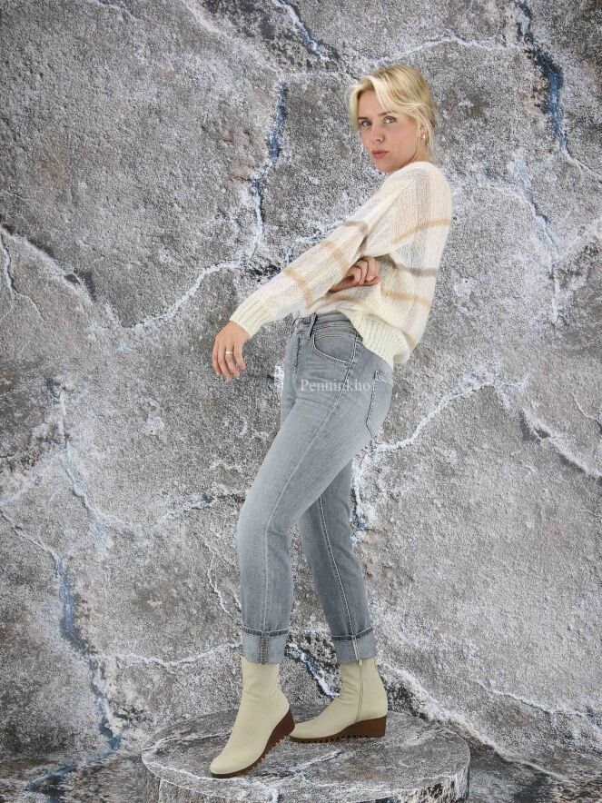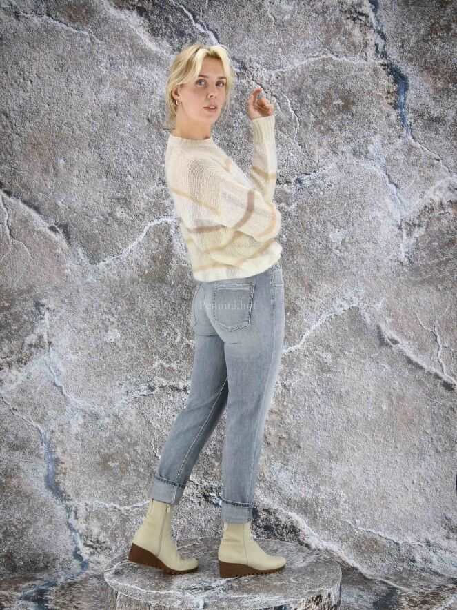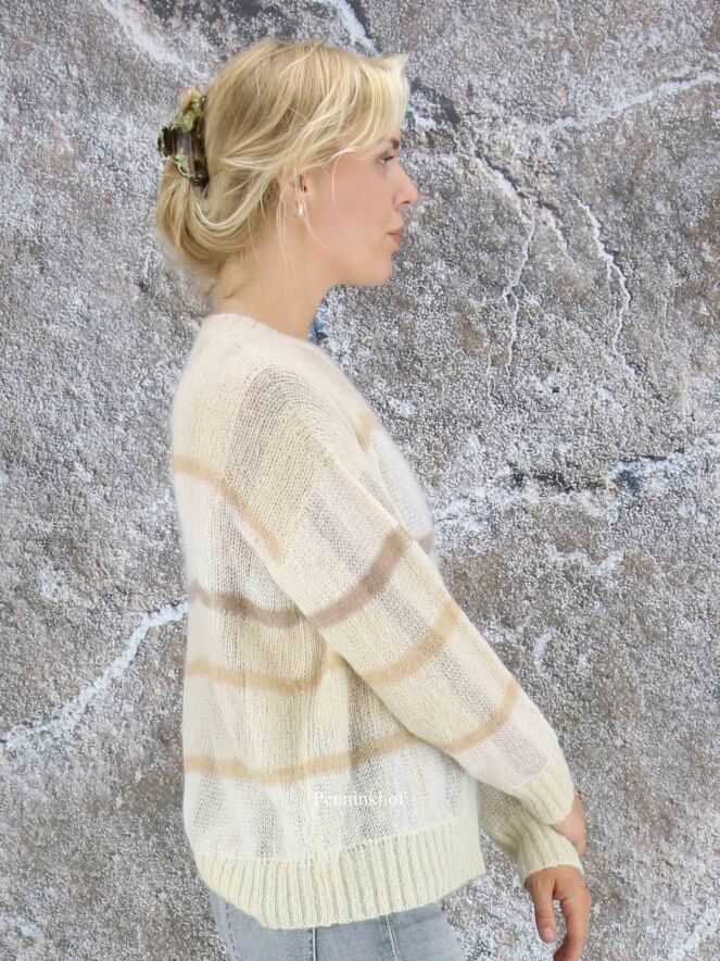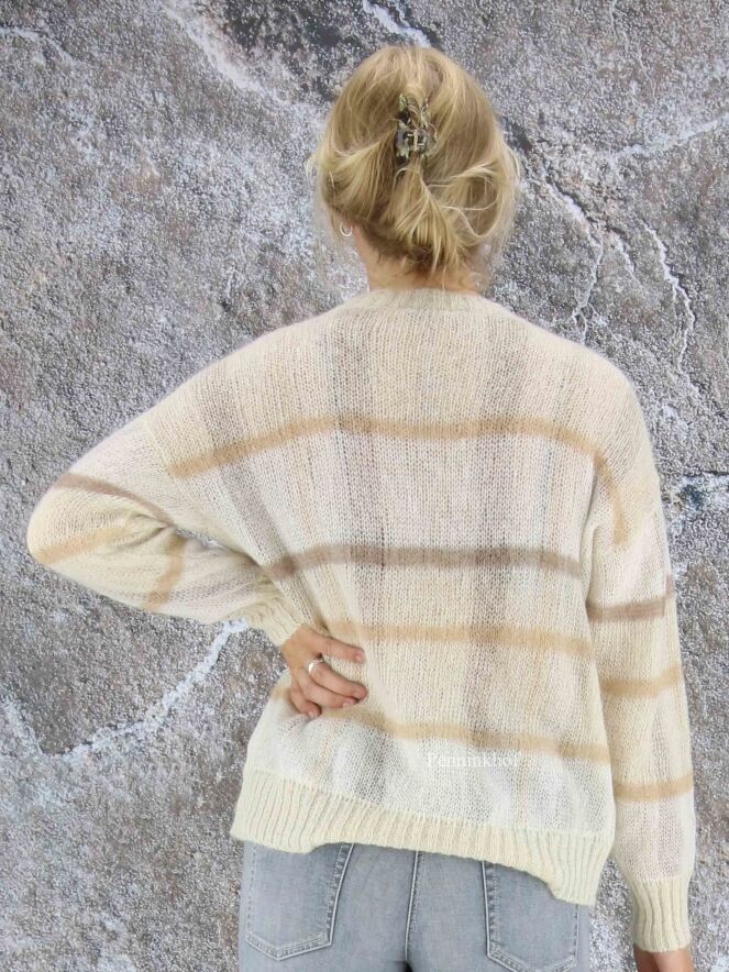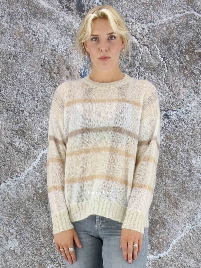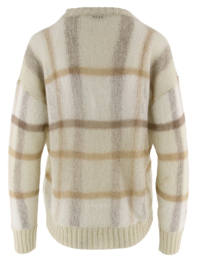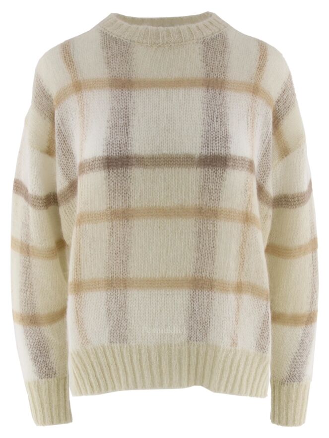Ein offenmaschiger Pullover der Designermarke Peserico mit Karomuster in Camel, Braun und Cremeweiß. Entlang des runden Ausschnitts, am Abschluss der langen Ärmel und am unteren Saum verläuft Strickbündchen aus Trikot. Dieser Pullover darf von Hand gewaschen werden.