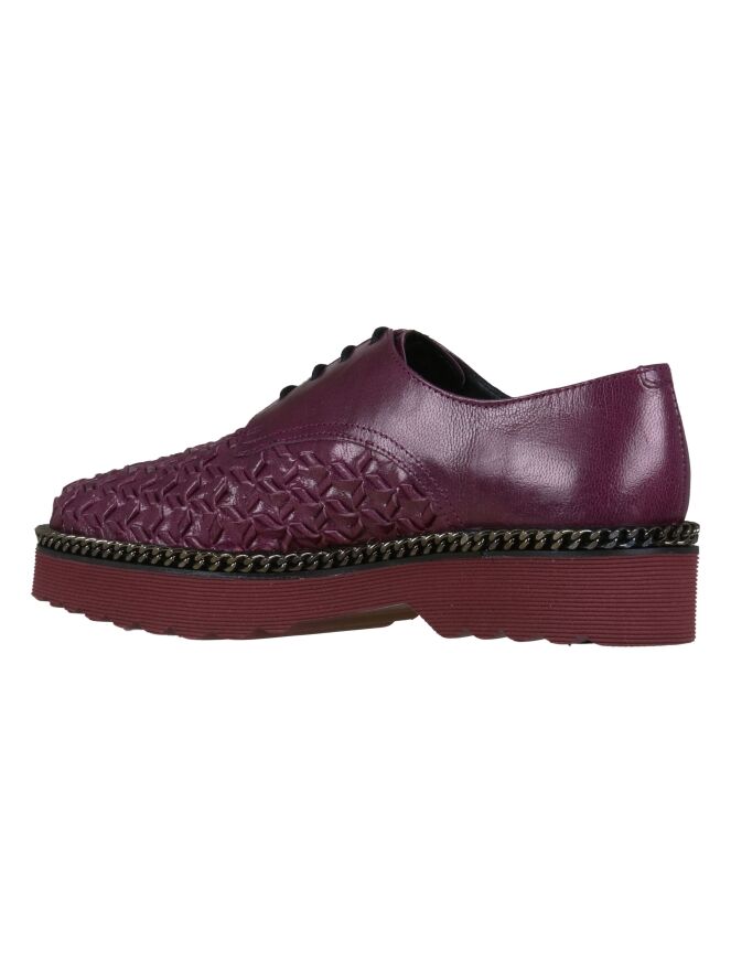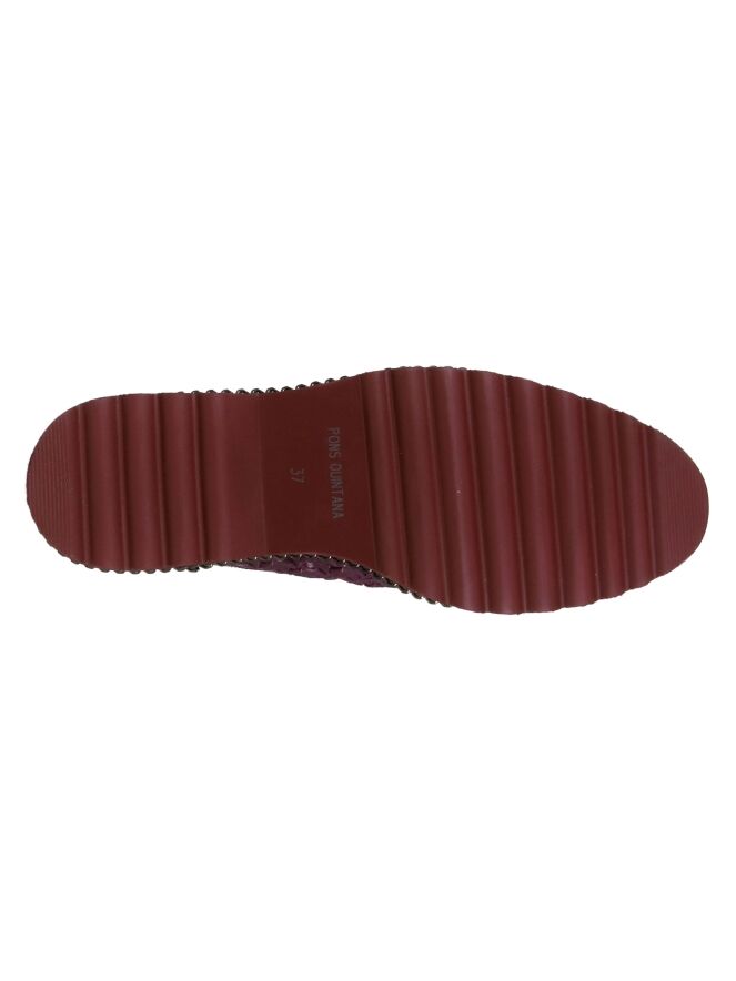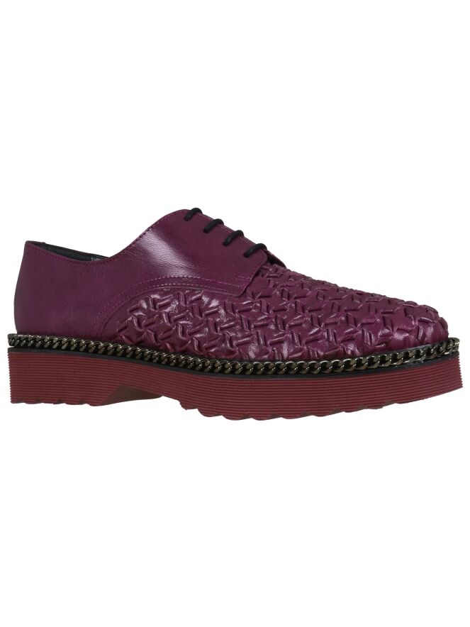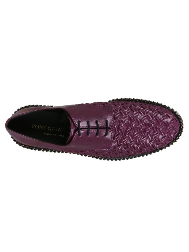 Hochwertiger violetter Schnürschuh der Schuhmarke Pons Quintana. Das Leder ist auf dem Vorfuß bis zu den Seiten geflochten. Der hintere Teil des Schuhs ist aus Nappaleder. Eine nickelfarbige Kette akzentuiert den Rand der violetten Sohle. Dieser Halbschuh hat ein Innenfutter aus Leder.