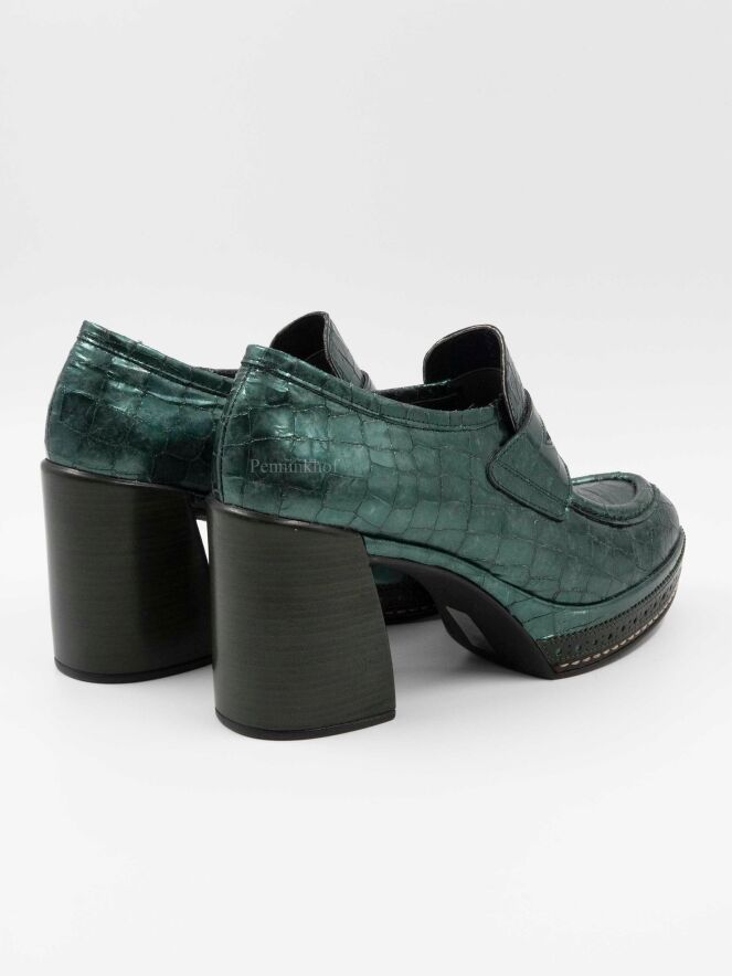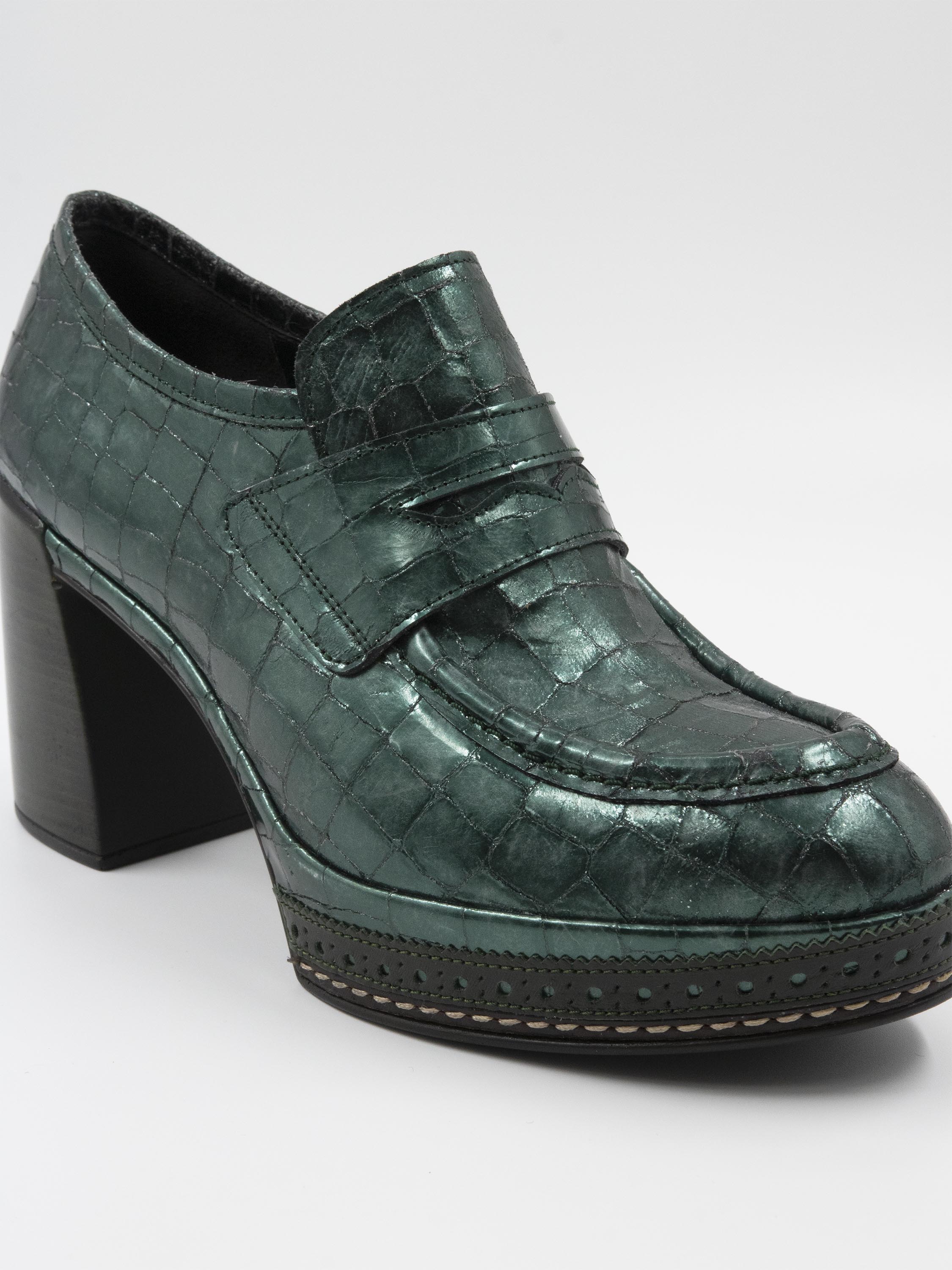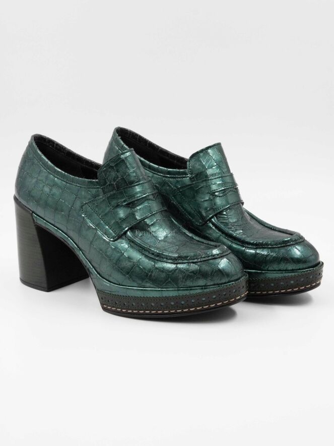 Ein Halbschuh mit hohem Blockabsatz von Pons Quintana mit Krokoprint in Metallic-Grün. Der Blockabsatz ist in einem neutralen Schwarz gehalten. Entlang der Kante an der Unterseite der Plateausohle befindet sich eine weiße Ziernaht. Die Innenseite ist mit Leder gefüttert.