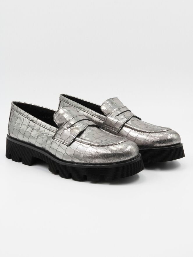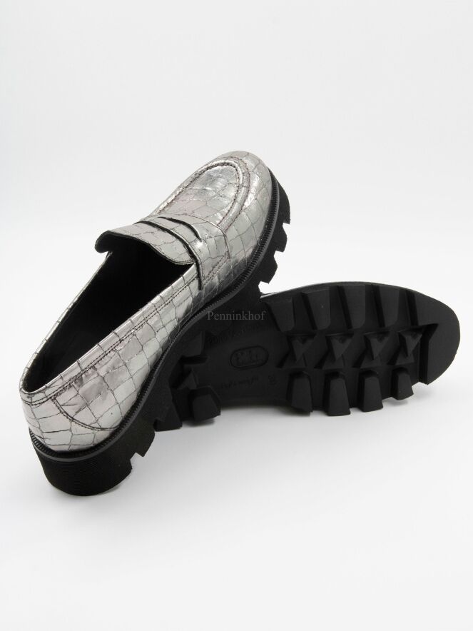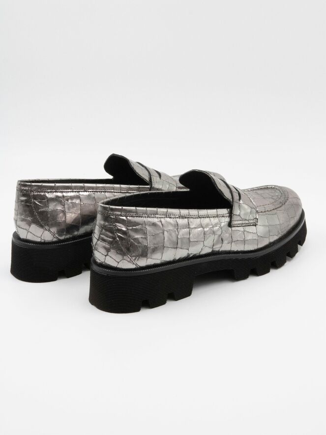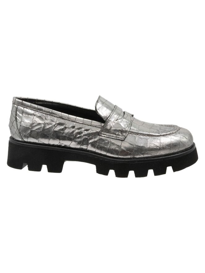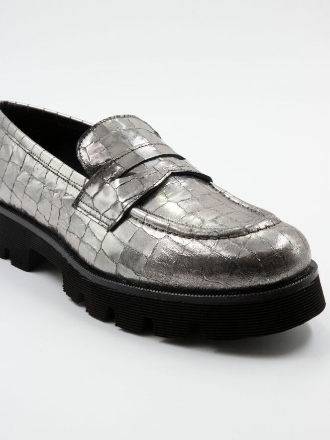 Ein Halbschuh von Pons quintana in silbernem Krokoprint. Die schwarze Sohle ist grob gerippt. Die Innenseite des Halbschuhs ist mit Leder ausgekleidet.