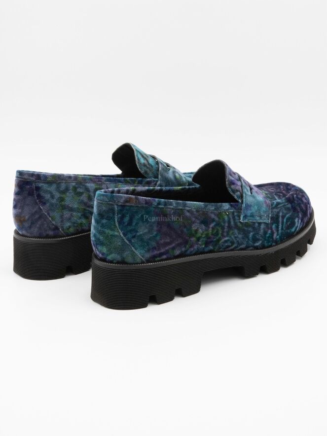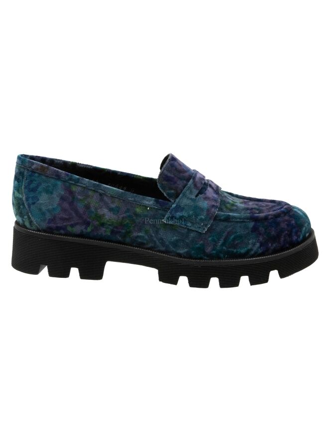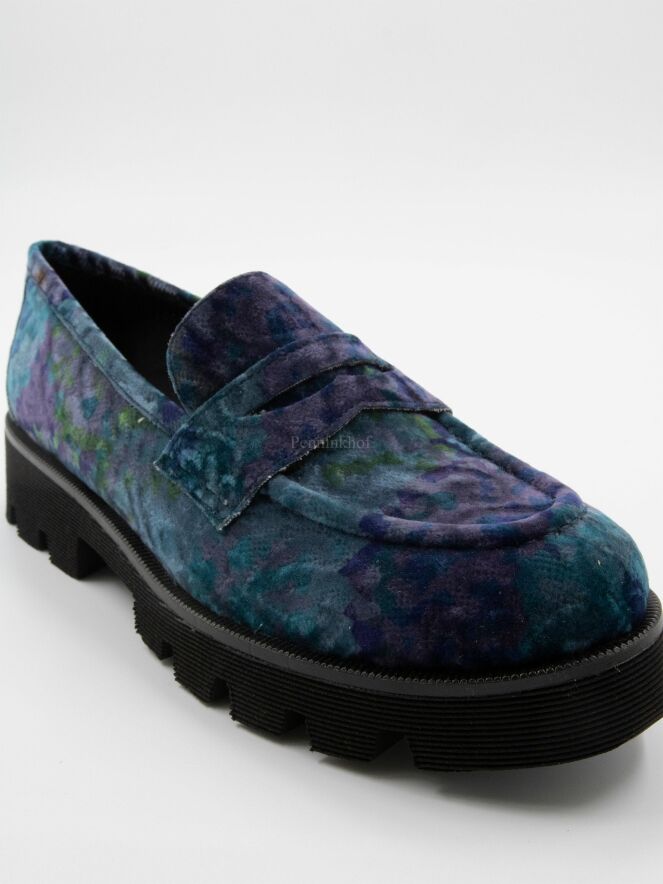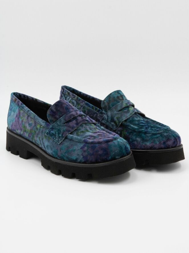 Ein Halbschuh von Pons Quintana aus Veloursleder mit einem grafischen Print in verschiedenen Lila-, Türkis- und Grüntönen. Die schwarze Sohle ist grob gerippt und das Innere ist mit Leder ausgekleidet.