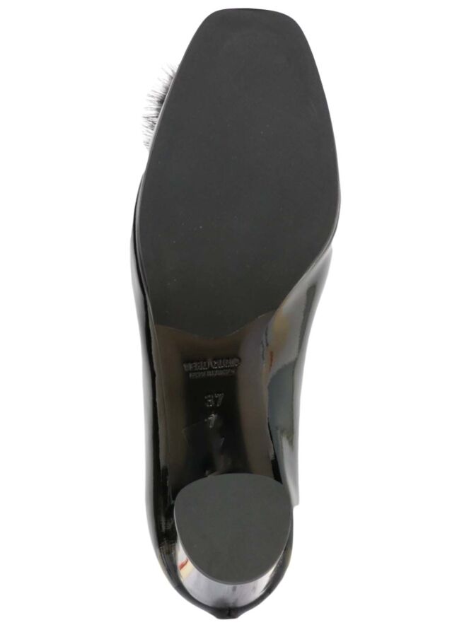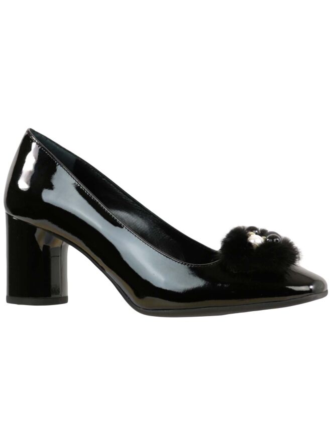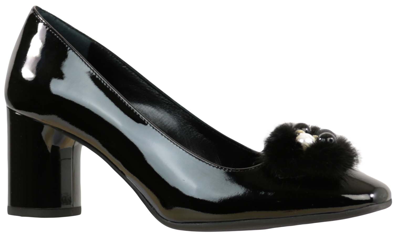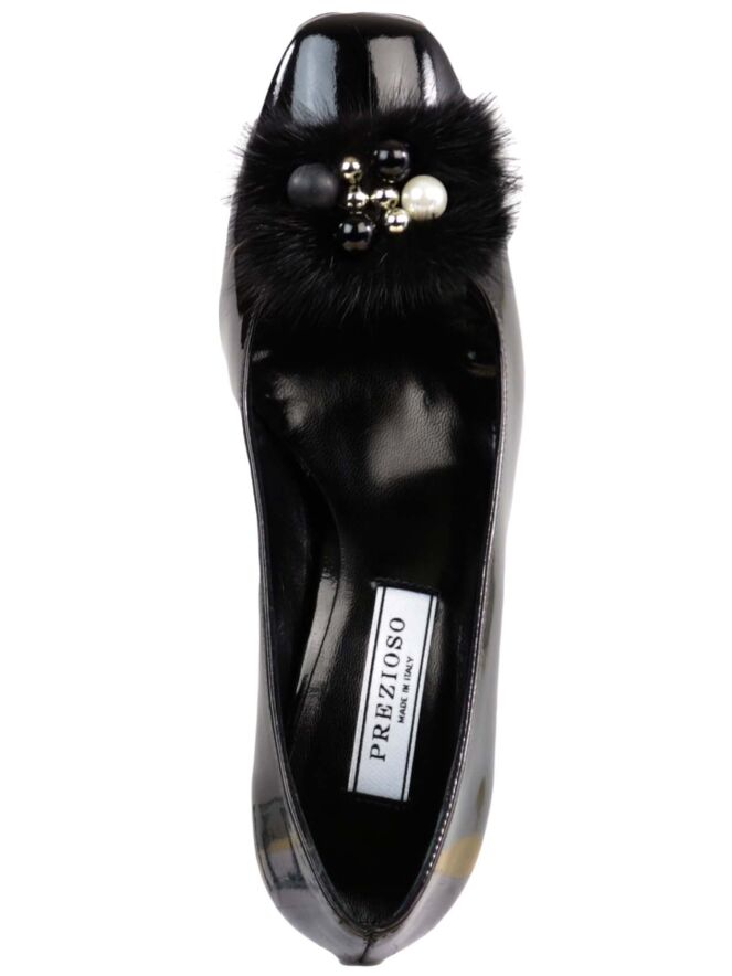 Lackleder-Pumps der Designerschuhmarke Prezioso in Schwarz. Der Pumps ist vorn quadratisch abgerundet. Der Vorfuß wird durch eine Dekoration aus Pelzimitat mit silber-, schwarz- und goldfarbenen Perlen akzentuiert. Der elegante Blockabsatz besteht aus dem gleichen Material wie der Schuh. Das Innenfutter des Pumps ist aus Leder.