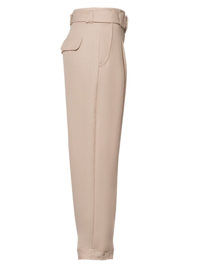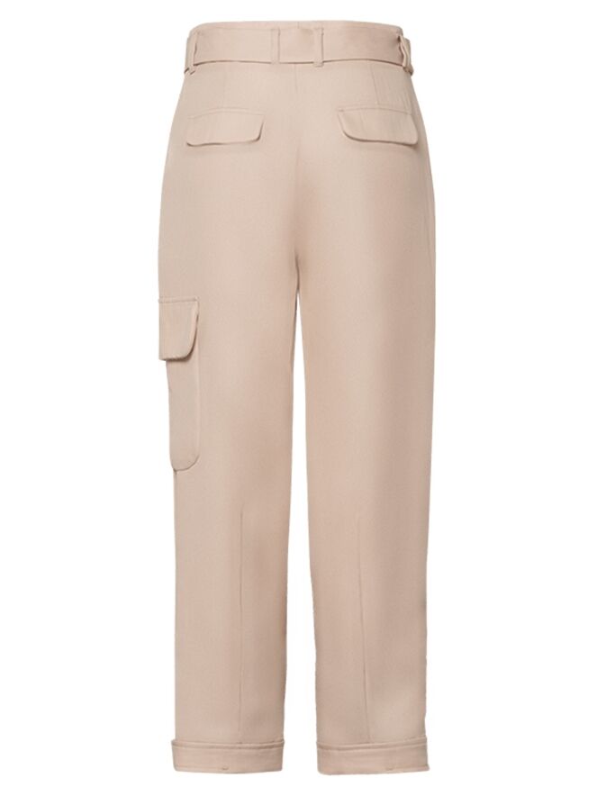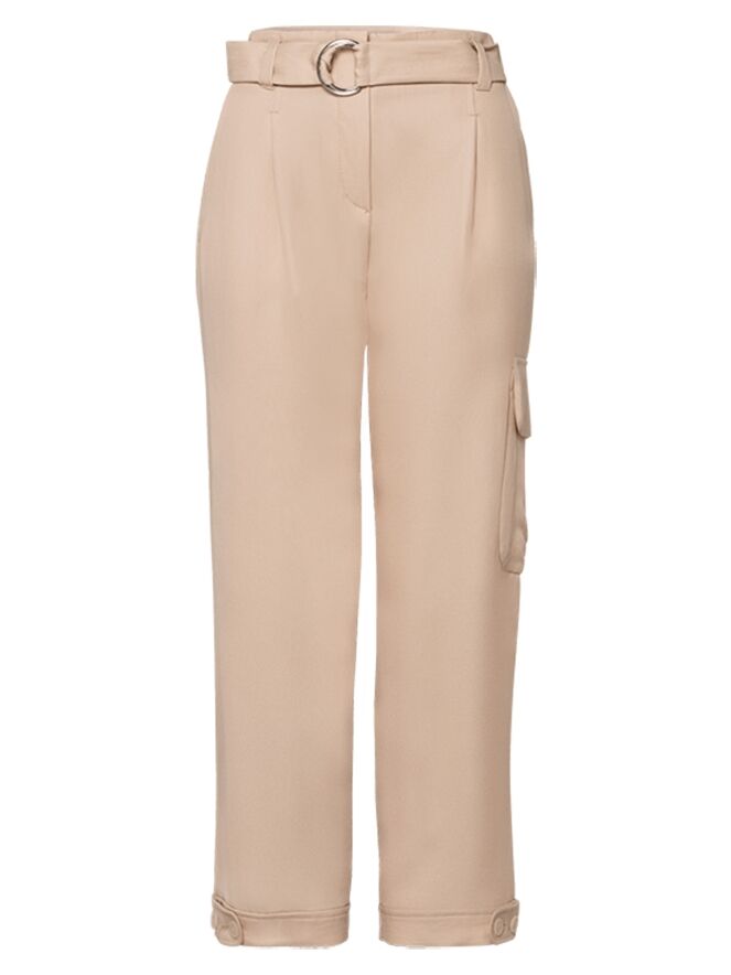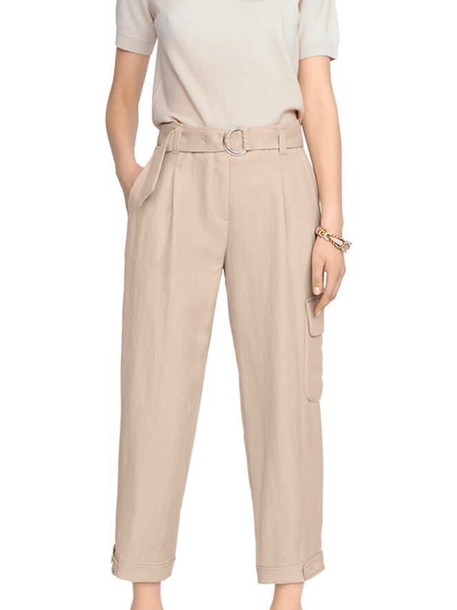 Beige Worker-Hose der Designermarke Riani. Der Gürtel besteht aus demselben Stoff wie die Hose und ist mit einer runden silberfarbenen Schließe versehen. Die Hose kommt mit Einstecktaschen und ist am Saum der Hosenbeine mit einem dekorativen Knopfverschluss versehen. Diese Stoffhose darf nicht gewaschen werden.
