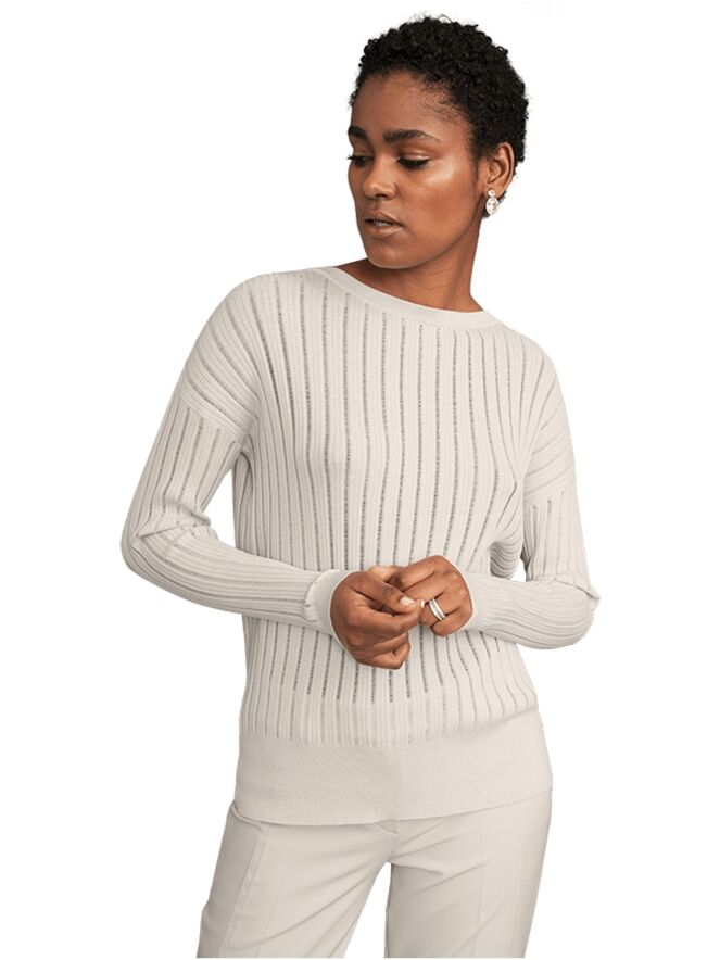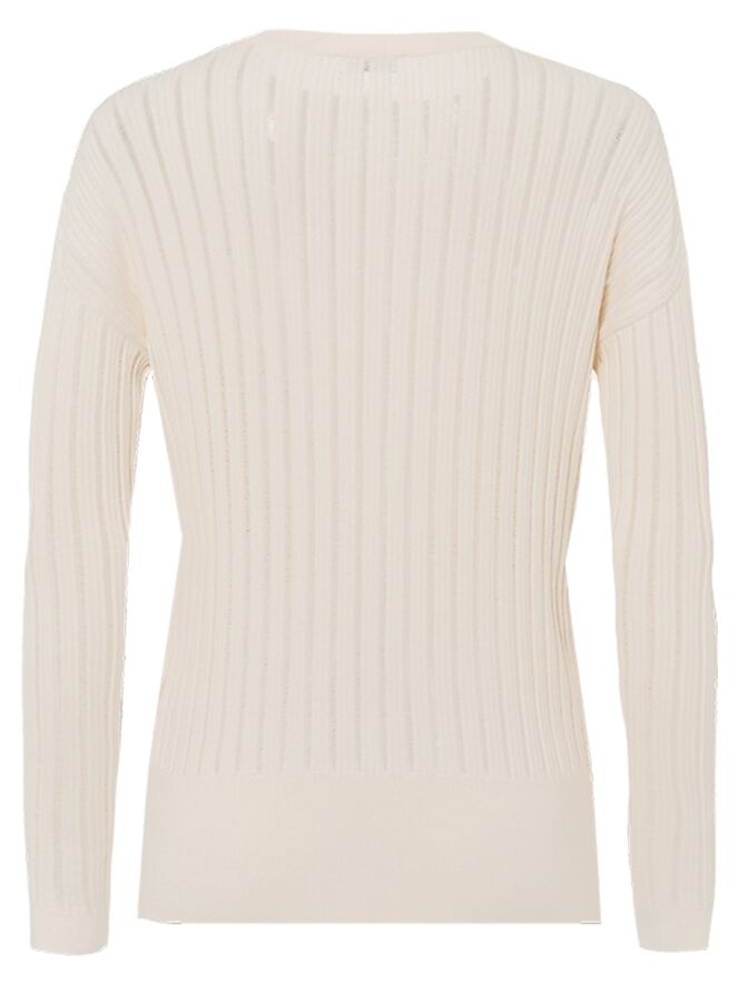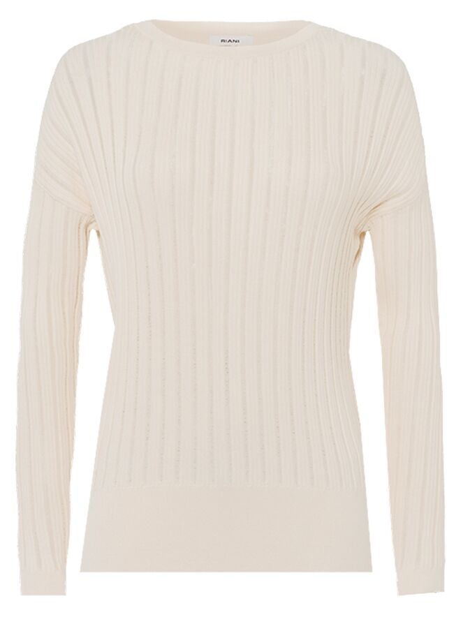 Ein edler Pullover der Designermarke Riani in Beige. Der Pullover kommt mit einem vertikalen, zum Teil durchsichtigen Streifenmuster. Der Pullover hat lange Ärmel und einen runden Halsausschnitt. Der untere Saum ist mit einem breiten Strickbund versehen. Dieser Pullover kann bei 30 Grad in der Waschmaschine gewaschen werden.