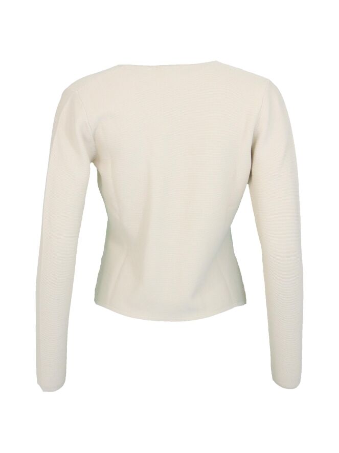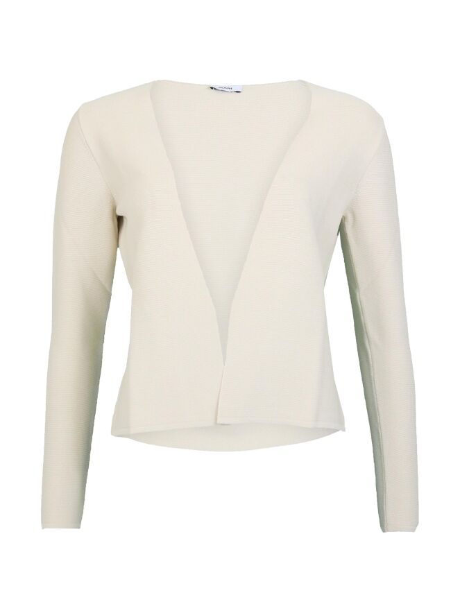 Eine Kurzweste der Designermarke Riani in Beige. Die verschlusslose Weste hat lange Ärmel und kann bei 30 Grad in der Waschmaschine gewaschen werden.