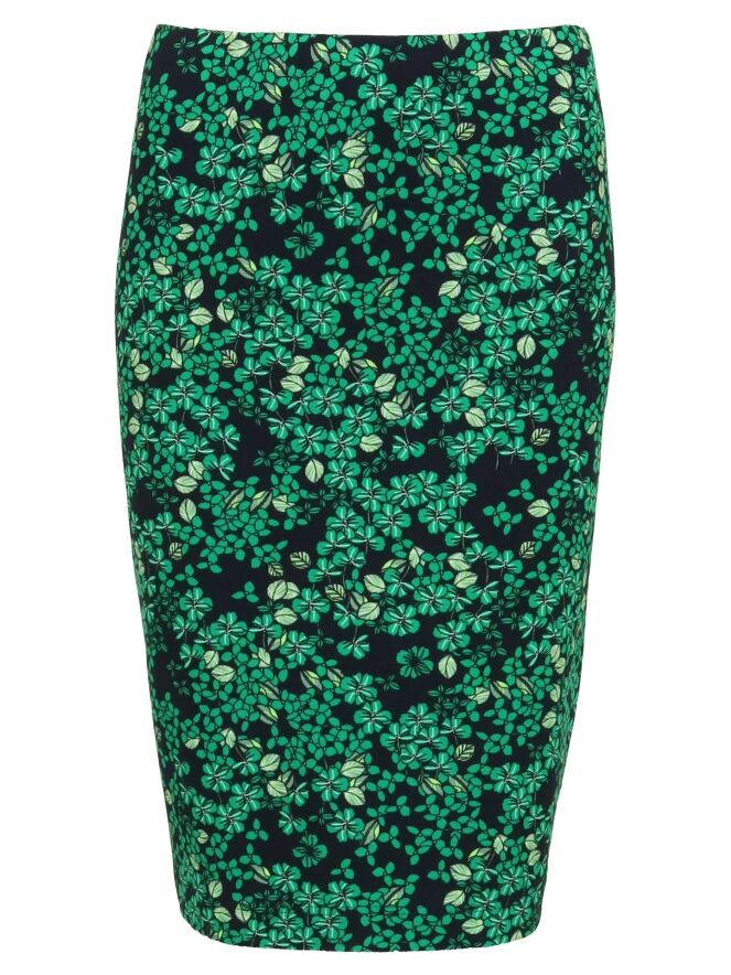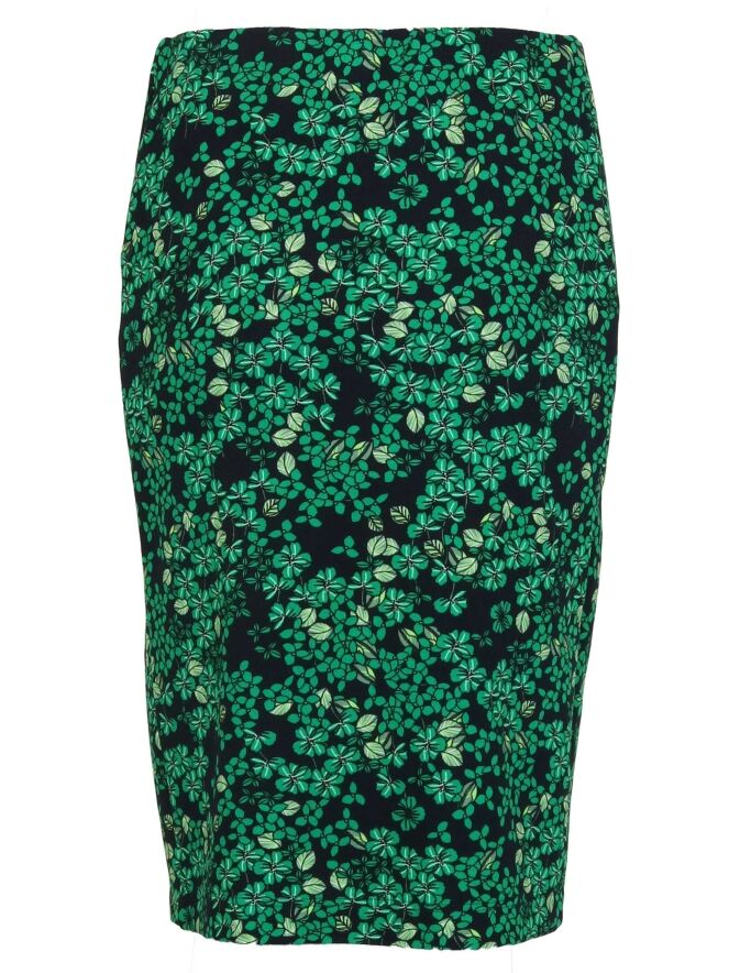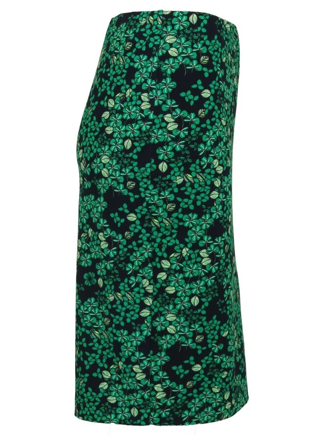 Rock der Designermarke Riani mit Blumenmuster in den Farben Marineblau und Grün. Die Taille ist mit einem breiten, elastischen Bund versehen. Dieser gefütterte Rock reicht bis unter das Knie und sollte nicht gewaschen werden.