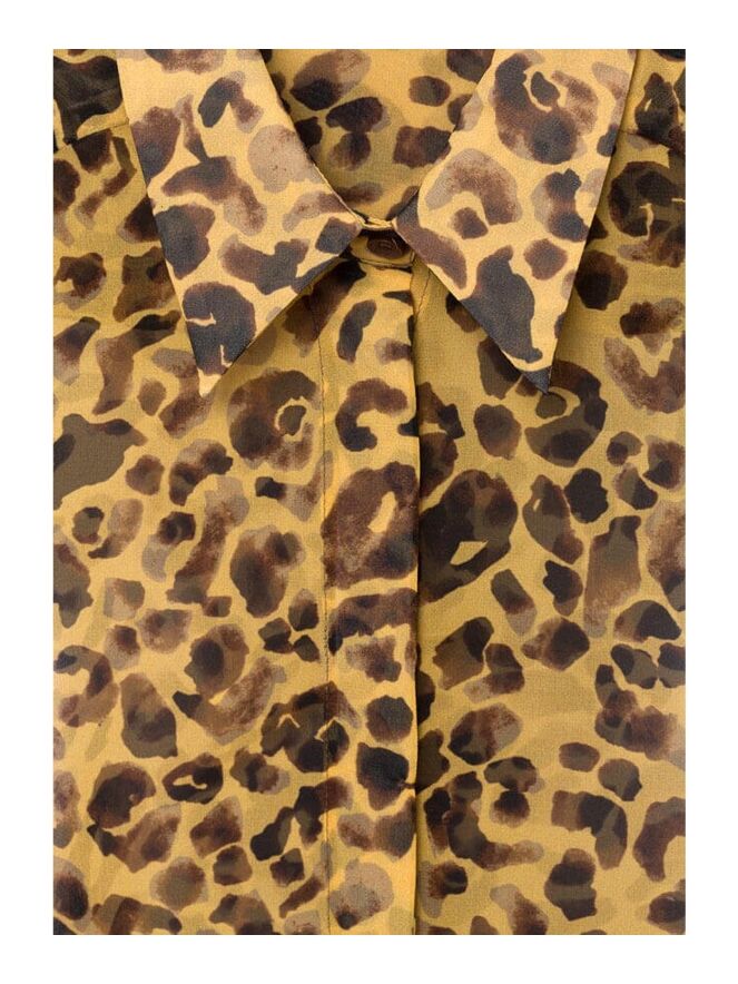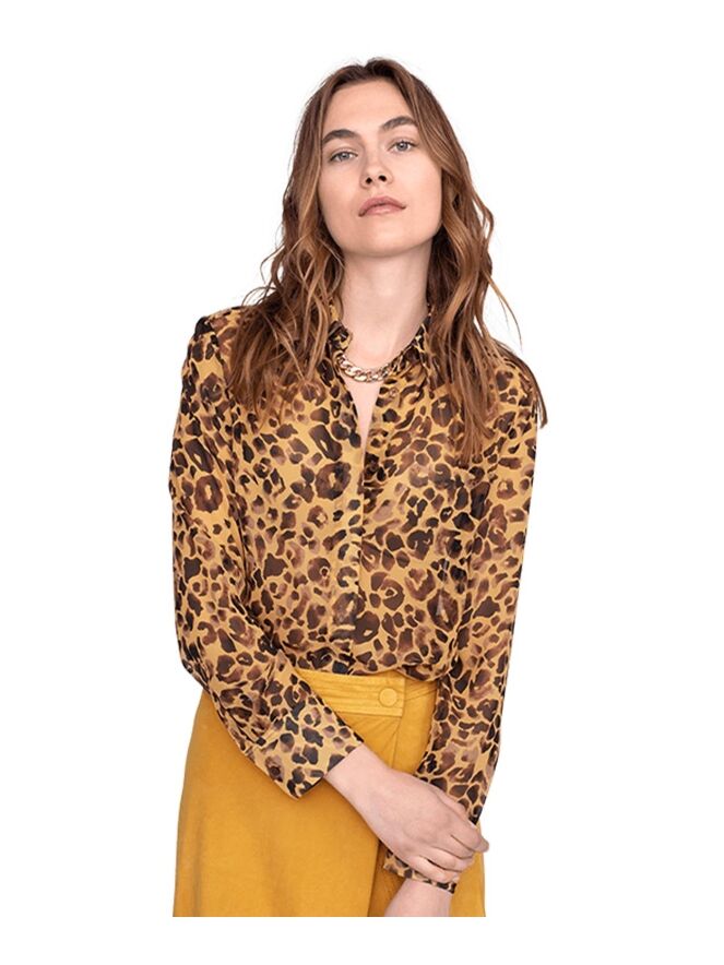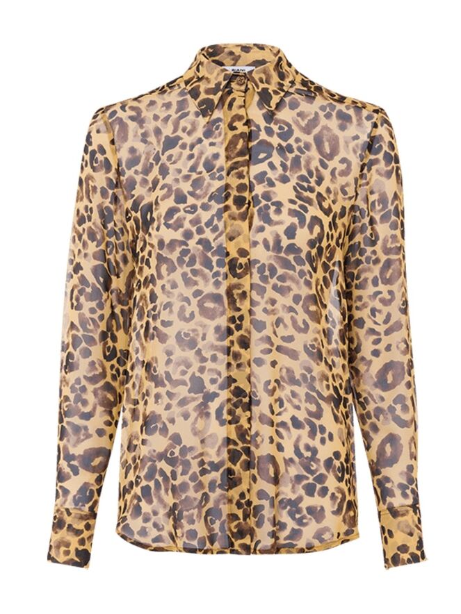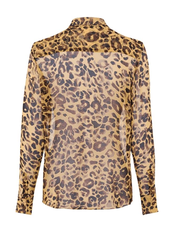 Eine durchsichtige Bluse der Designermode von Riani mit Leopardenmuster in Ockergelb, Schwarz und verschiedenen Brauntönen. Diese Bluse darf von Hand gewaschen werden.