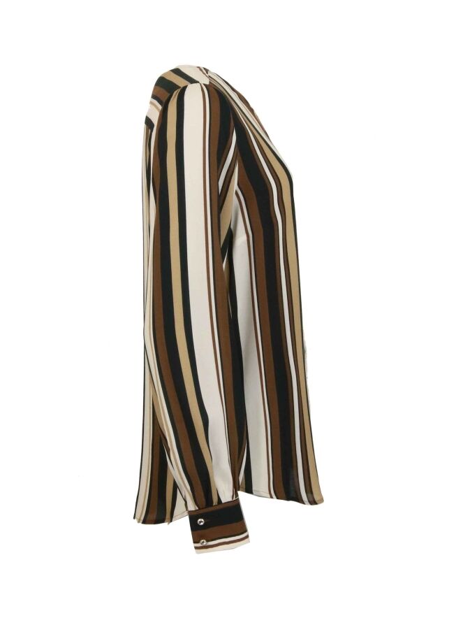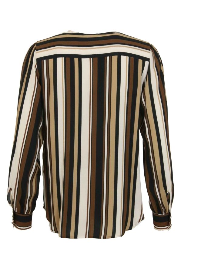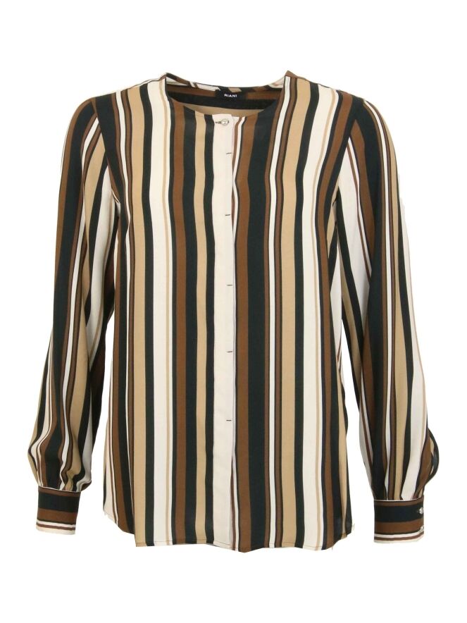 Eine gestreifte Bluse der Designermode von Riani in den Farben Camel, Braun, Vanille und Schwarz. Diese Bluse kann bei 30 Grad in der Waschmaschine gewaschen werden.