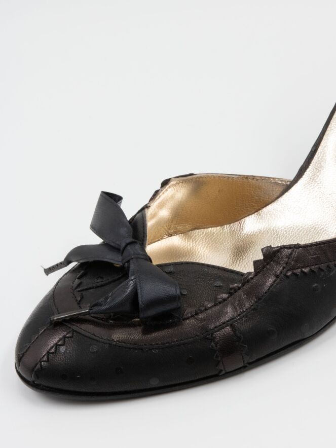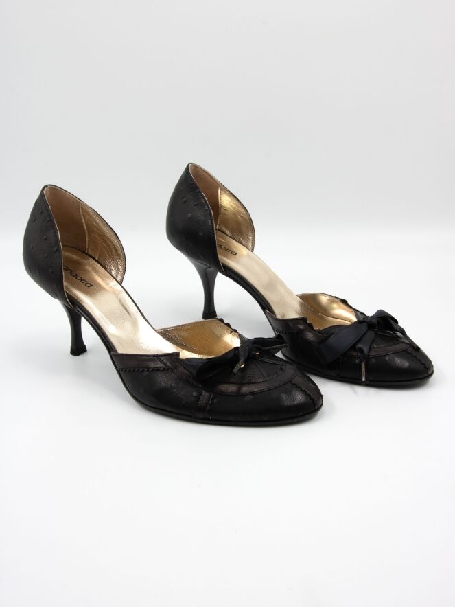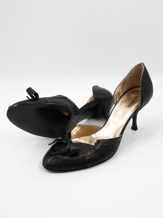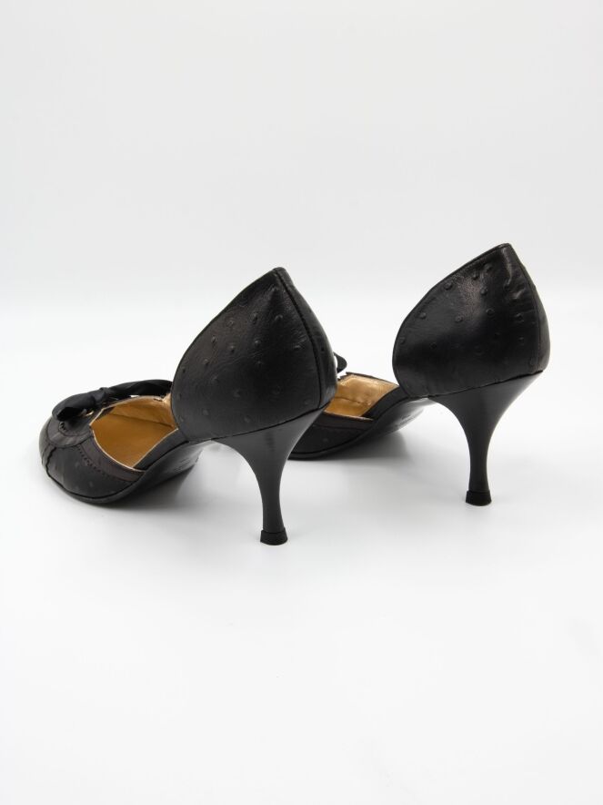 Pumps von Roberto Angelo in Schwarz. Der Schuh ist aus Straußenleder gefertigt. Der Rand am Vorderfuß ist gewellt. Auf dem Vorderfuß befindet sich eine dekorative Schleife. Der Pumps hat einen Queenie-Absatz und ein ledergefüttertes Innenfutter.