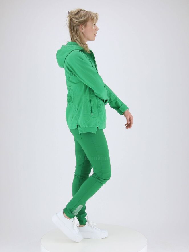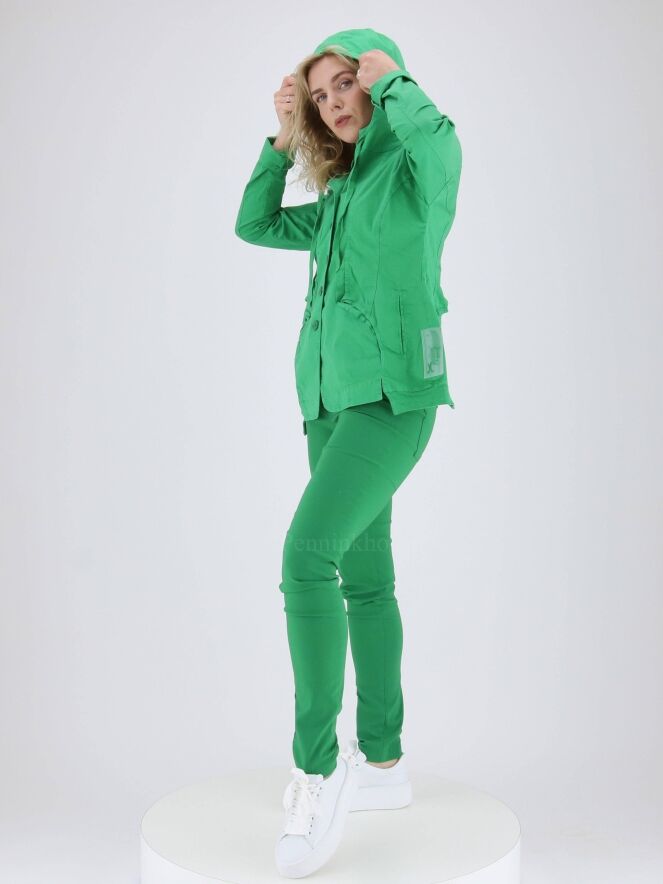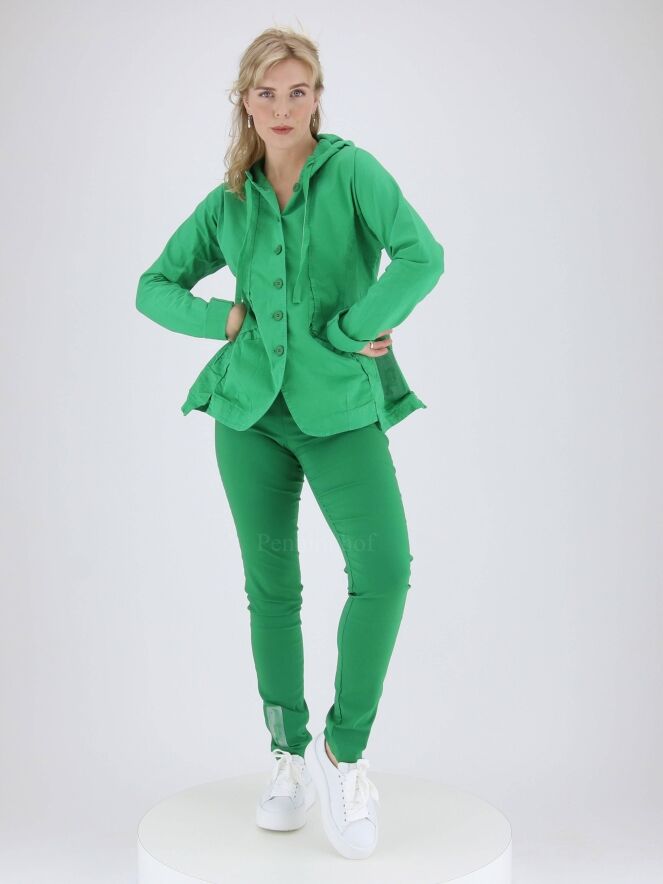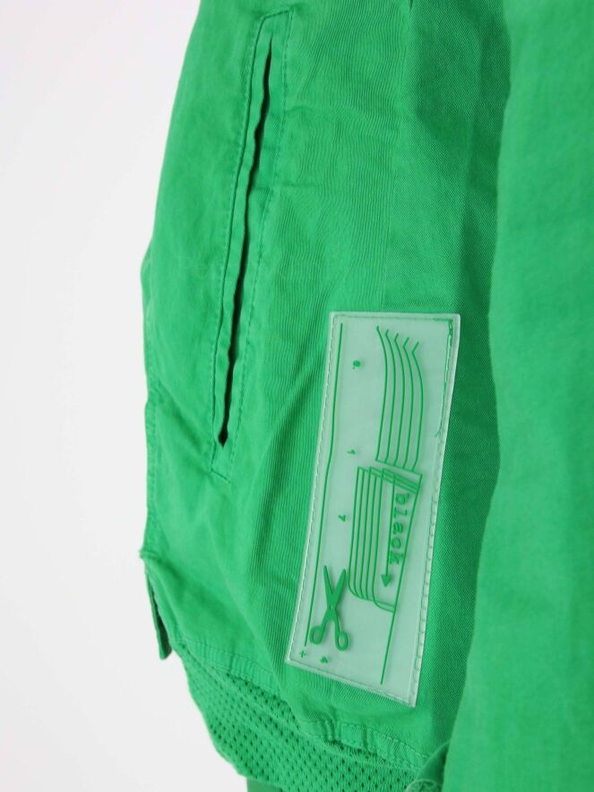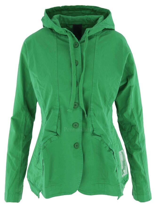 Ein grüner Blazer der Designermarke Rundholz Black Label. Der Blazer wird mit sechs Knöpfen geschlossen. Unten am Rücken befindet sich ein breiter perforierter Besatz. Der Blazer ist ab der Taille weit geschnitten und mit Eingriffstaschen versehen. Der Blazer ist nicht gefüttert und kann bei 30 Grad gewaschen werden.