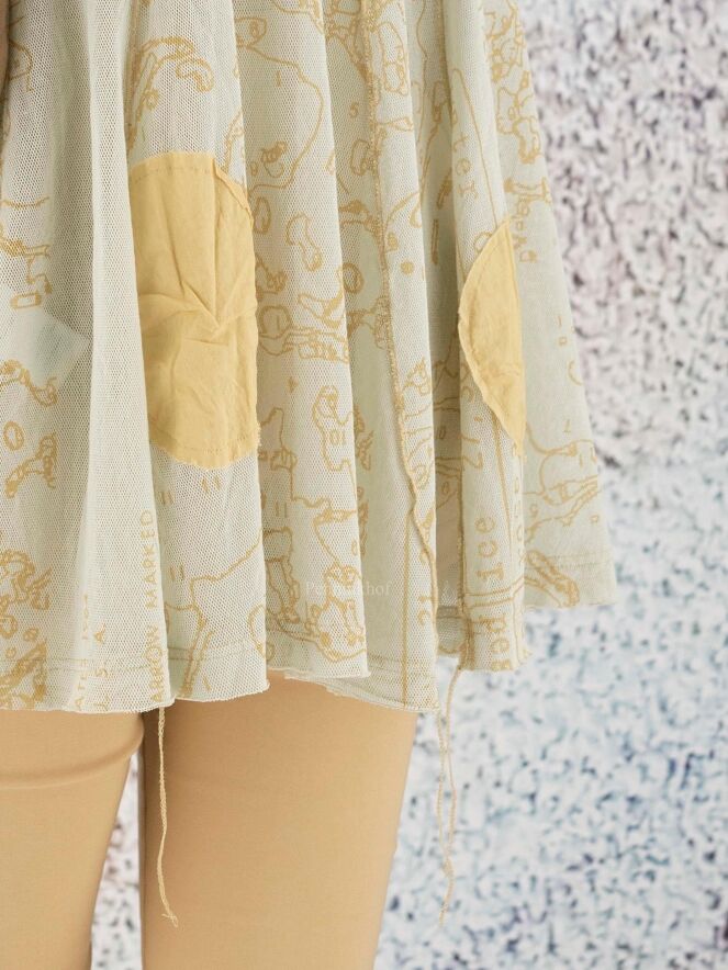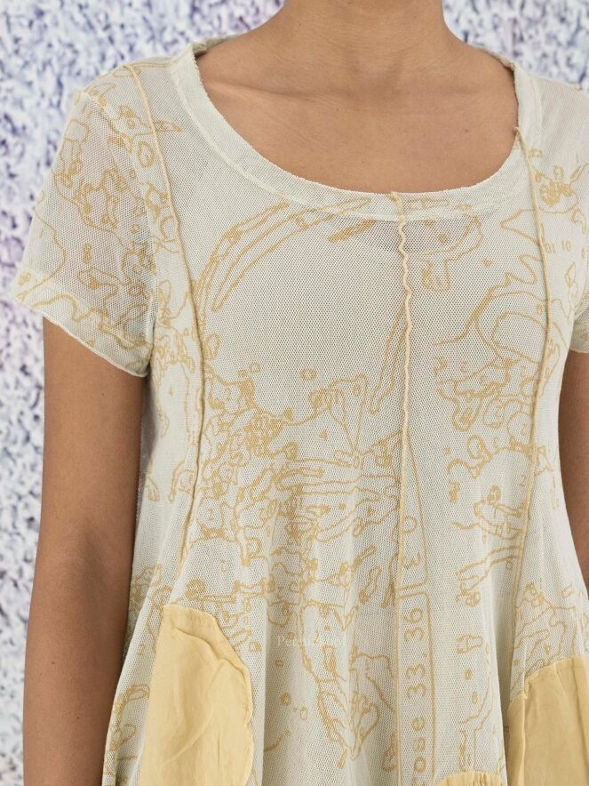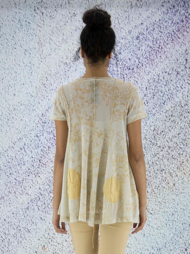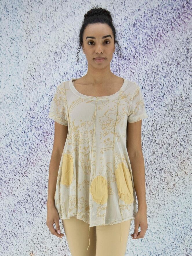 Ein leicht transparentes Shirt der Designermarke Rundholz Black Label mit grafischem Print mit Kugeln in verschiedenen Größen in mehreren Tönen Ockergelb. Das Kurzarmshirt hat einen Rundhalsausschnitt. Am unteren Saum befinden sich dekorative lose Fäden Dieses Shirt kann bei 30 Grad gewaschen werden.