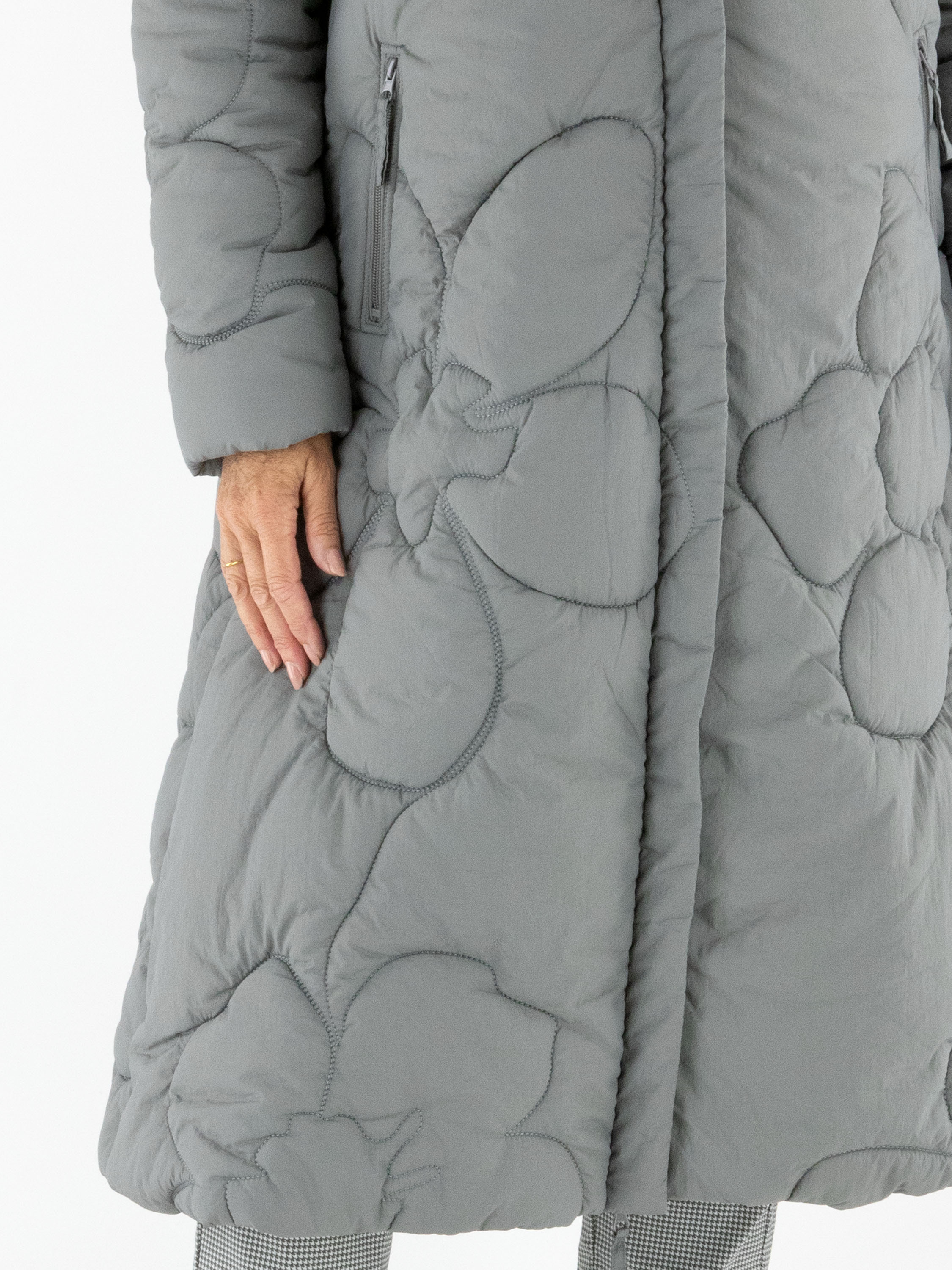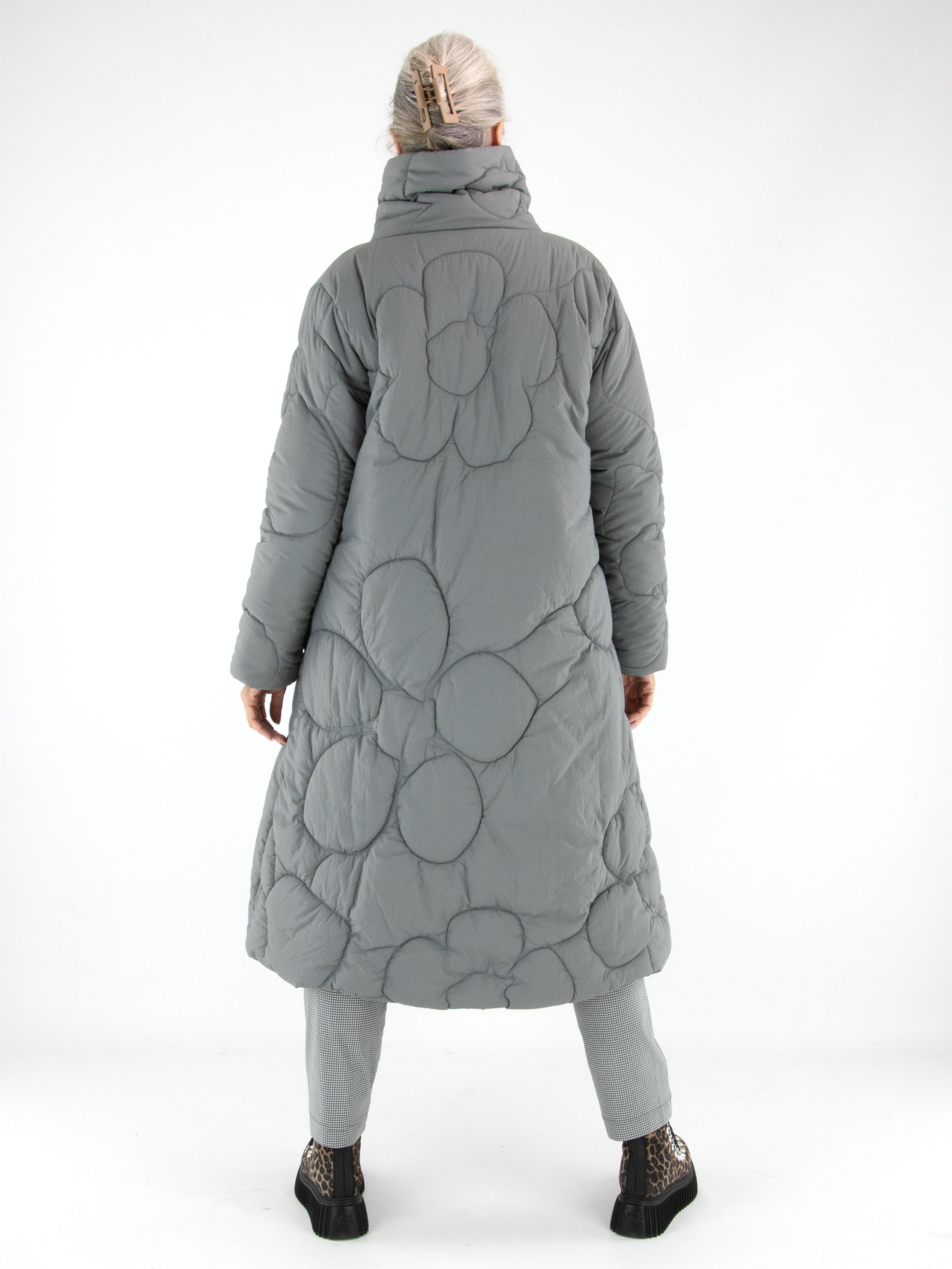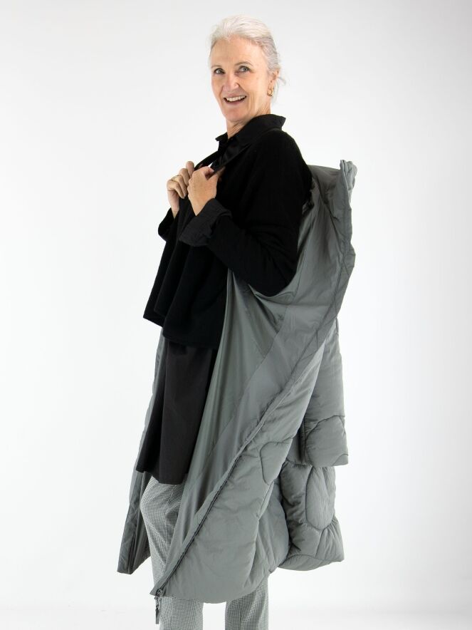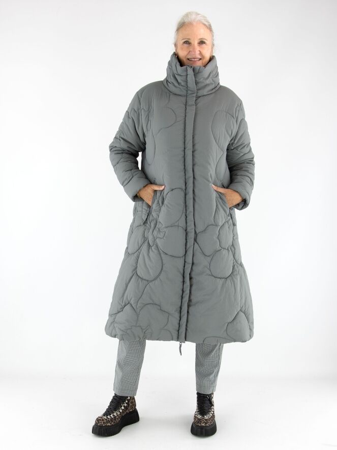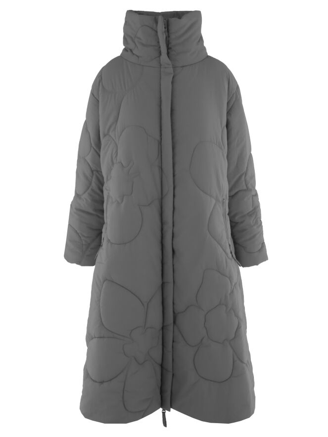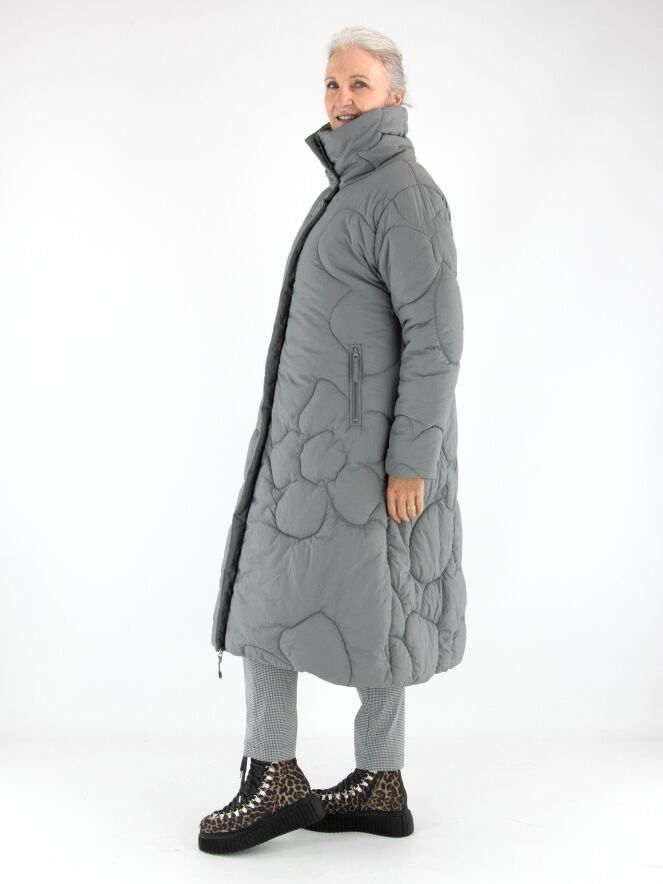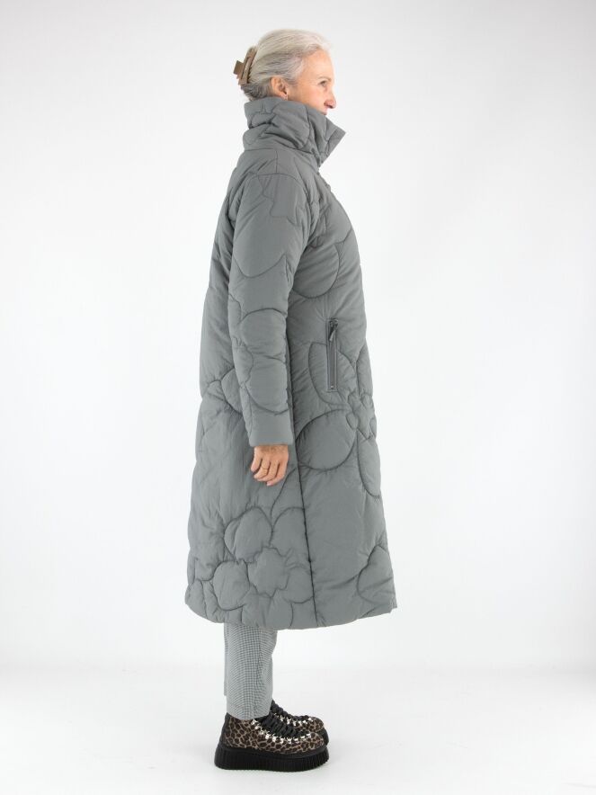 Ein langer Mantel von Rundholz Black Label in Grau. Der Mantel ist in einem Blumenmuster gesteppt. Die Seitentaschen sind mit Reißverschlüssen versehen, und auch der Verschluss des Mantels ist in Grau gearbeitet. Dieser Mantel kann bei 30 Grad gewaschen werden.