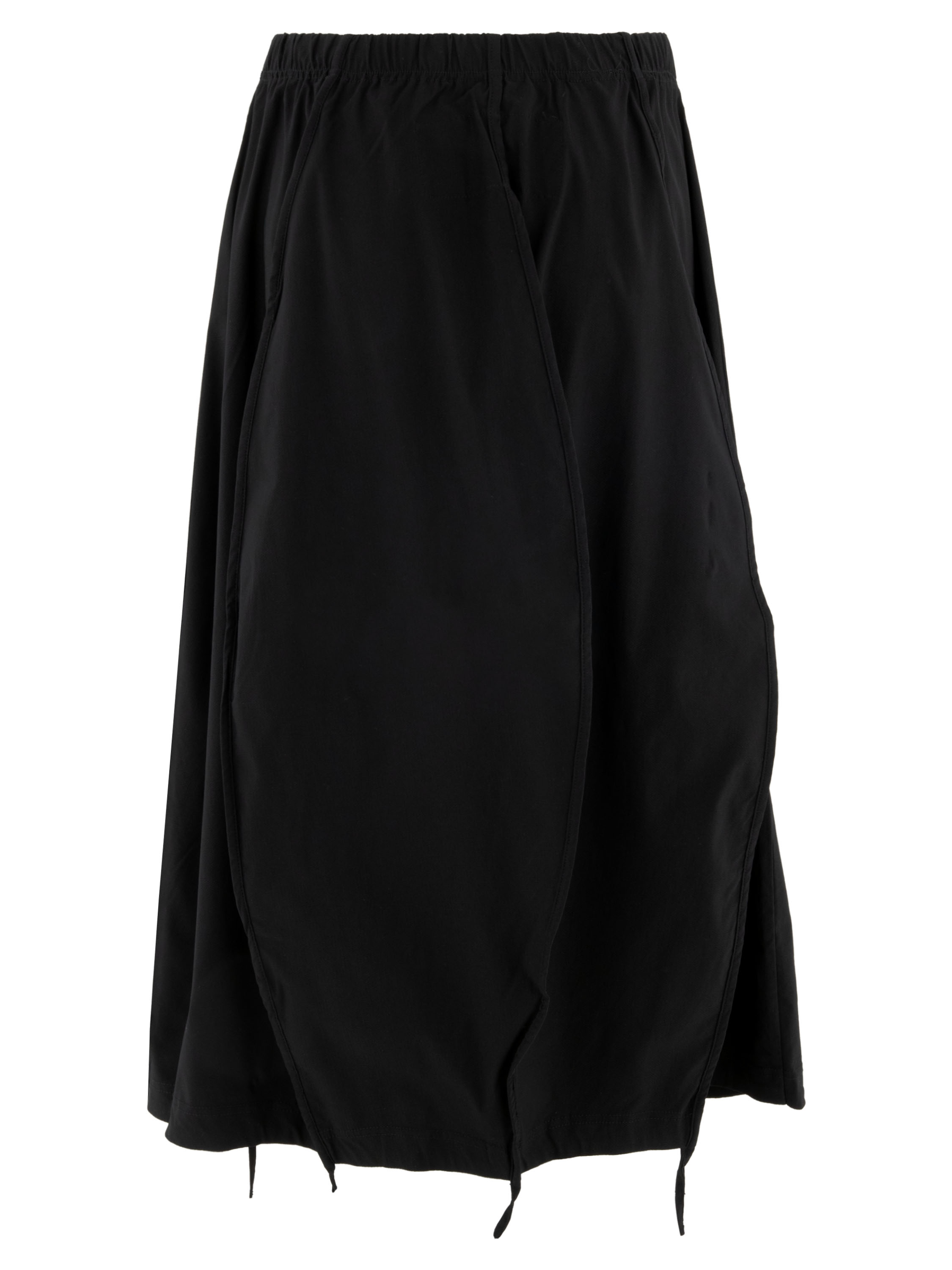 Rock von Rundholz Black Label in Schwarz. Ein fein gefältelter elastischer Bund sorgt für angenehmen Tragekomfort und eine dezente, feminine Passform. Nach unten hin entwickelt der Rock eine leichte Ballonform. Sowohl vorne als auch hinten sind drei umgekehrte Nähte mit Biesen verarbeitet, wobei ein kurzer Abschnitt unter dem Saum als dezentes Banddetail sichtbar wird. Direkt unter dem Bund befinden sich Eingrifftaschen. Der Rock ist ungefüttert und kann bei 30 Grad gewaschen werden.