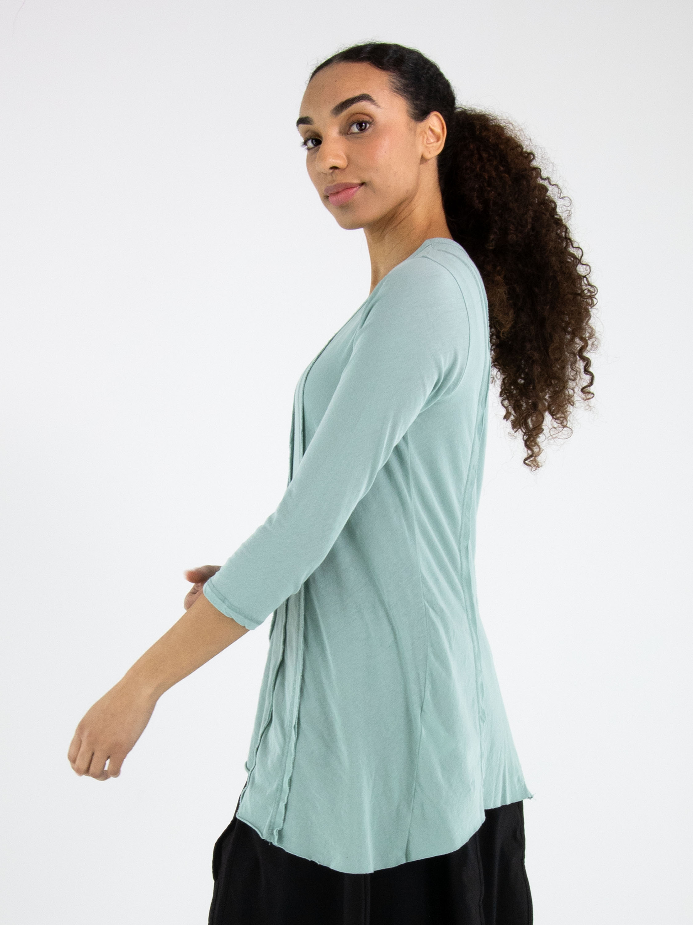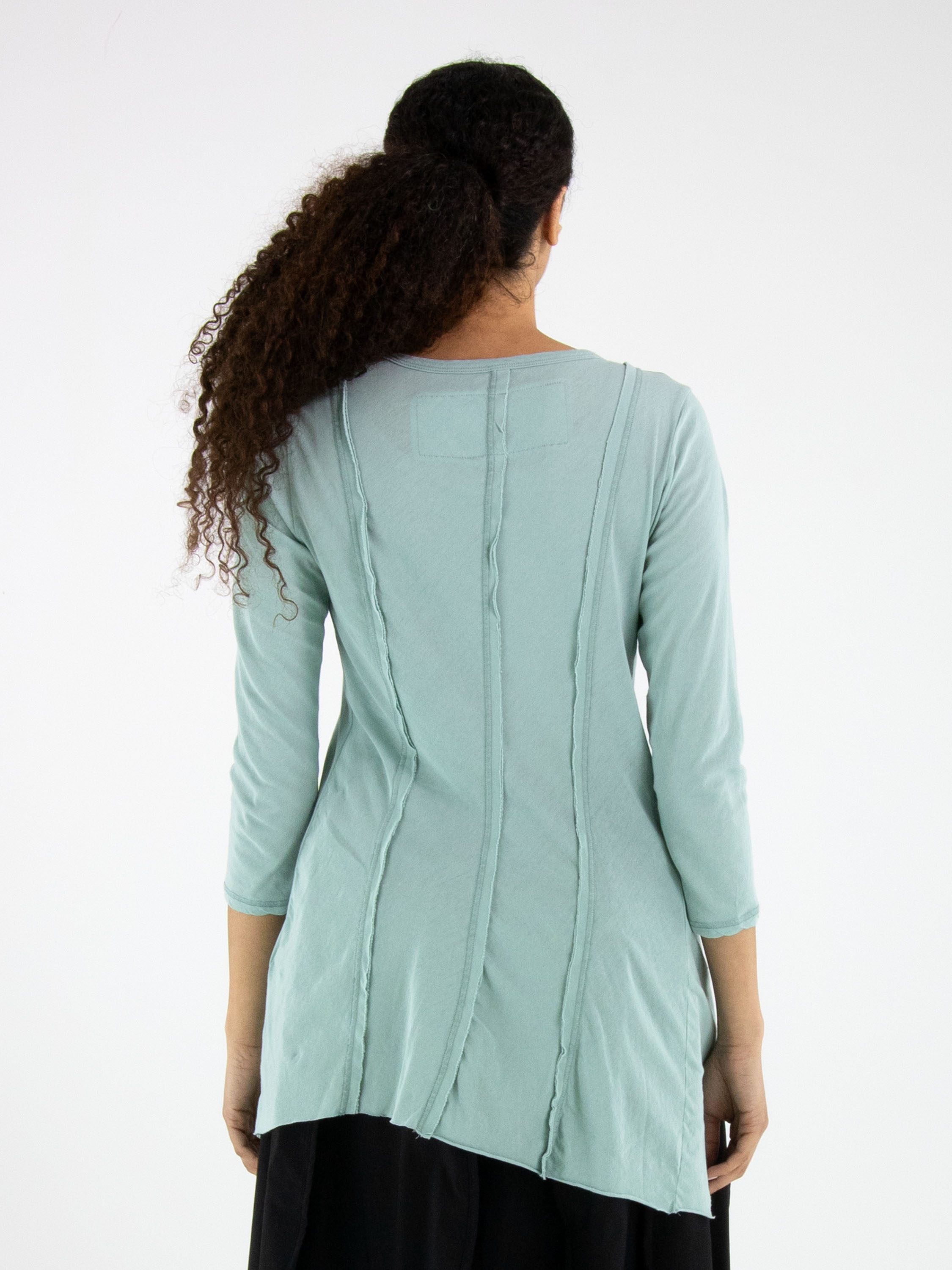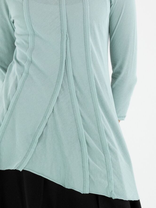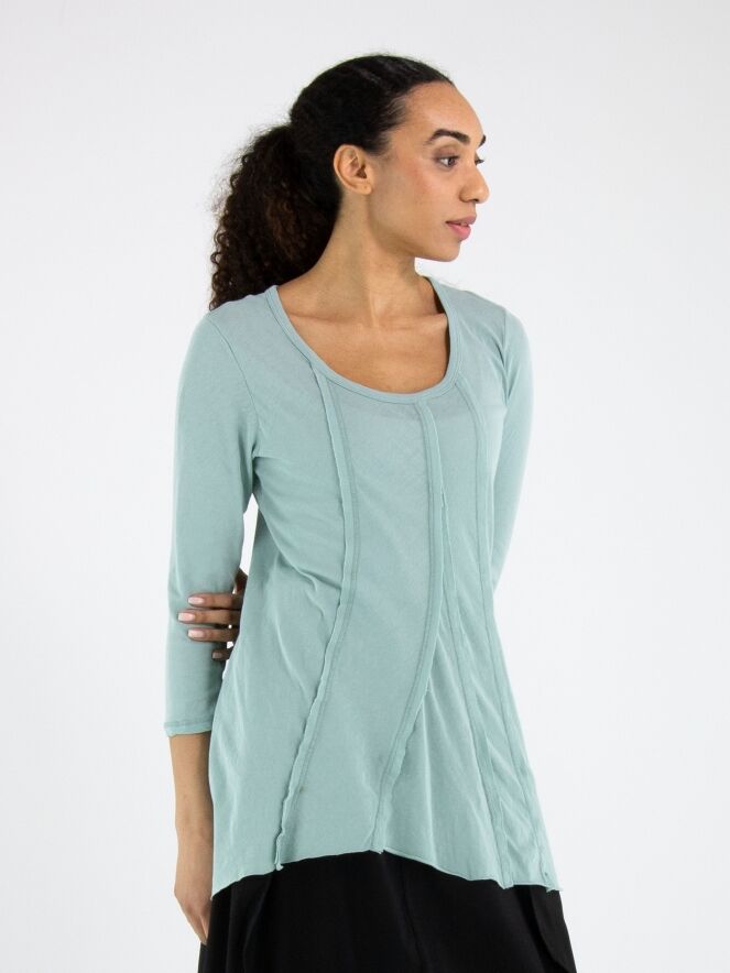 Schmal geschnittenes Shirt von Rundholz Black Label in einem zarten pastellmintgrünen Ton. Sowohl vorne als auch hinten sind drei umgekehrte Nähte eingearbeitet, die dem Design einen dezenten, modernen Akzent verleihen. Das Shirt verfügt über einen Rundhalsausschnitt und halblange Ärmel. Dieses exklusive Designershirt kann bei 30 Grad gewaschen werden.