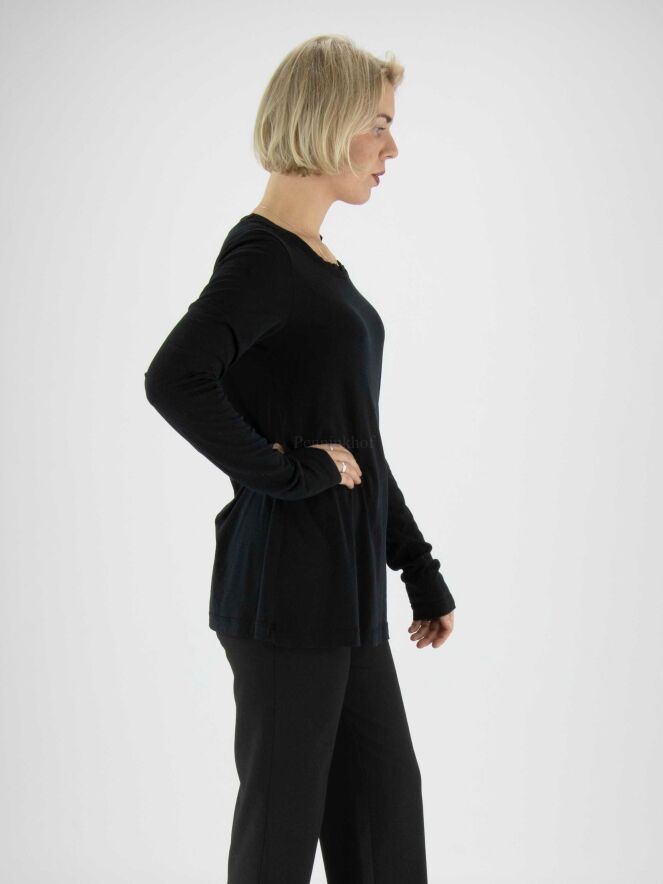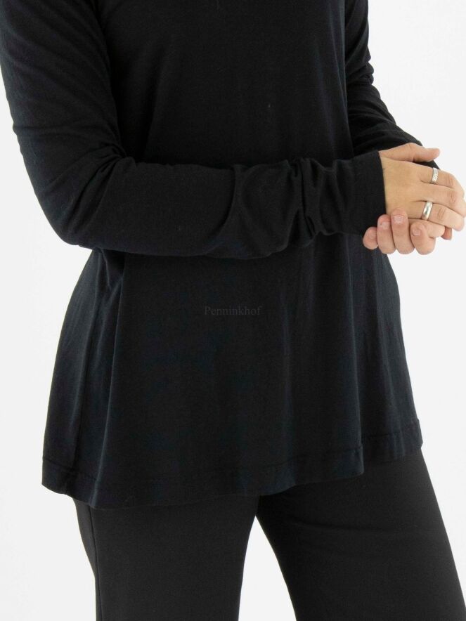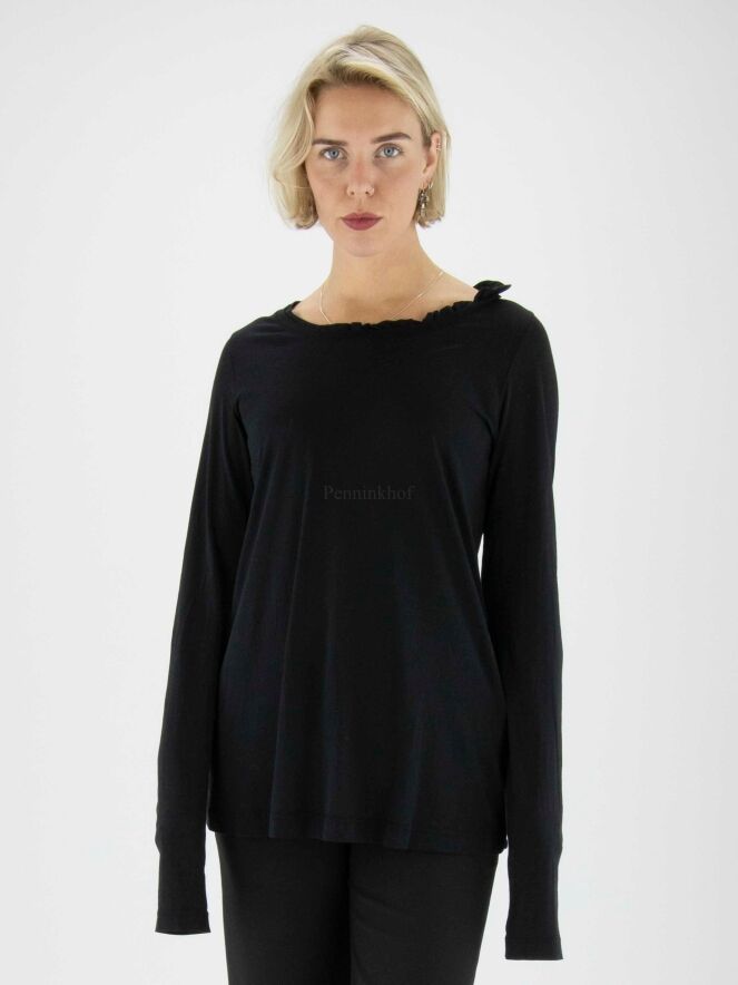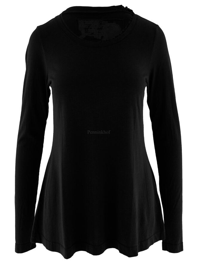 Ein Shirt von Rundholz black label in der Farbe schwarz. Entlang der Kante des Rundhalsausschnitts befindet sich teilweise eine feine Faltenborte. Das Shirt hat lange Ärmel und kann bei 30 Grad gewaschen werden.