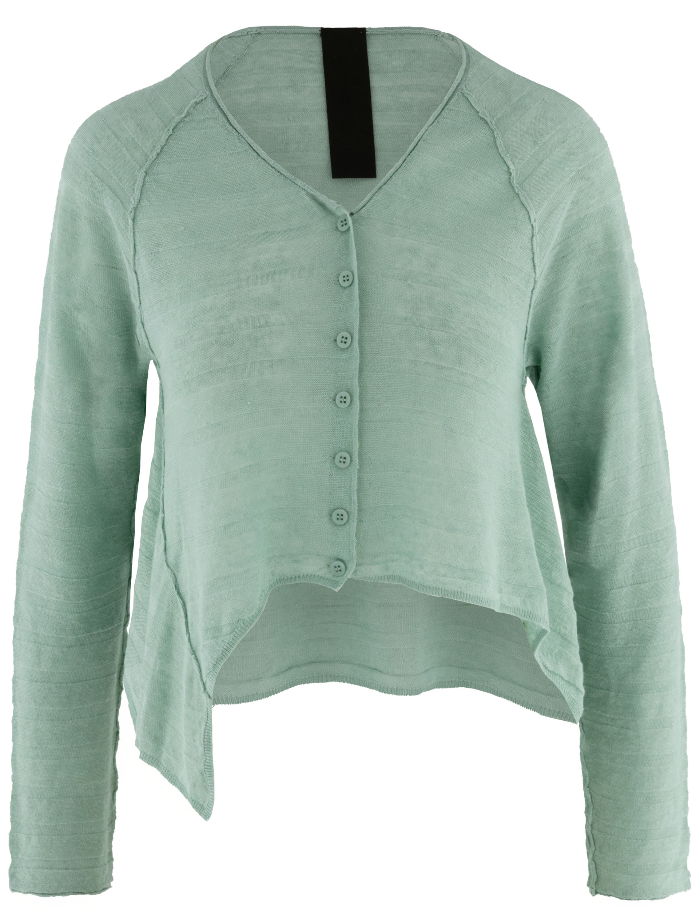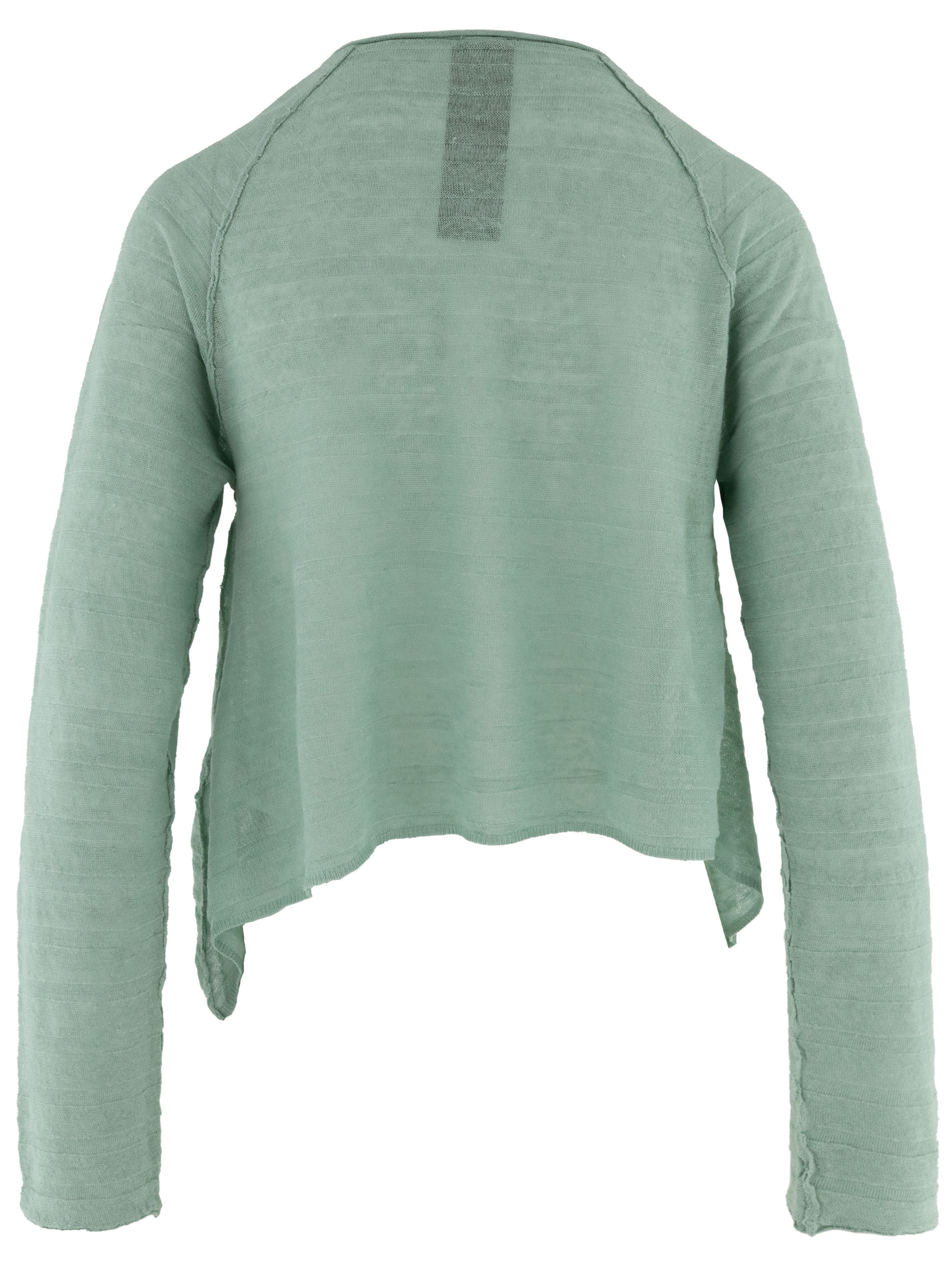 Kurze, leicht transparente Strickjacke von Rundholz Black Label in einem frischen Mintgrün. Der Stoff weist eine dezente Streifenstruktur auf und verleiht dem Design eine moderne, elegante Note. Am Saum sind die Seiten etwas länger als das Mittelteil, wodurch eine spielerische, zeitgemäße Silhouette entsteht. Dieses exklusive Designervest kann bei 30 Grad gewaschen werden.